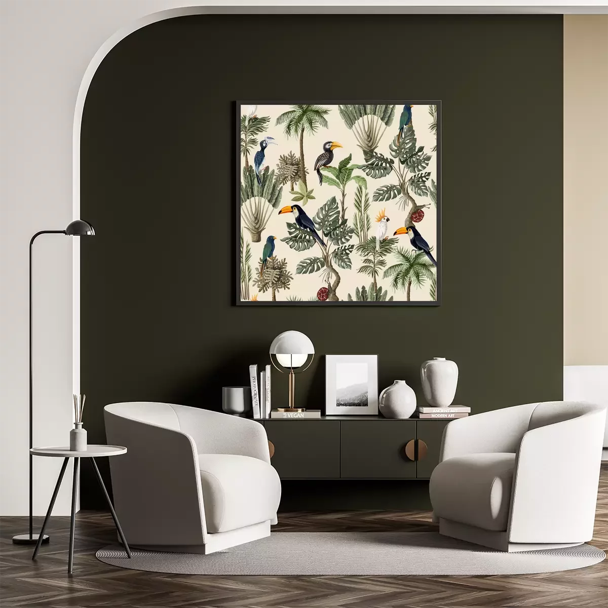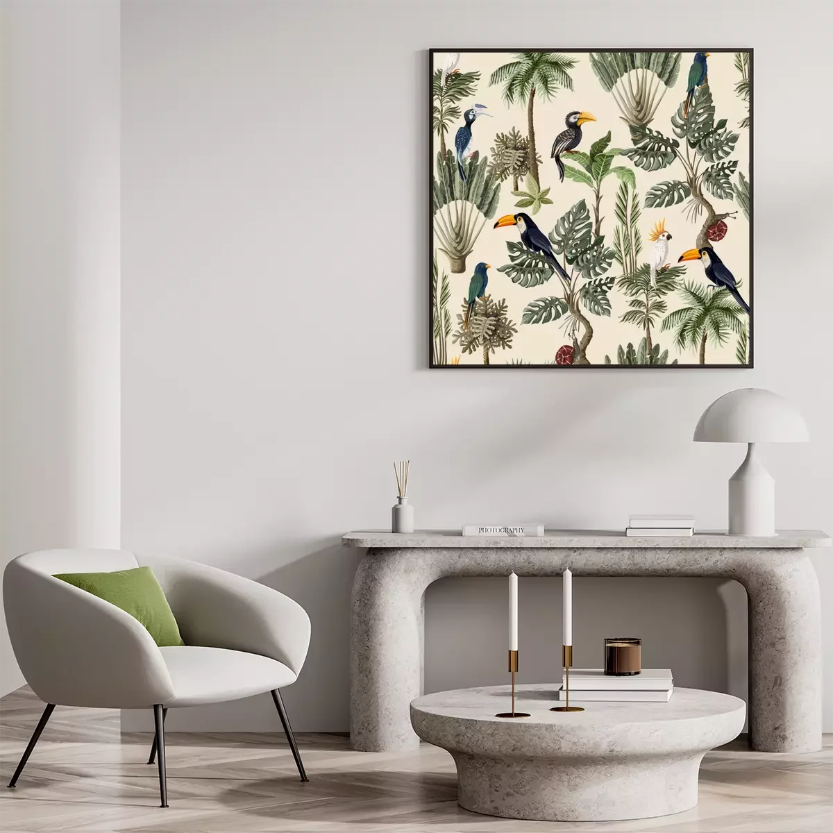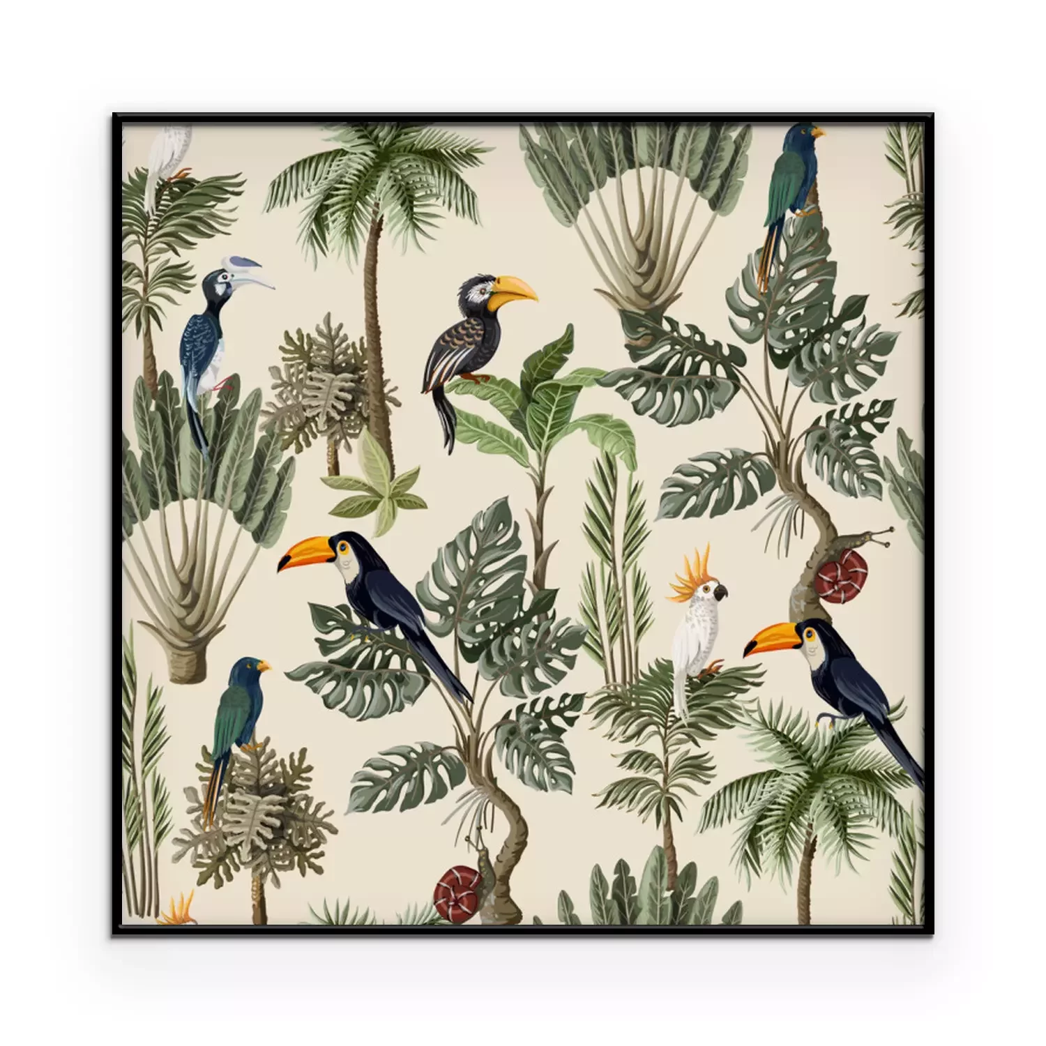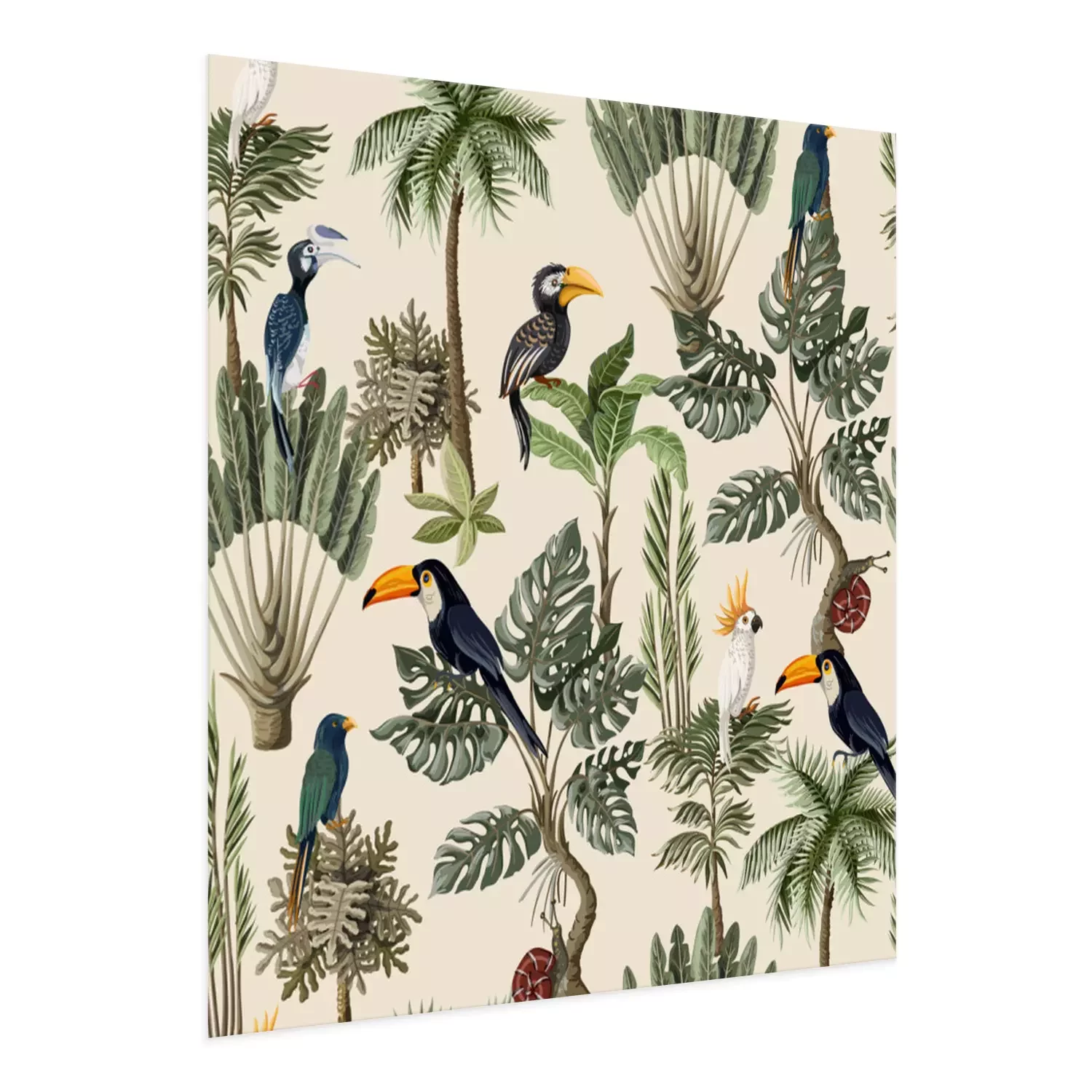 Nahtloses Muster mit exotischen Bäumen und Tieren. Vintage Vintage Tapete