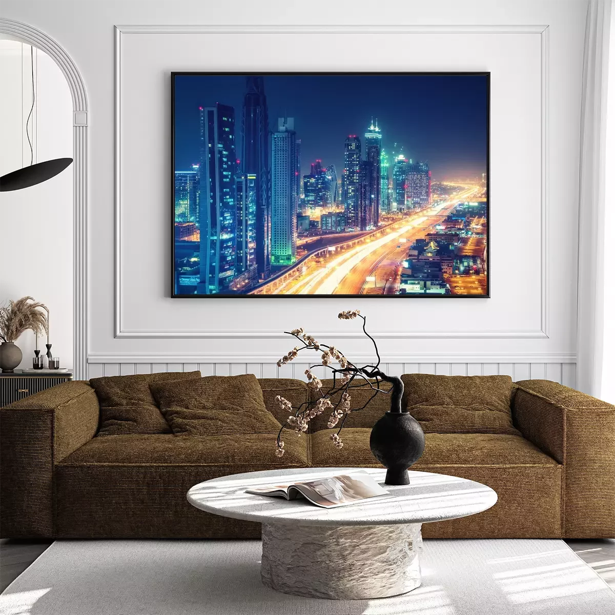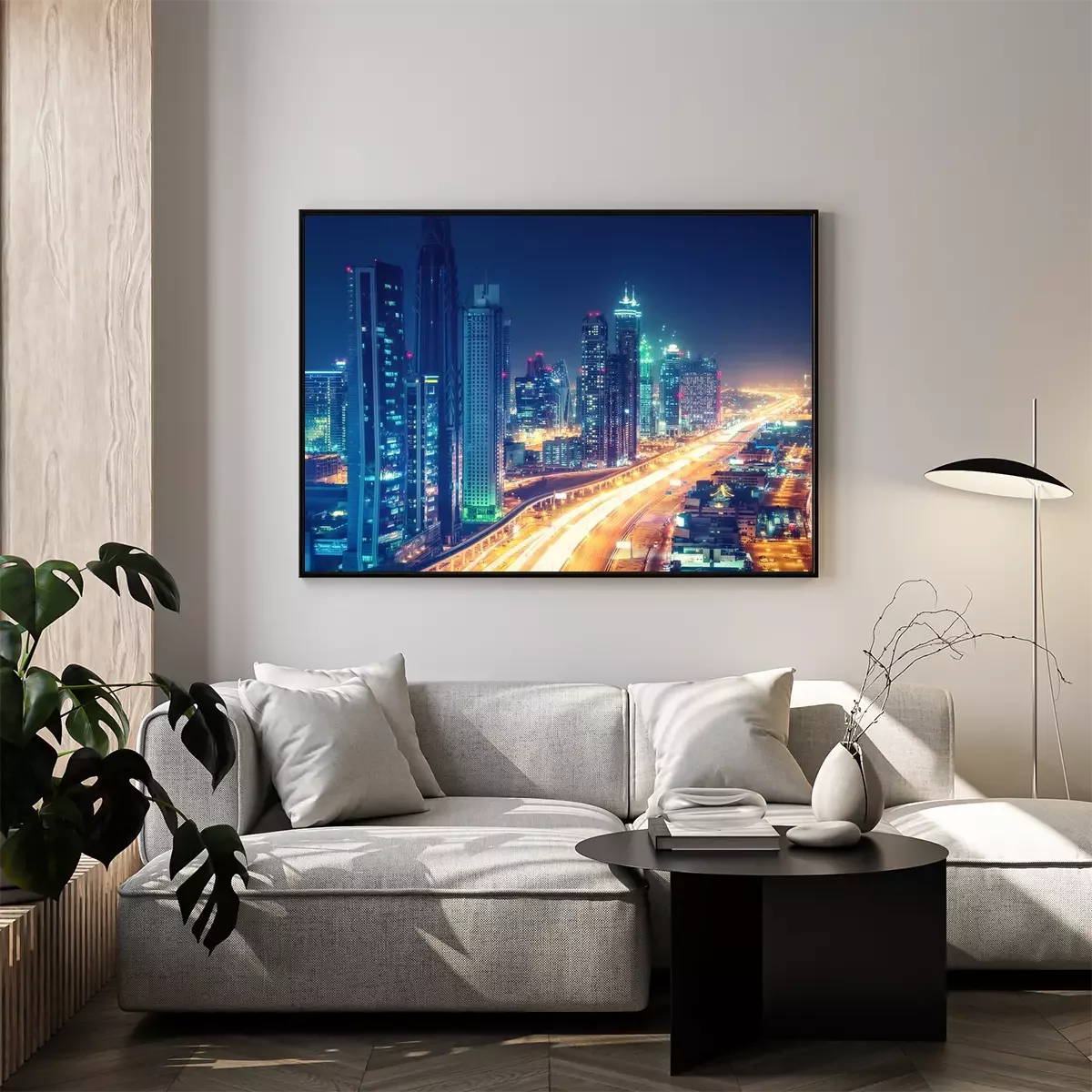 Poster: Dubais beleuchtete Straße und hohe Gebäude