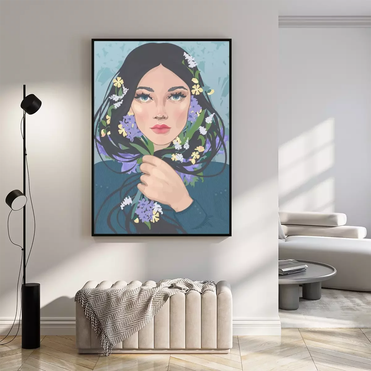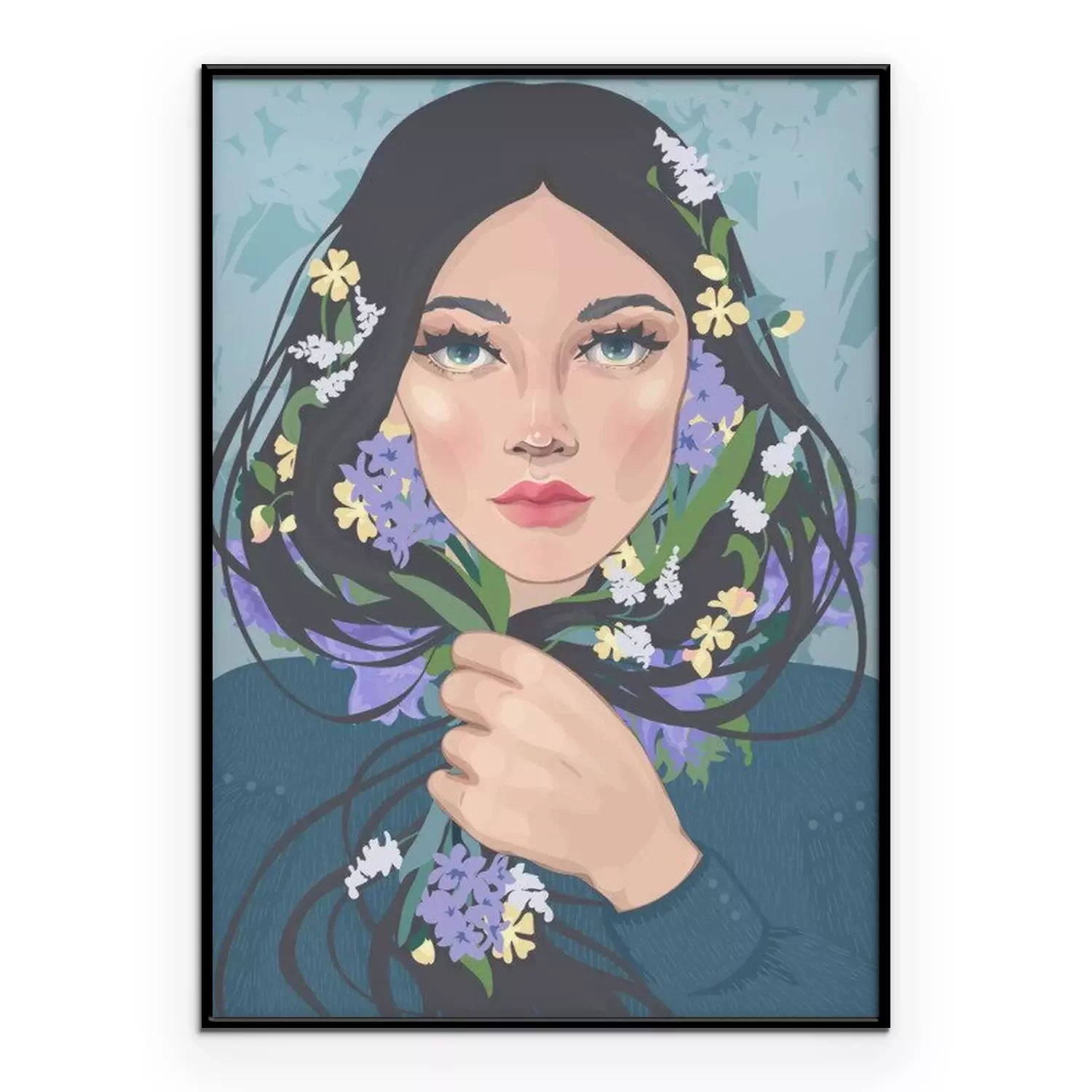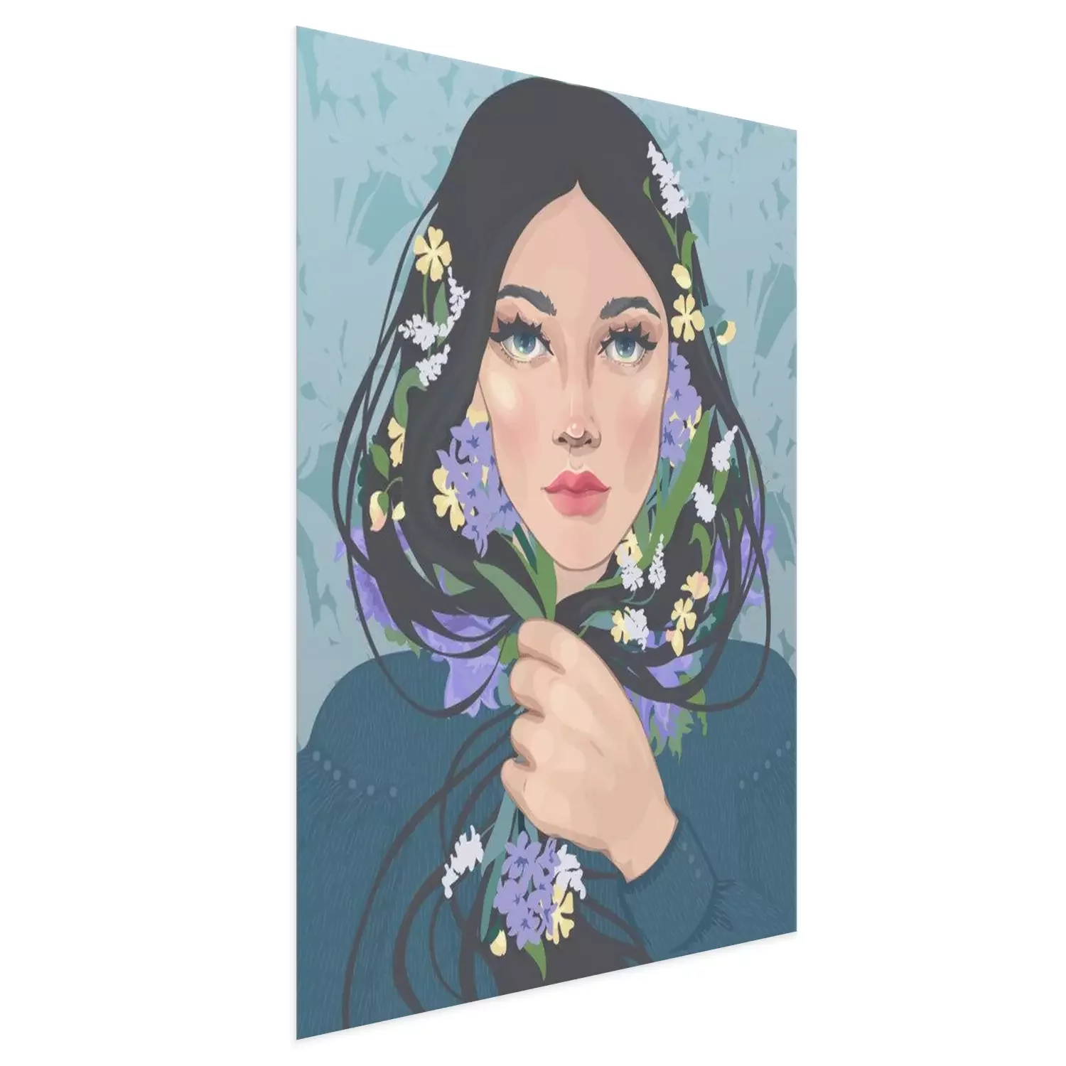 Poster: Dunkelhaarige Frau mit bunten Blumen im Haar