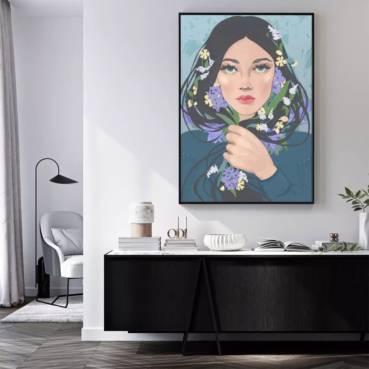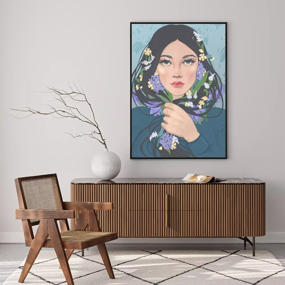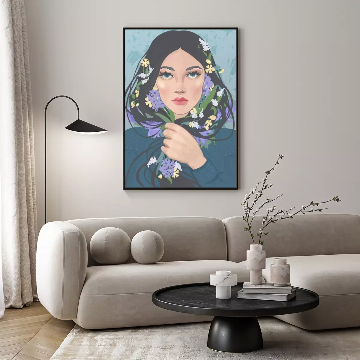 Poster: Dunkelhaarige Frau mit bunten Blumen im Haar