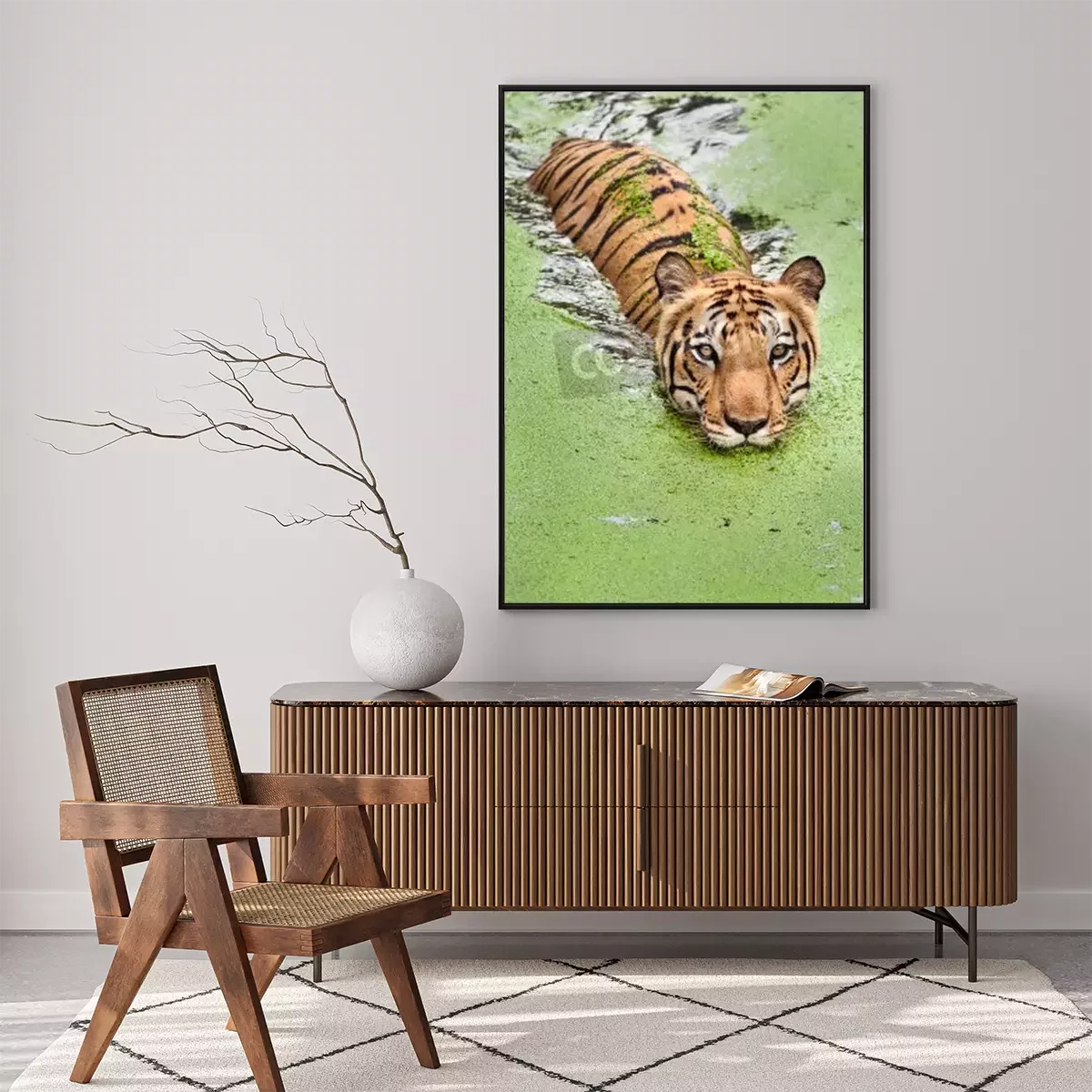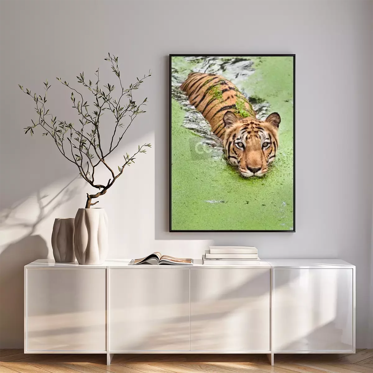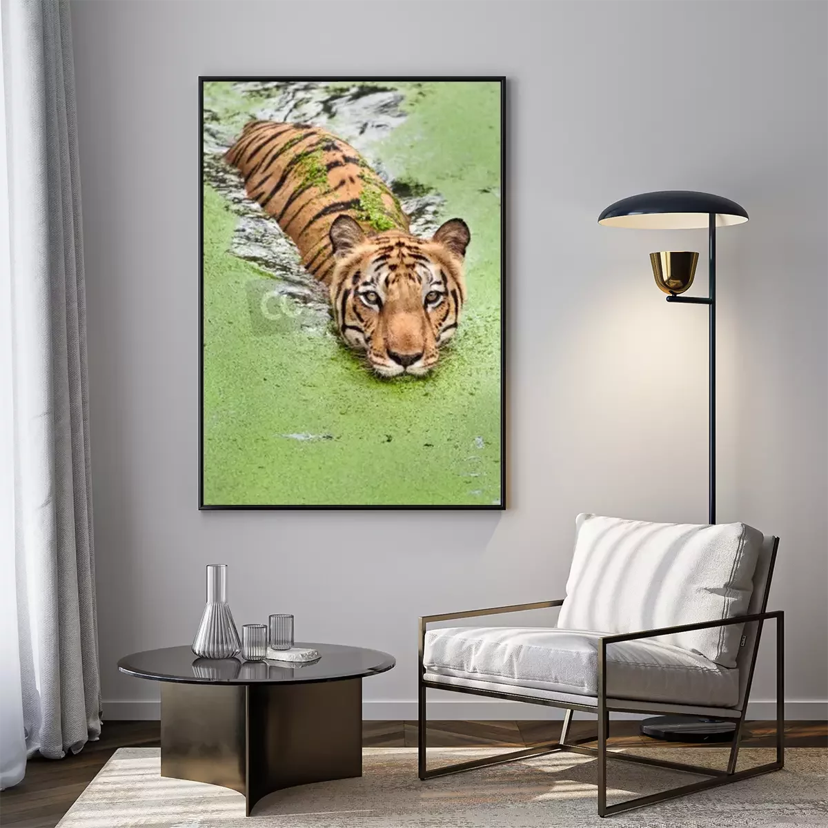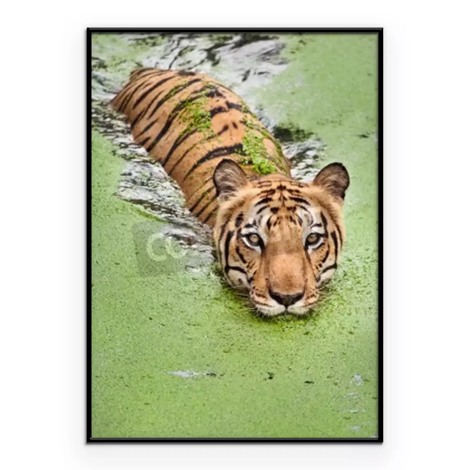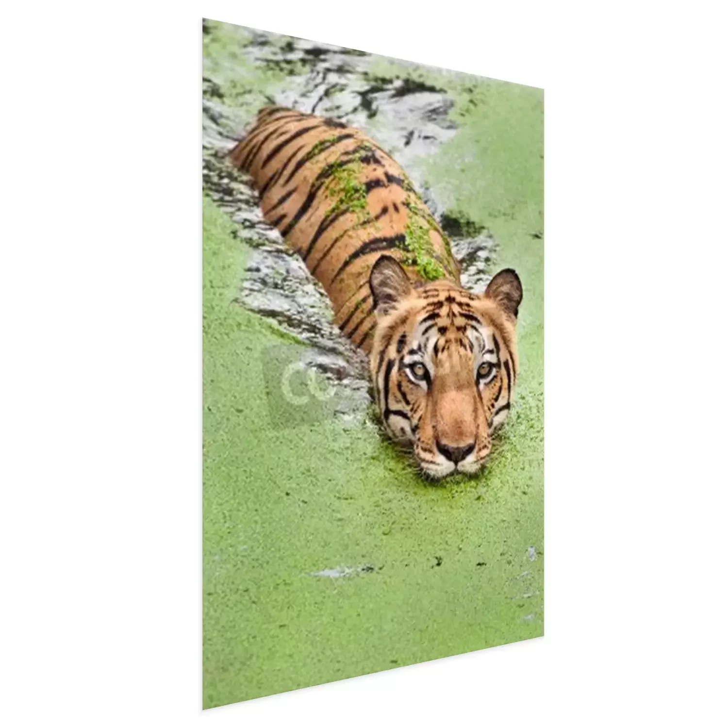Poster: Durch sumpfiges wasser schwimmender tiger