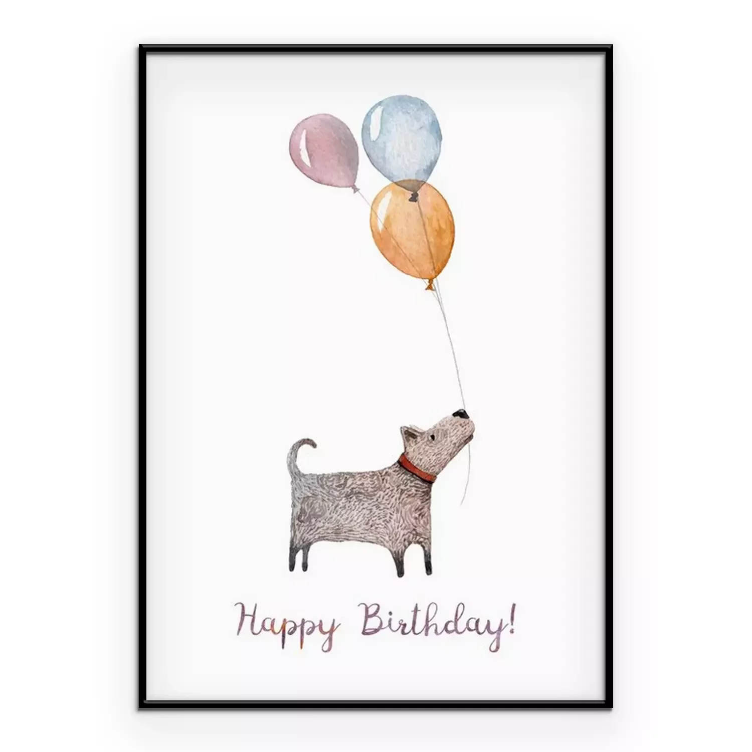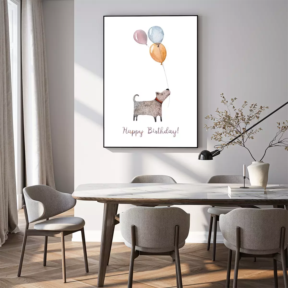 Eine Aquarell-Illustration eines kleinen Hundes hält eine Reihe von Ballons, zu Fuß in einer Altstadt auf dem Hintergrund erscheinen.
