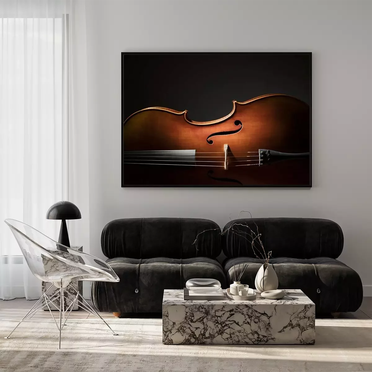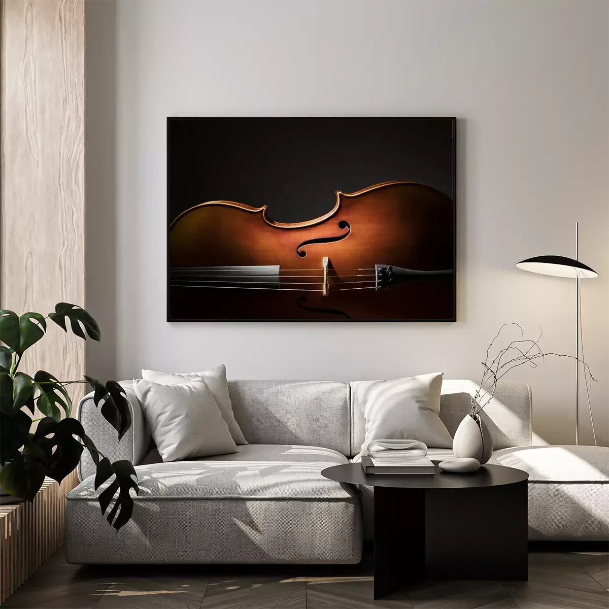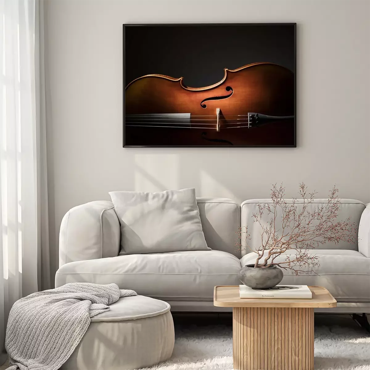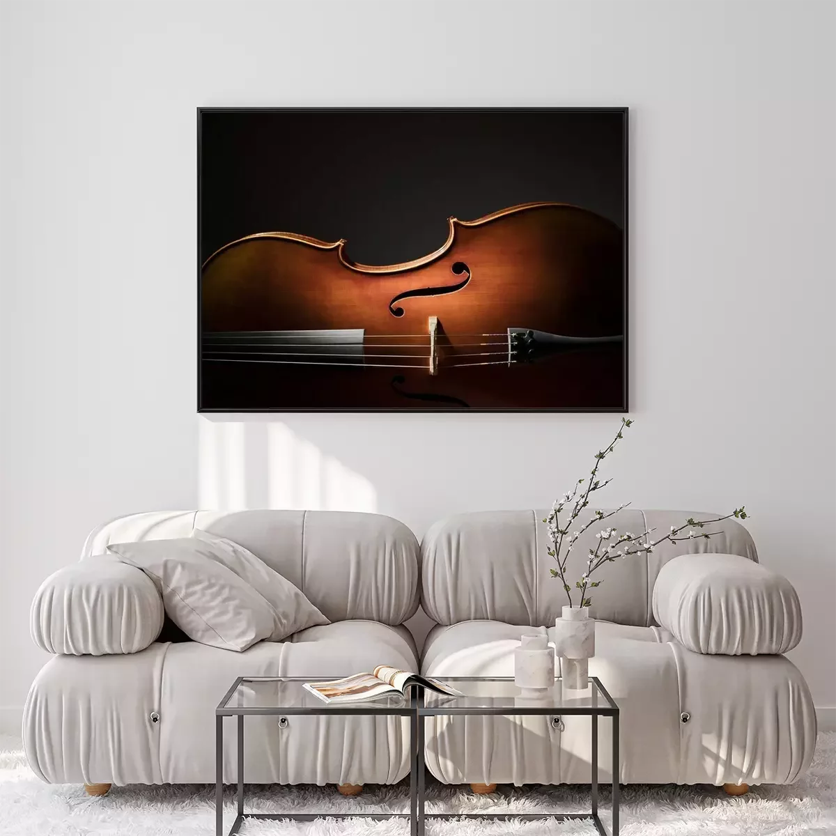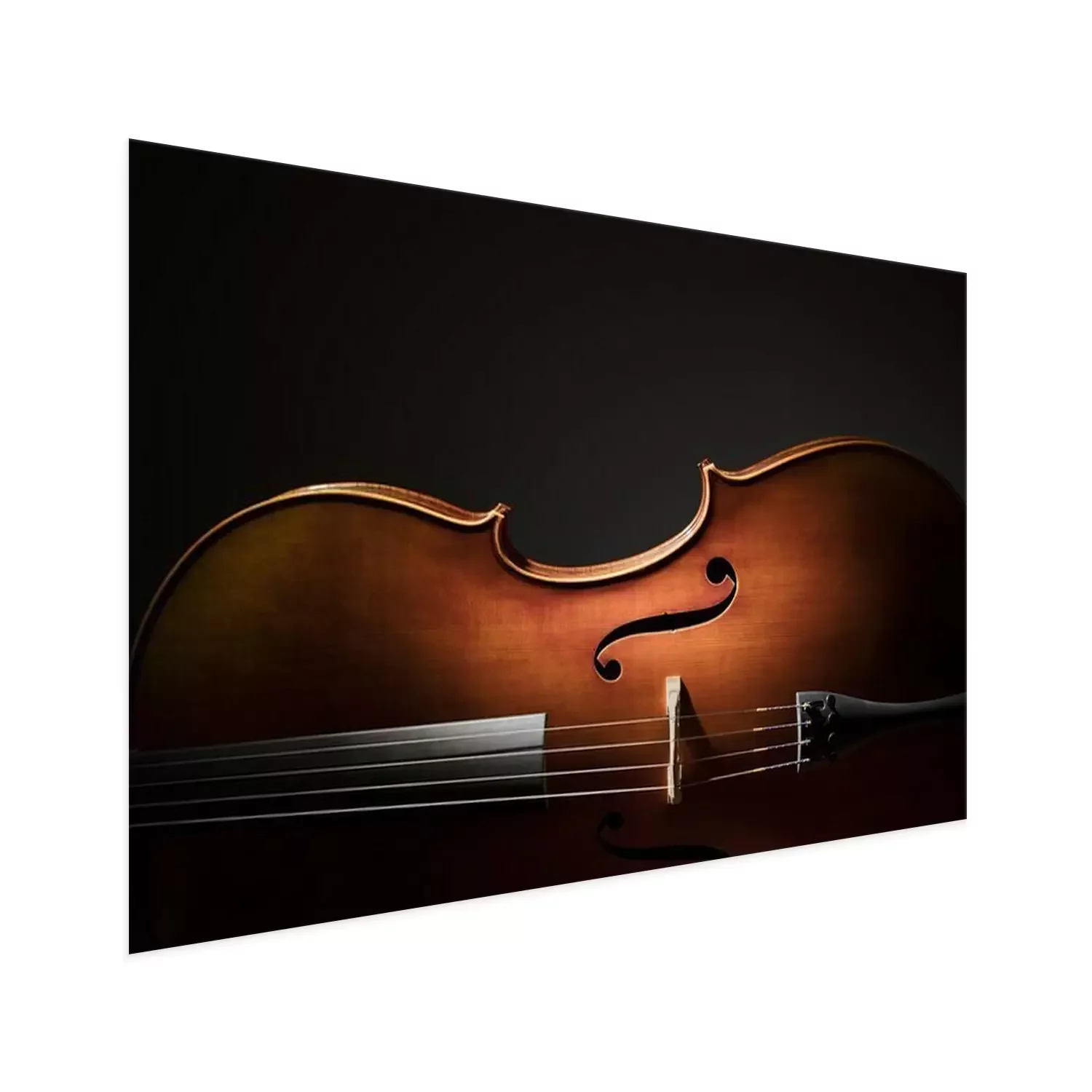 Poster Ein horizontal liegendes Cello auf schwarzem Hintergrund