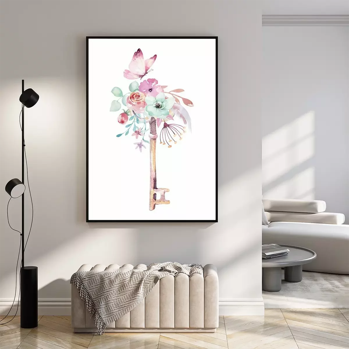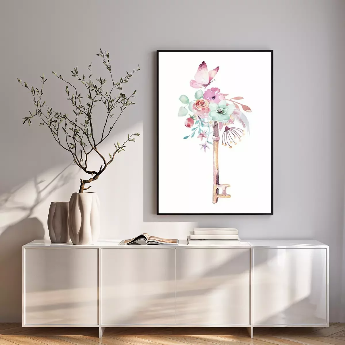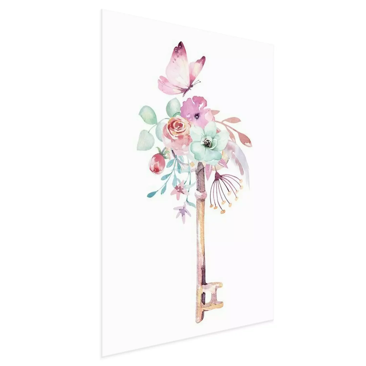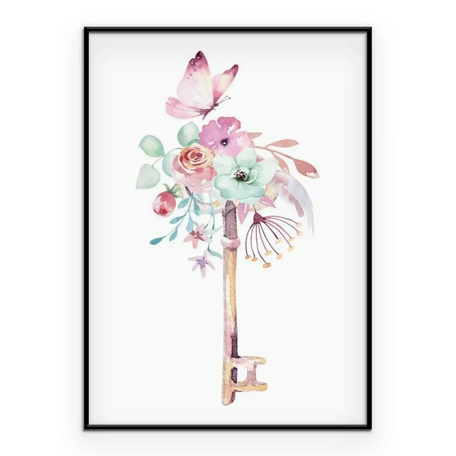 Poster: Ein mit Blumen und einem Schmetterling verzierter Schlüssel