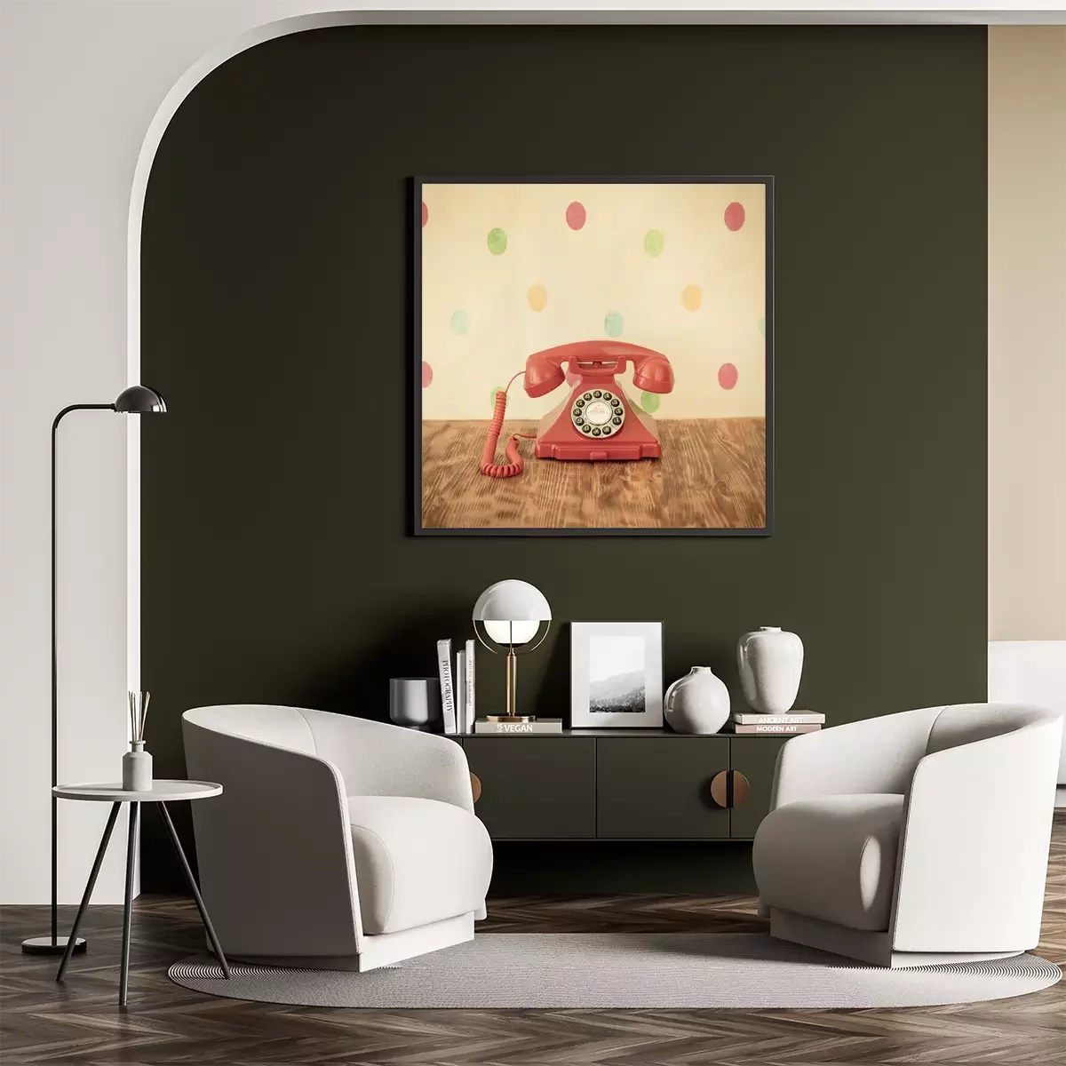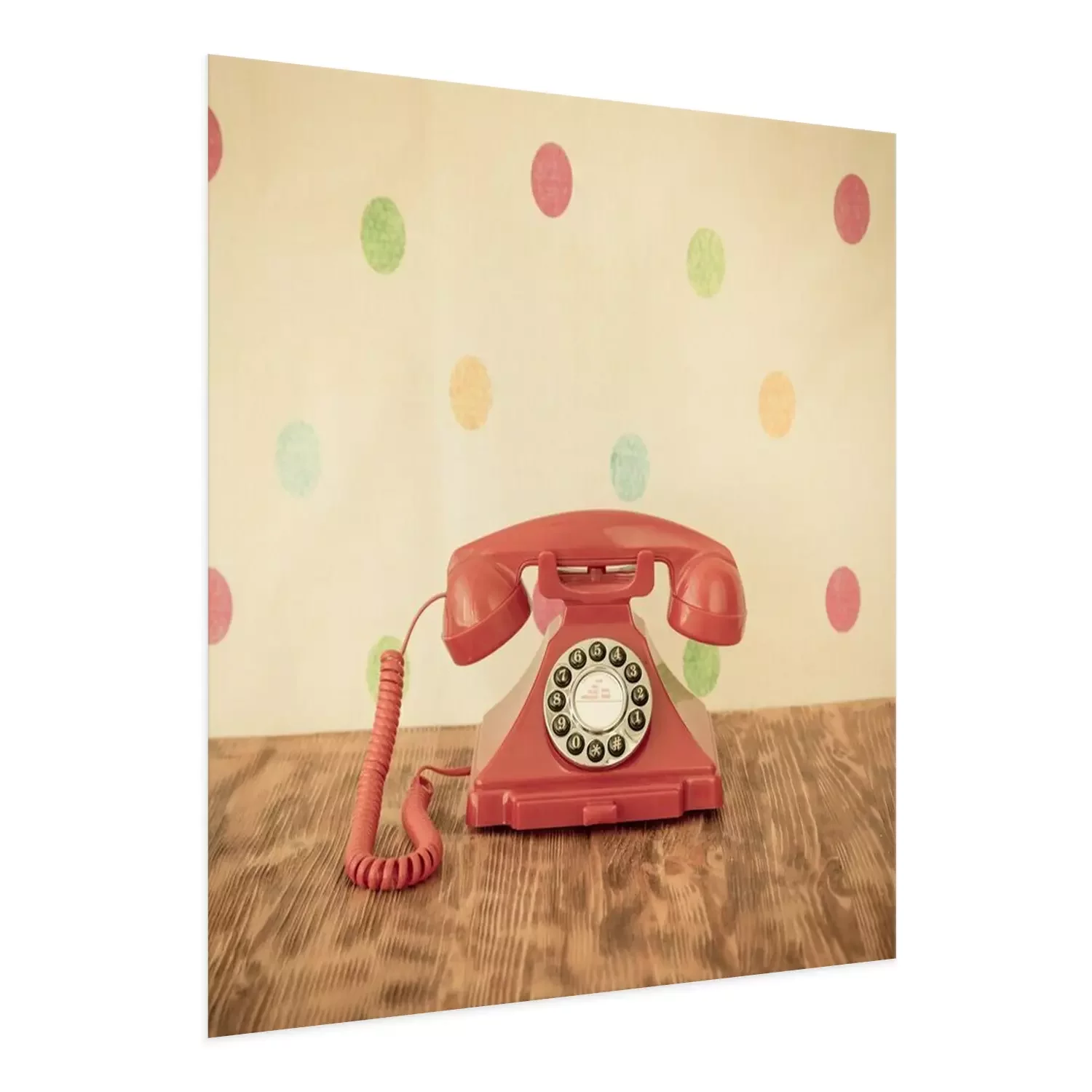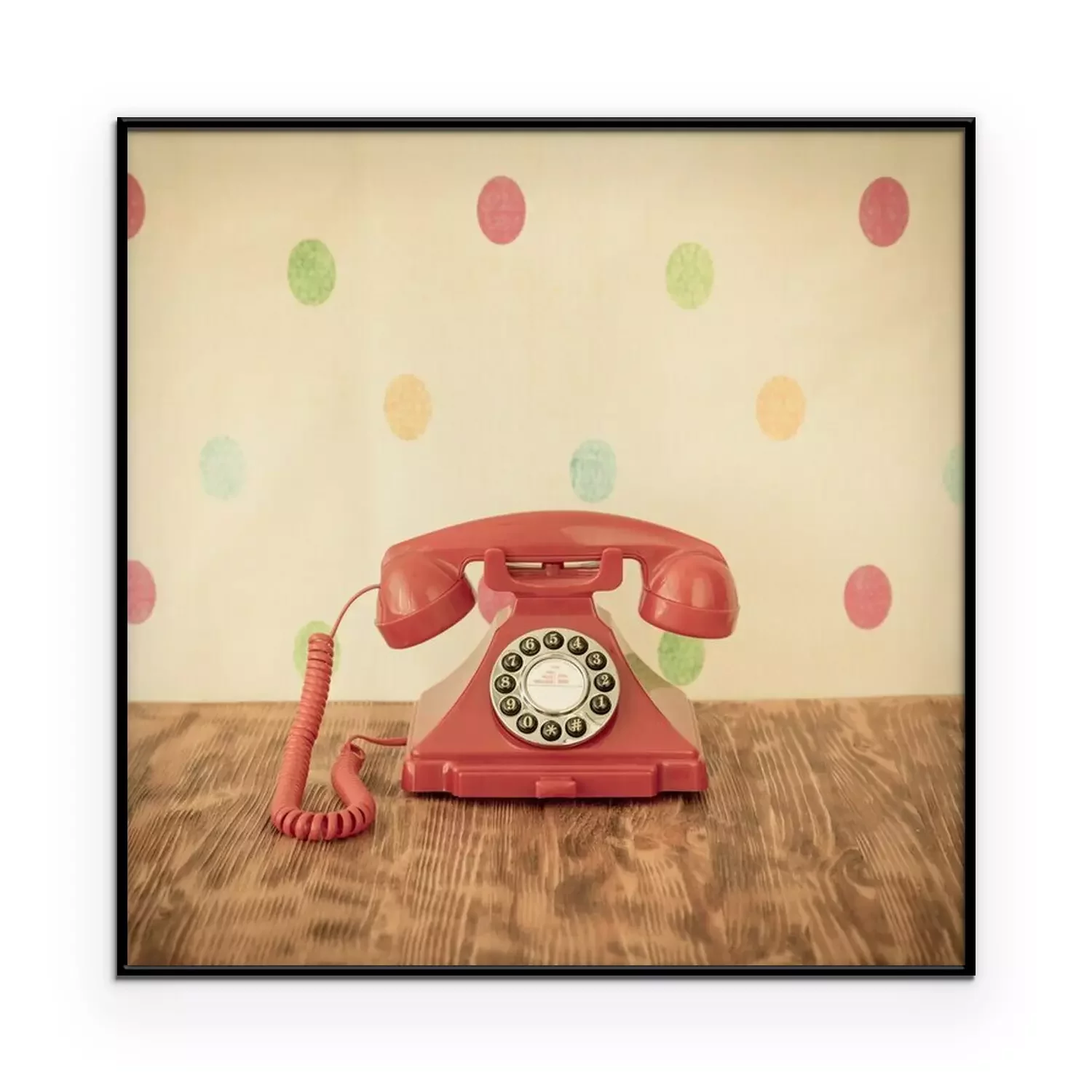 Poster Ein pinkfarbenes Retro-Telefon vor einer gepunkteten Wand