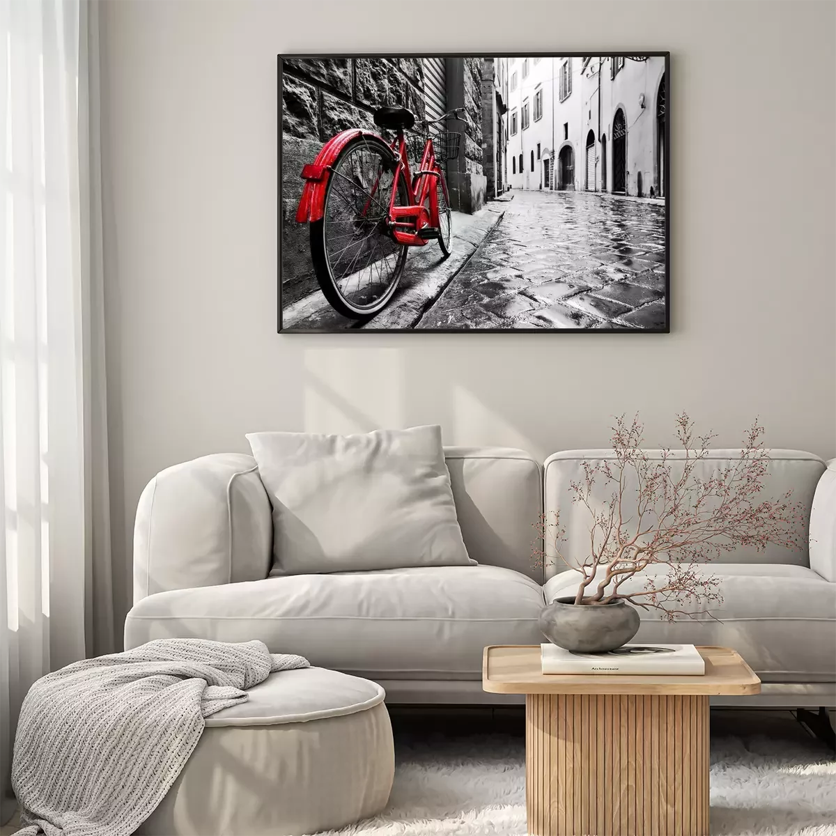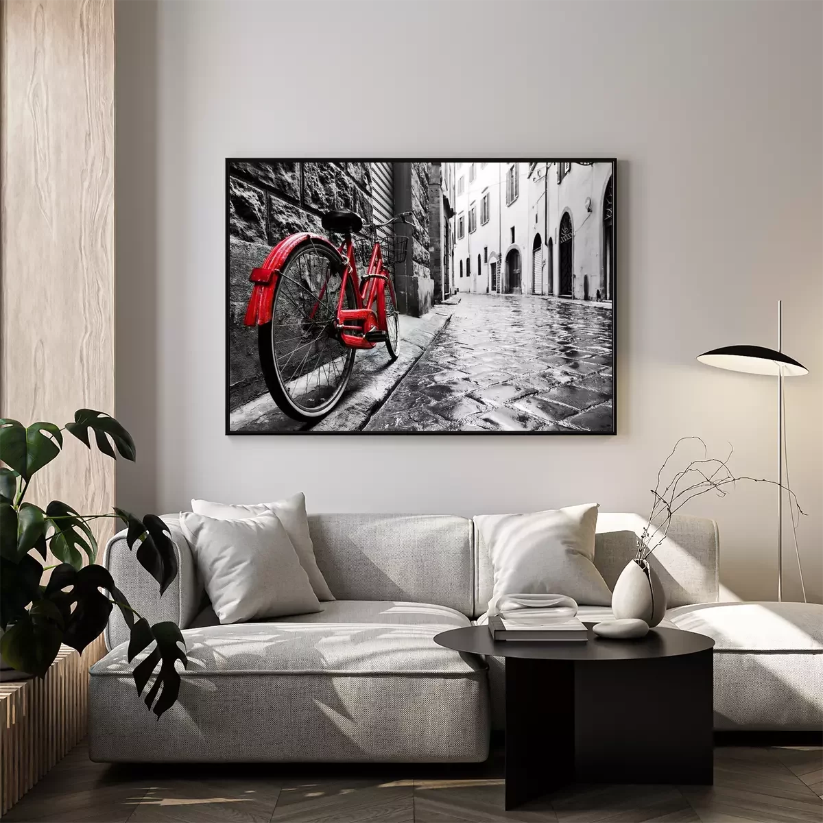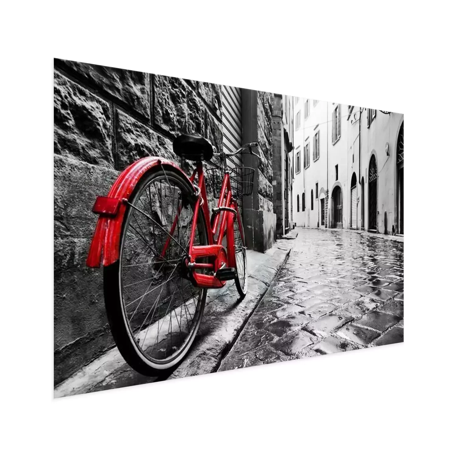 Poster: Ein rotes Vintage-Fahrrad vor dem Hintergrund einer schwarz-weißen Stadt