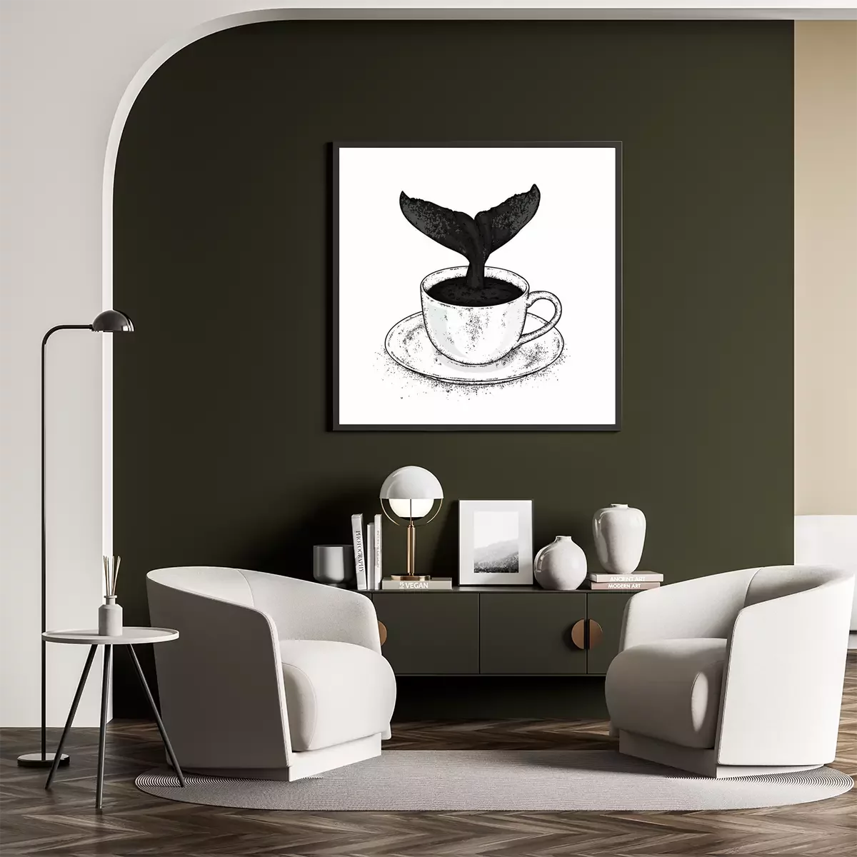 Poster: Ein Wal, der ins Wasser taucht. Vector Illustration für eine Postkarte oder ein Plakat, Druck für Kleidung. Meer und Ozean. Wal in der Tasse.