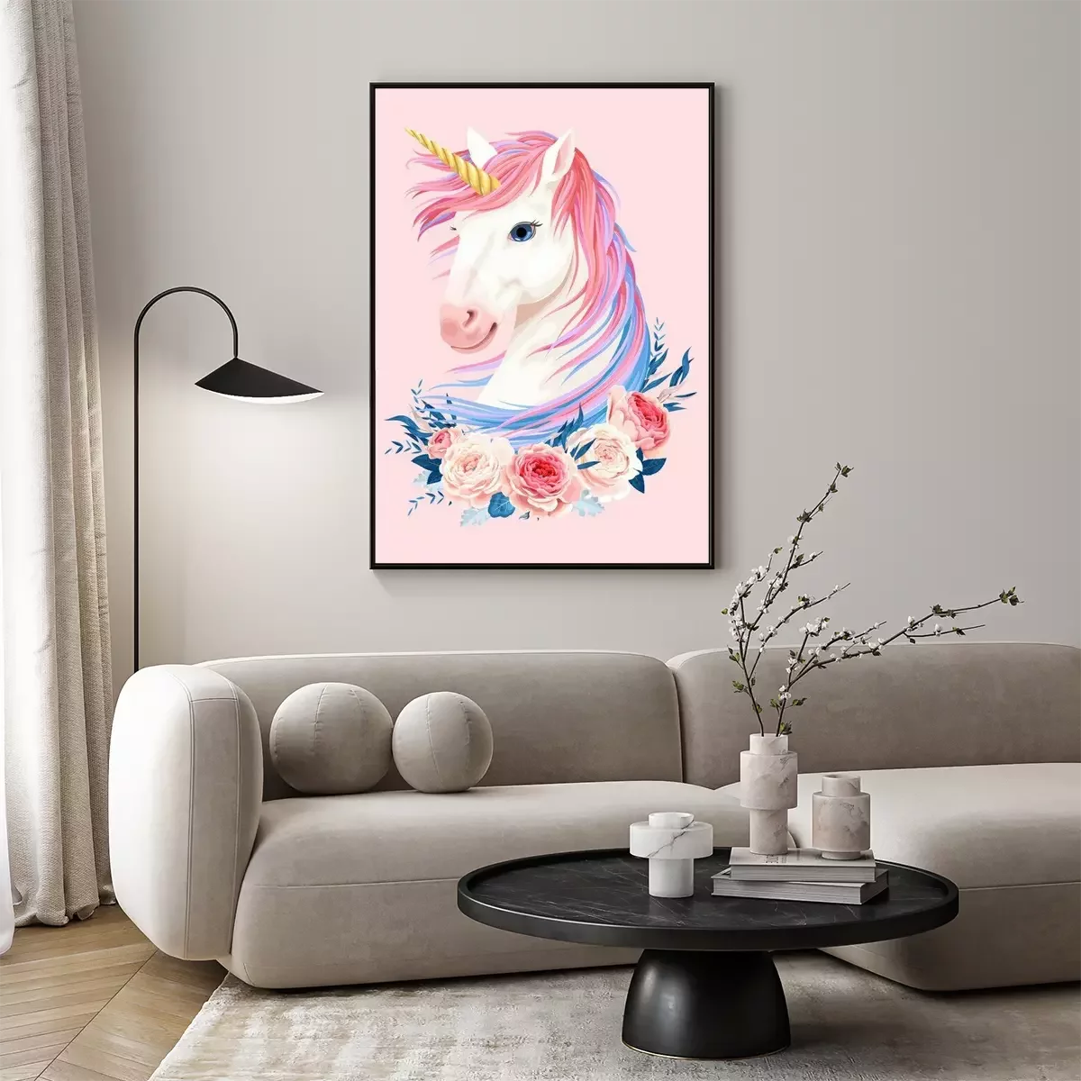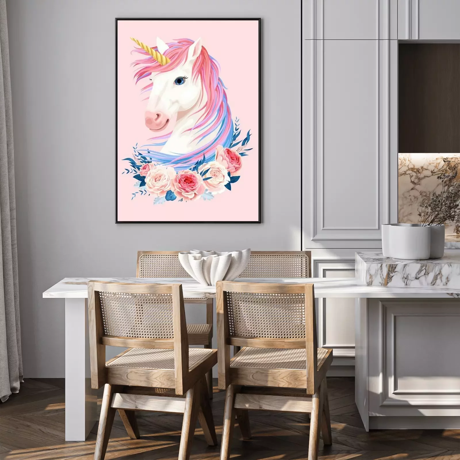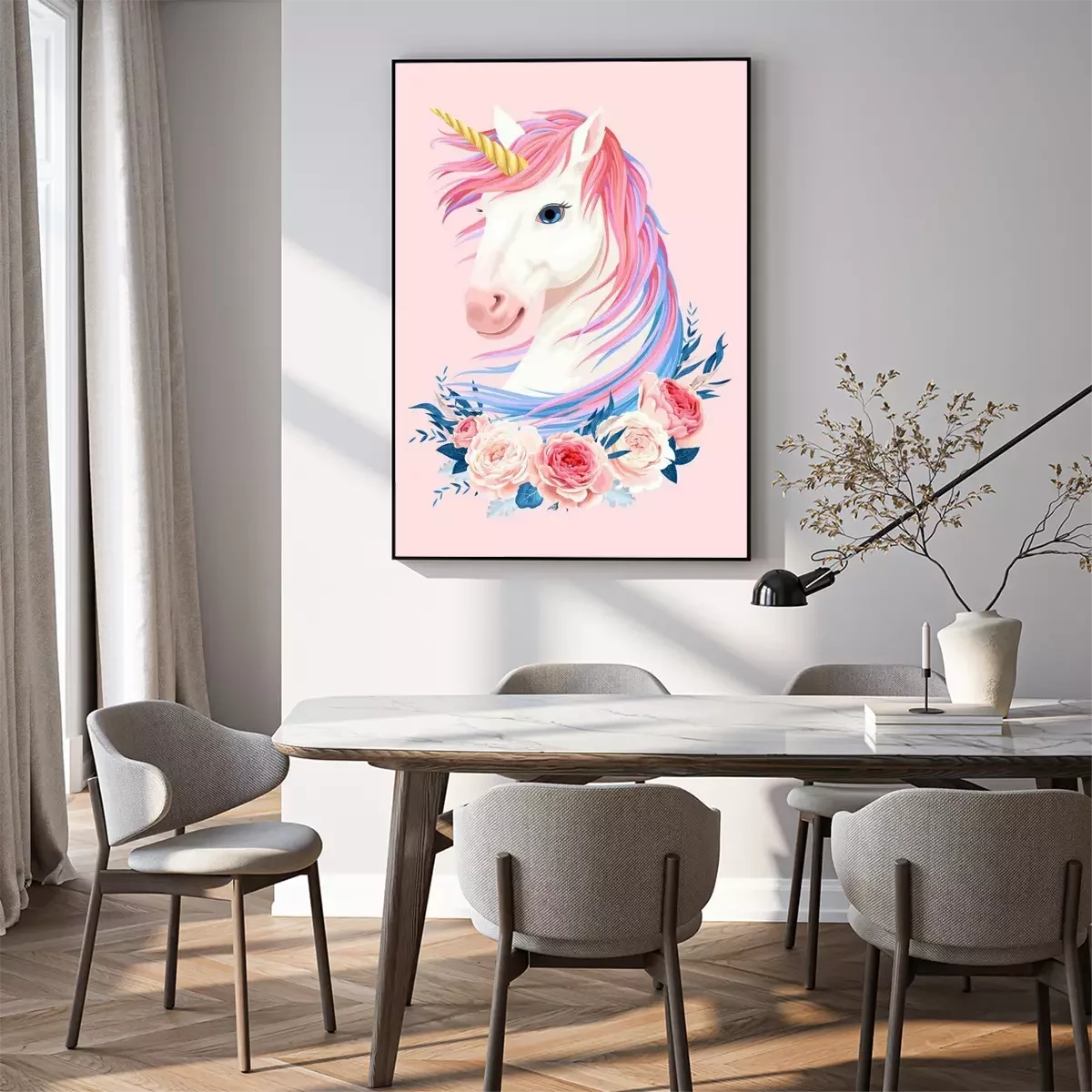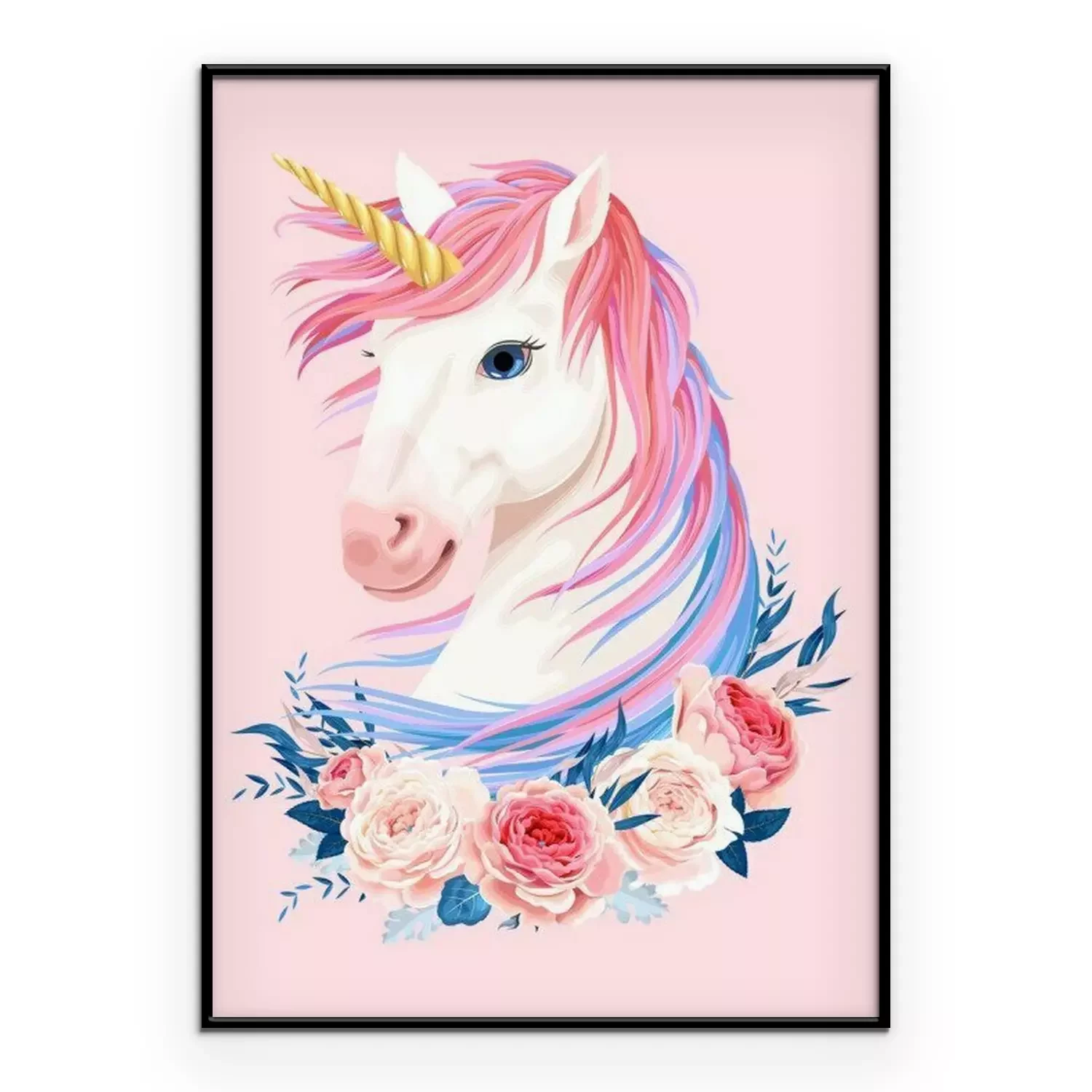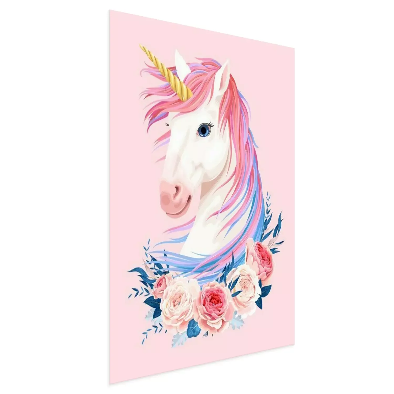 Poster: Einhorn mit bunter Mähne und Rosen