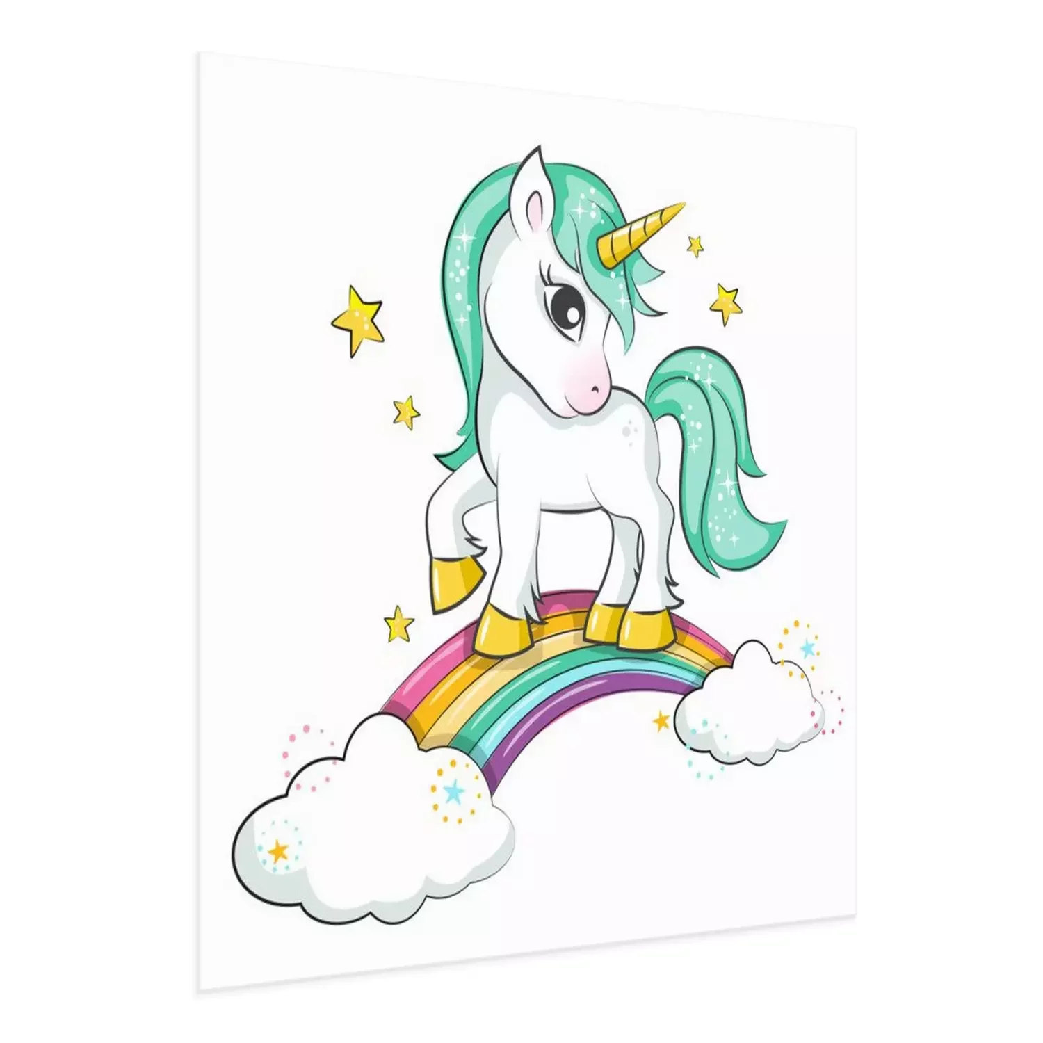 Poster: Einhorn mit grünem Schwanz und Mähne auf einem Regenbogen