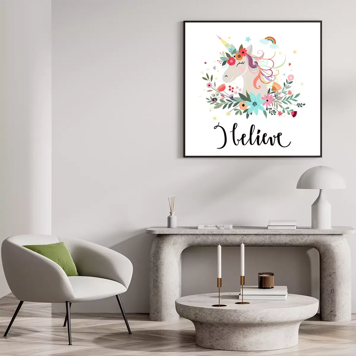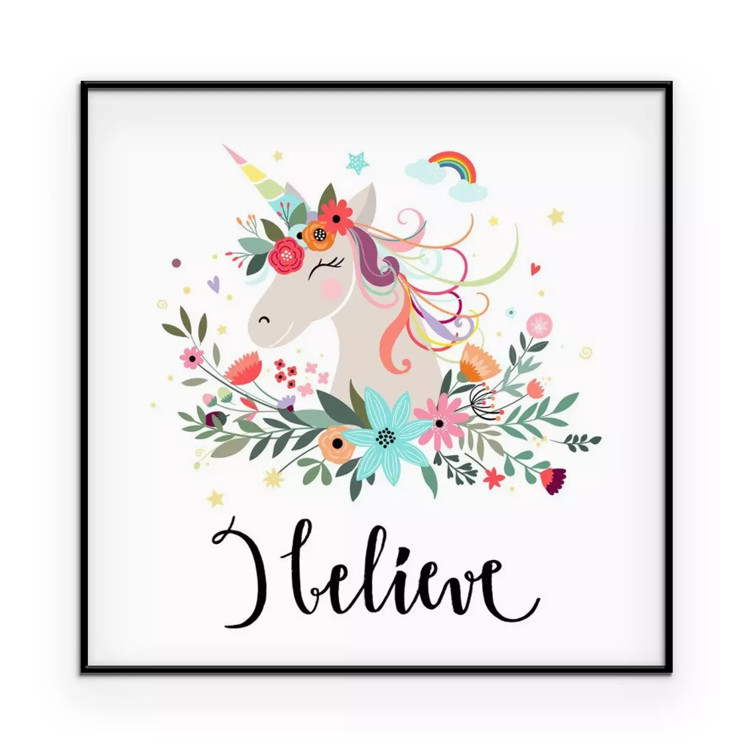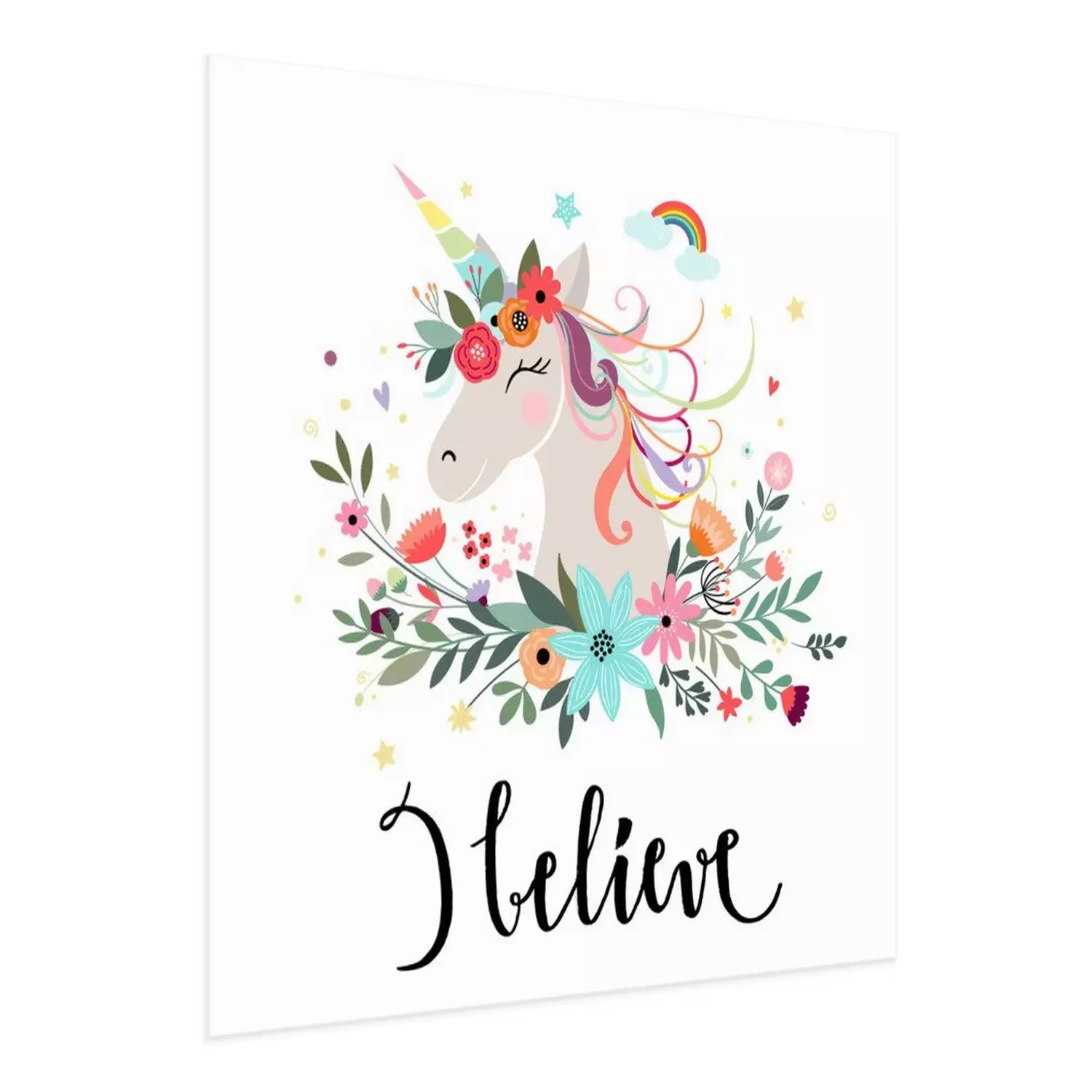 Poster: Einhorn mit Regenbogenhorn und Blumen