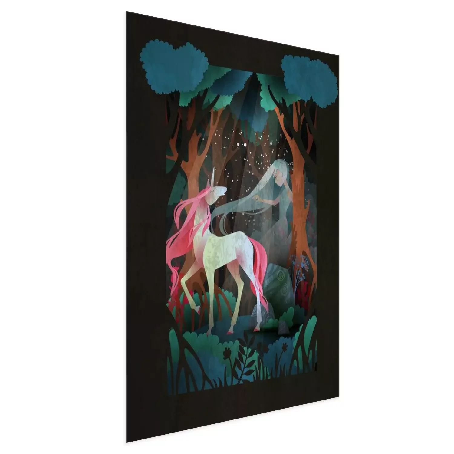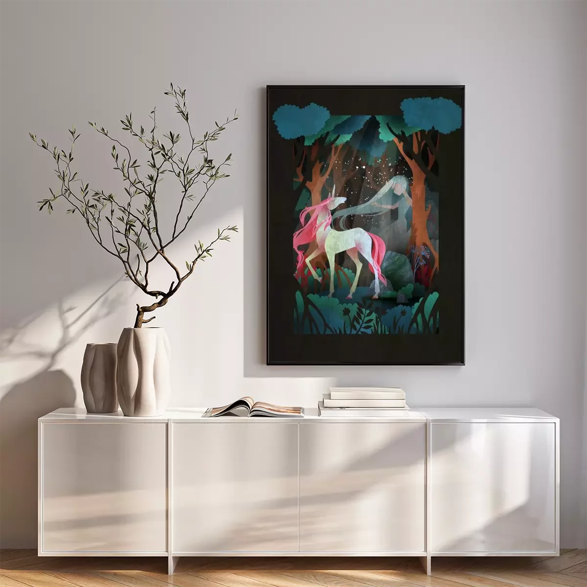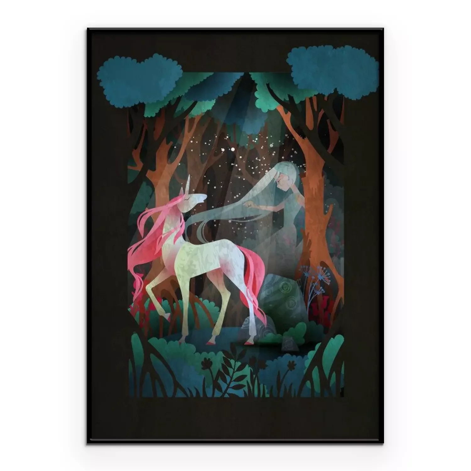 Poster: Einhorn und Waldnymphe zwischen den Bäumen