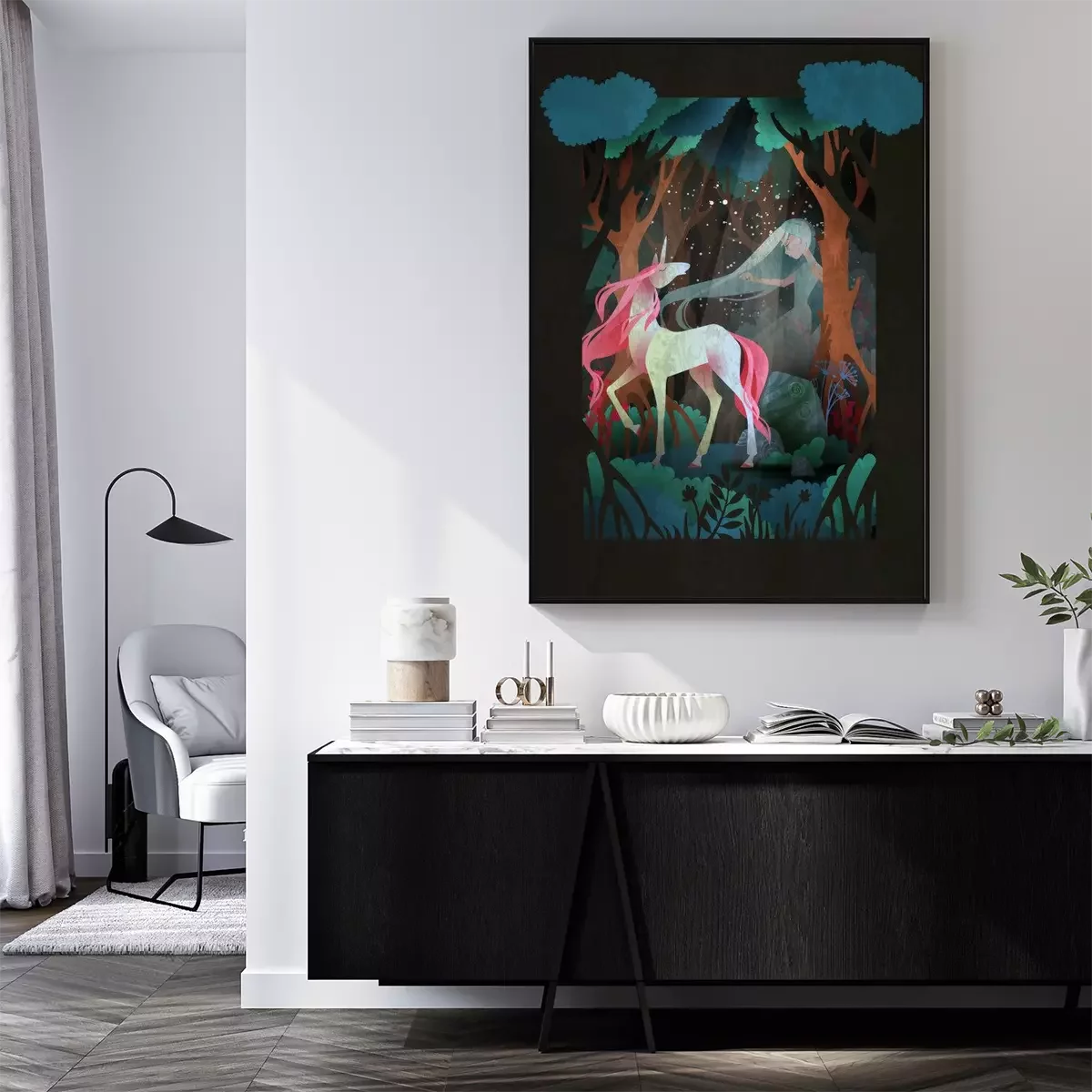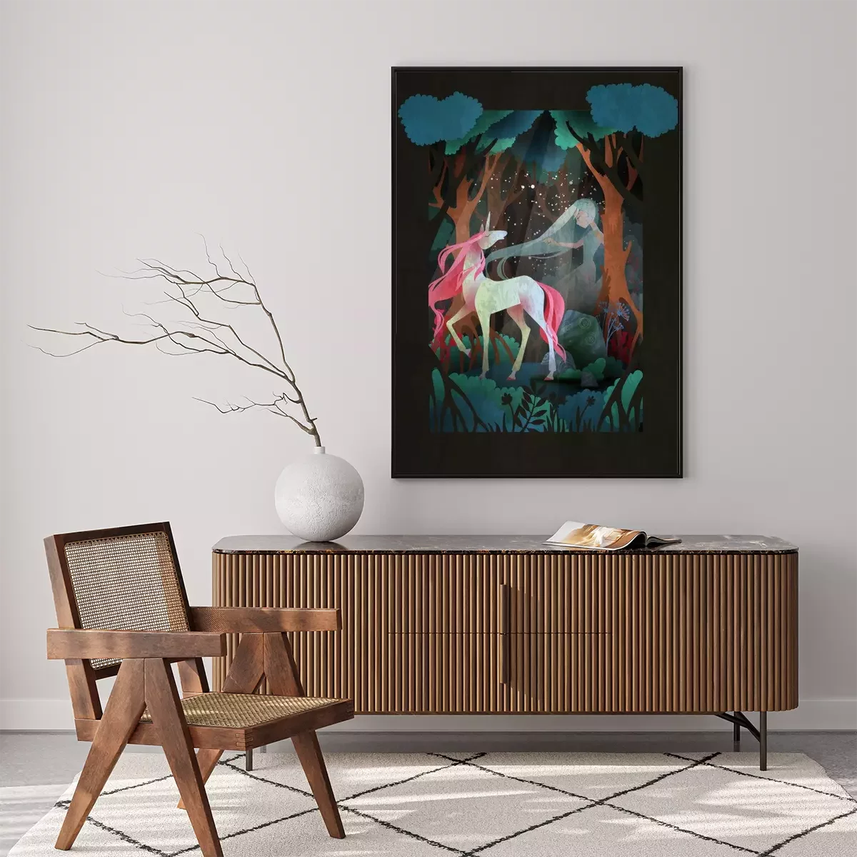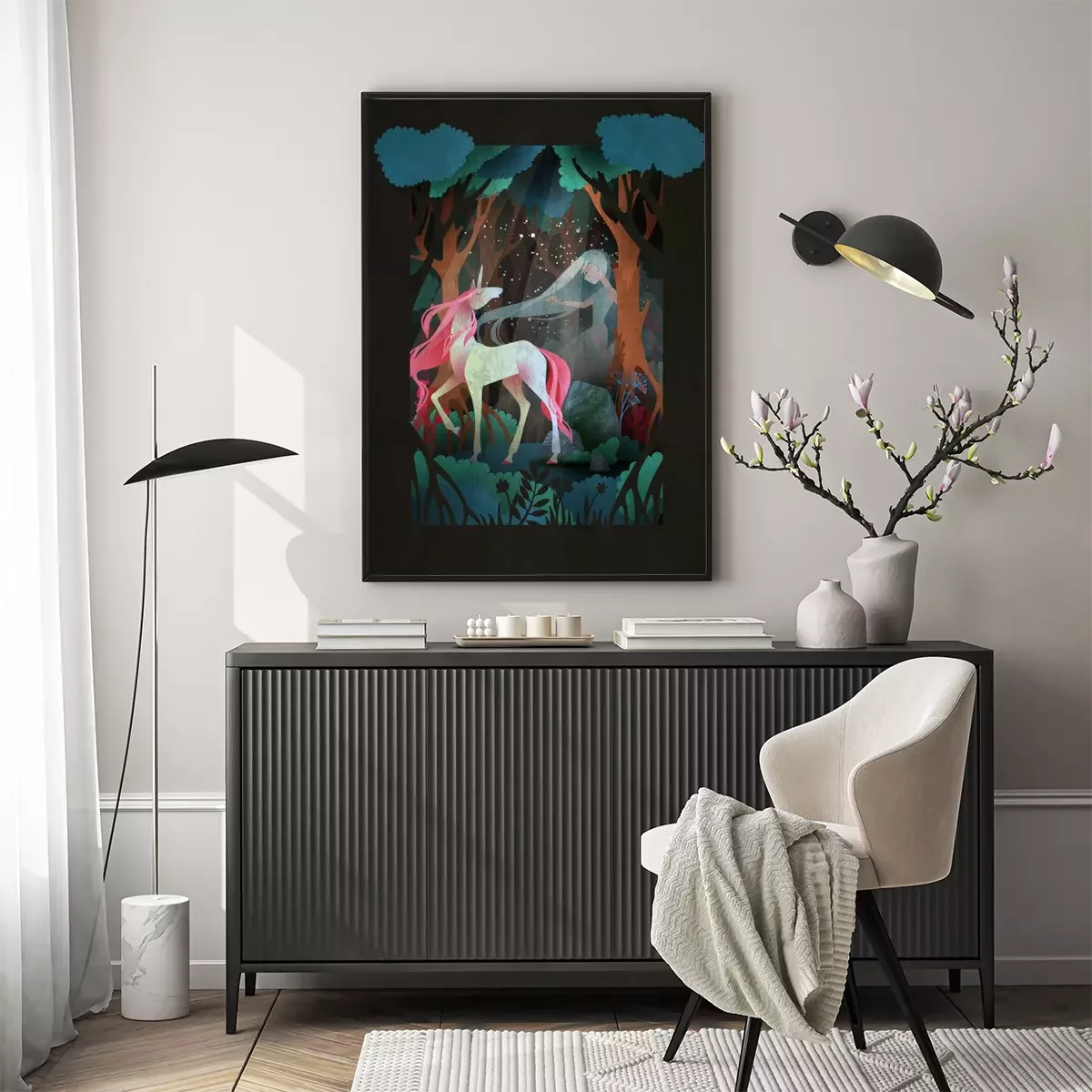 Poster: Einhorn und Waldnymphe zwischen den Bäumen