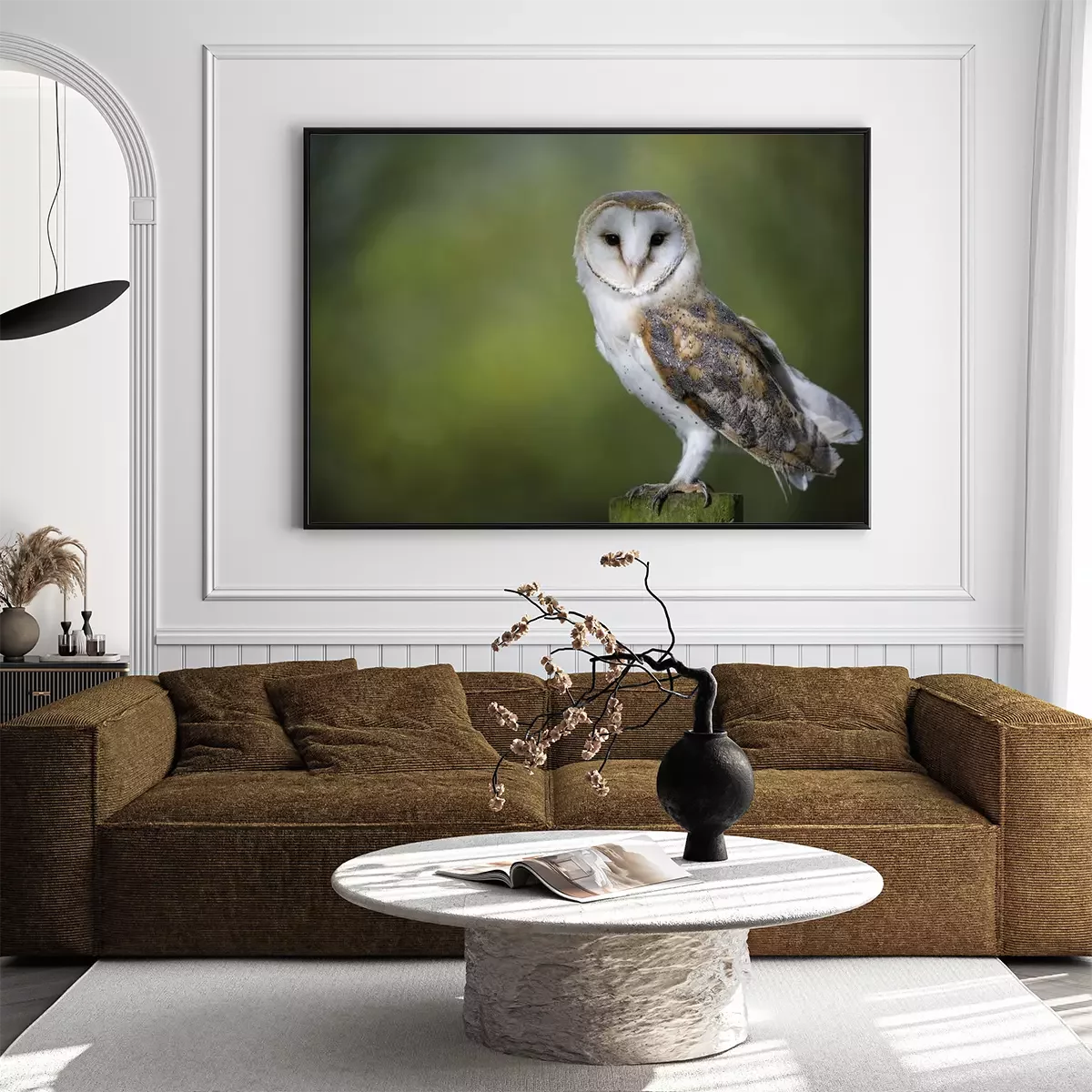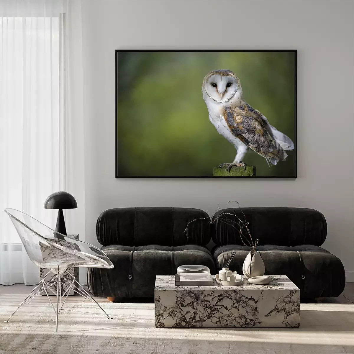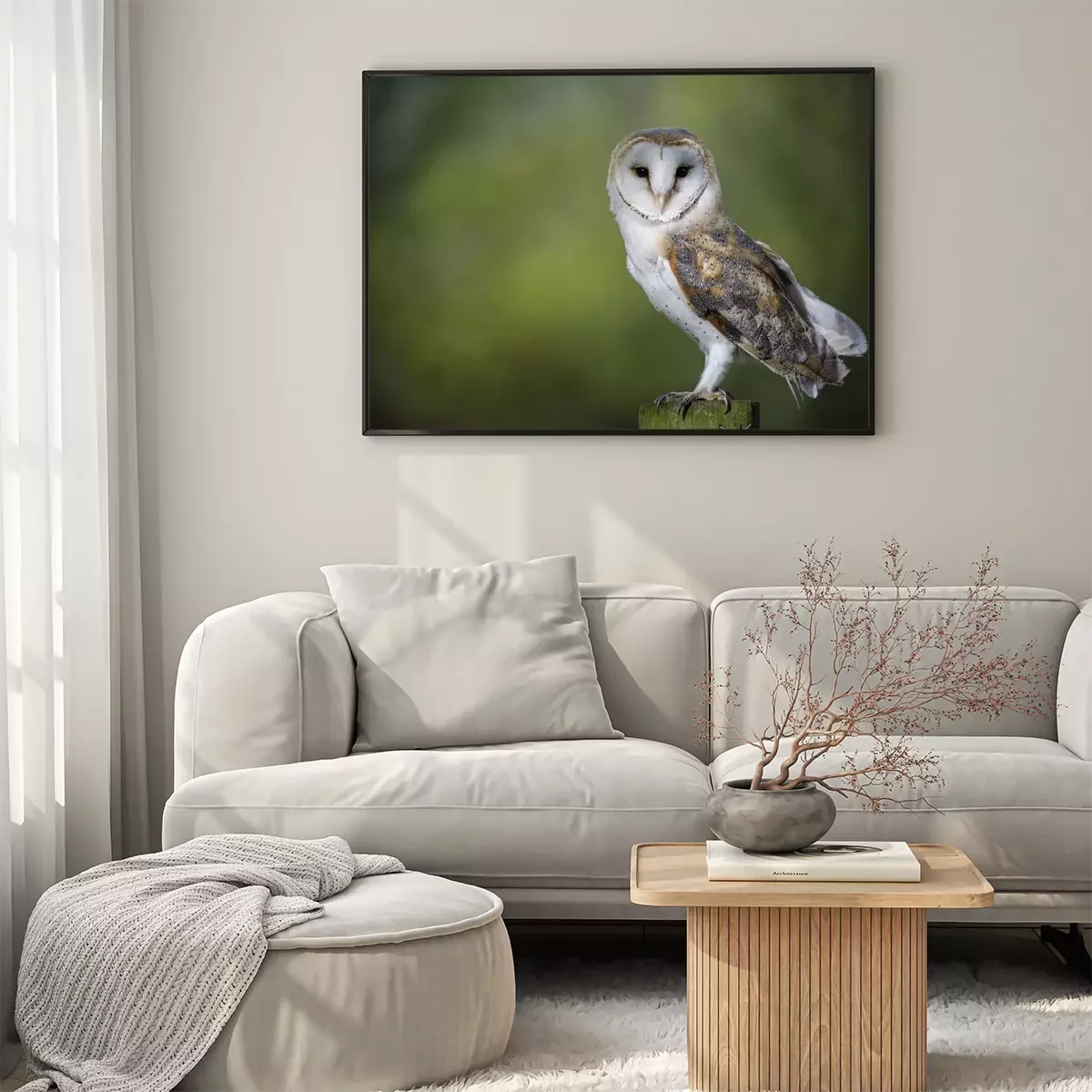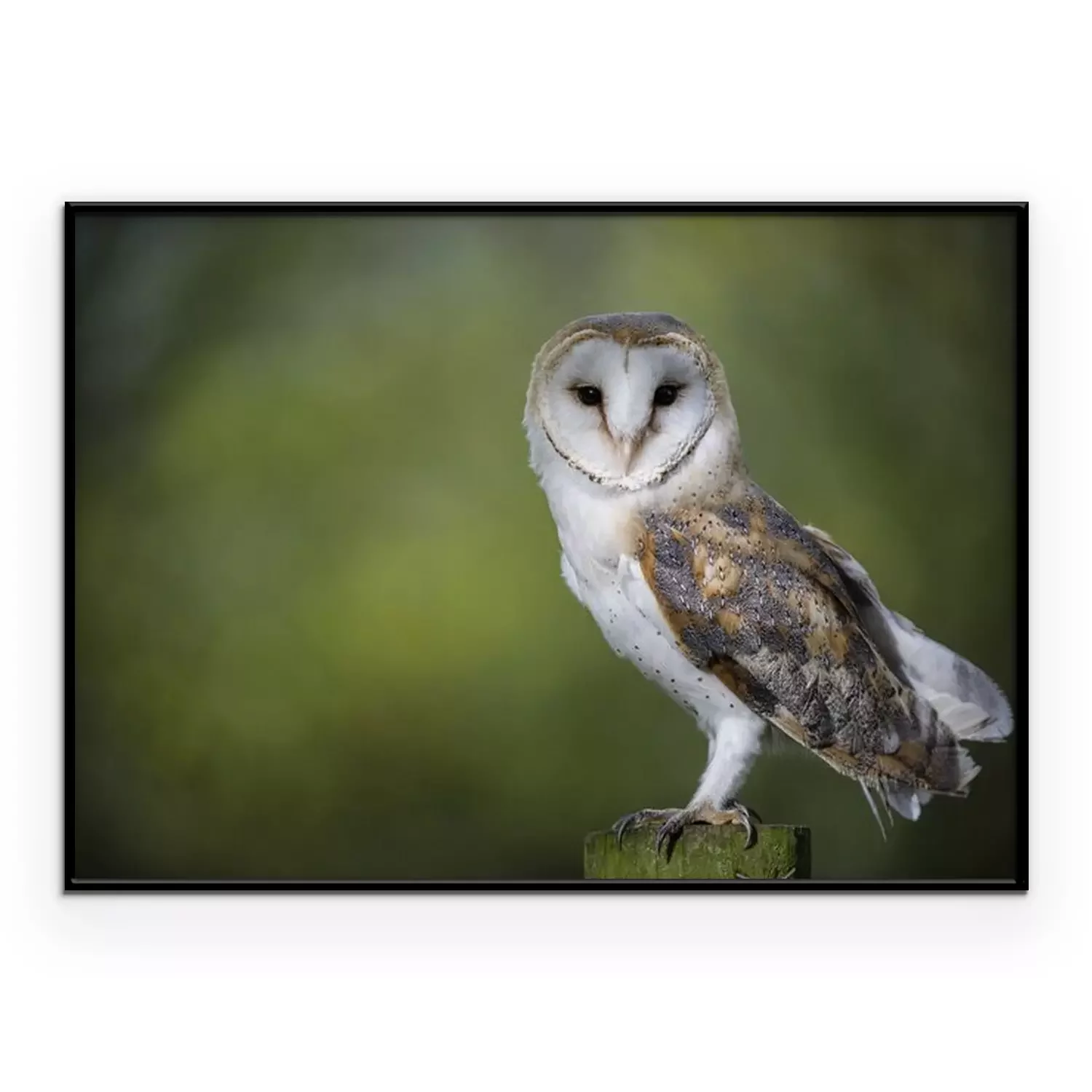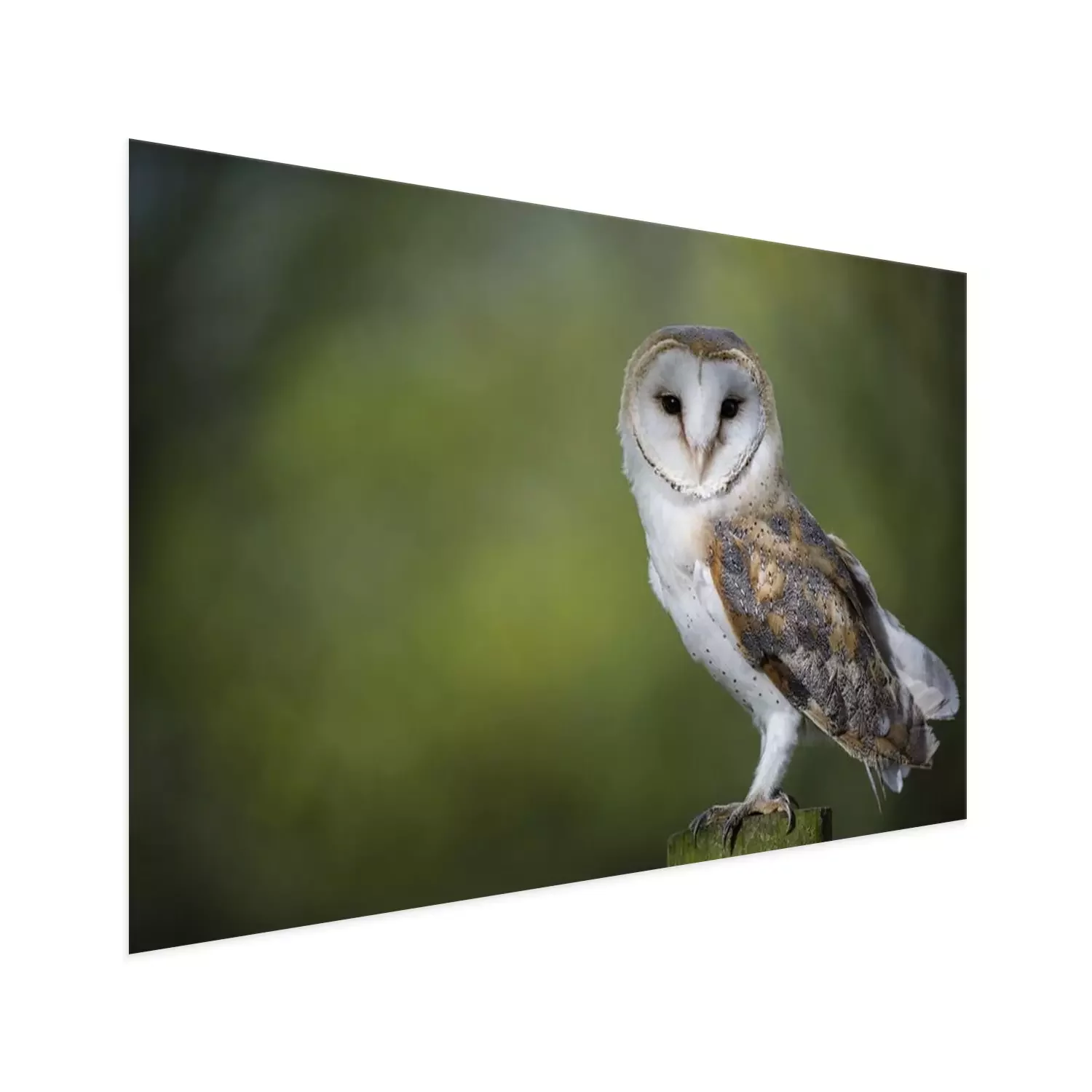 Poster: Eule auf einem unscharfen grünen Hintergrund