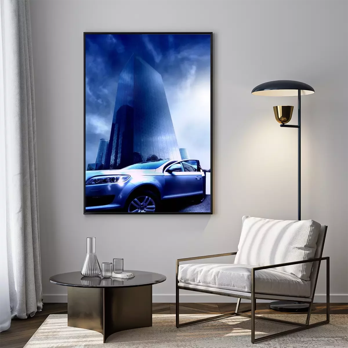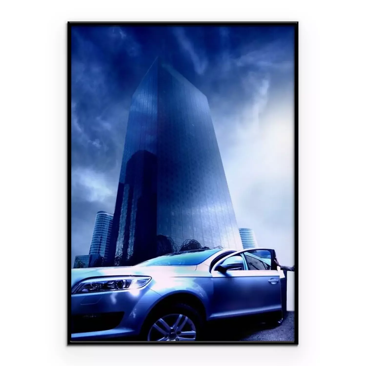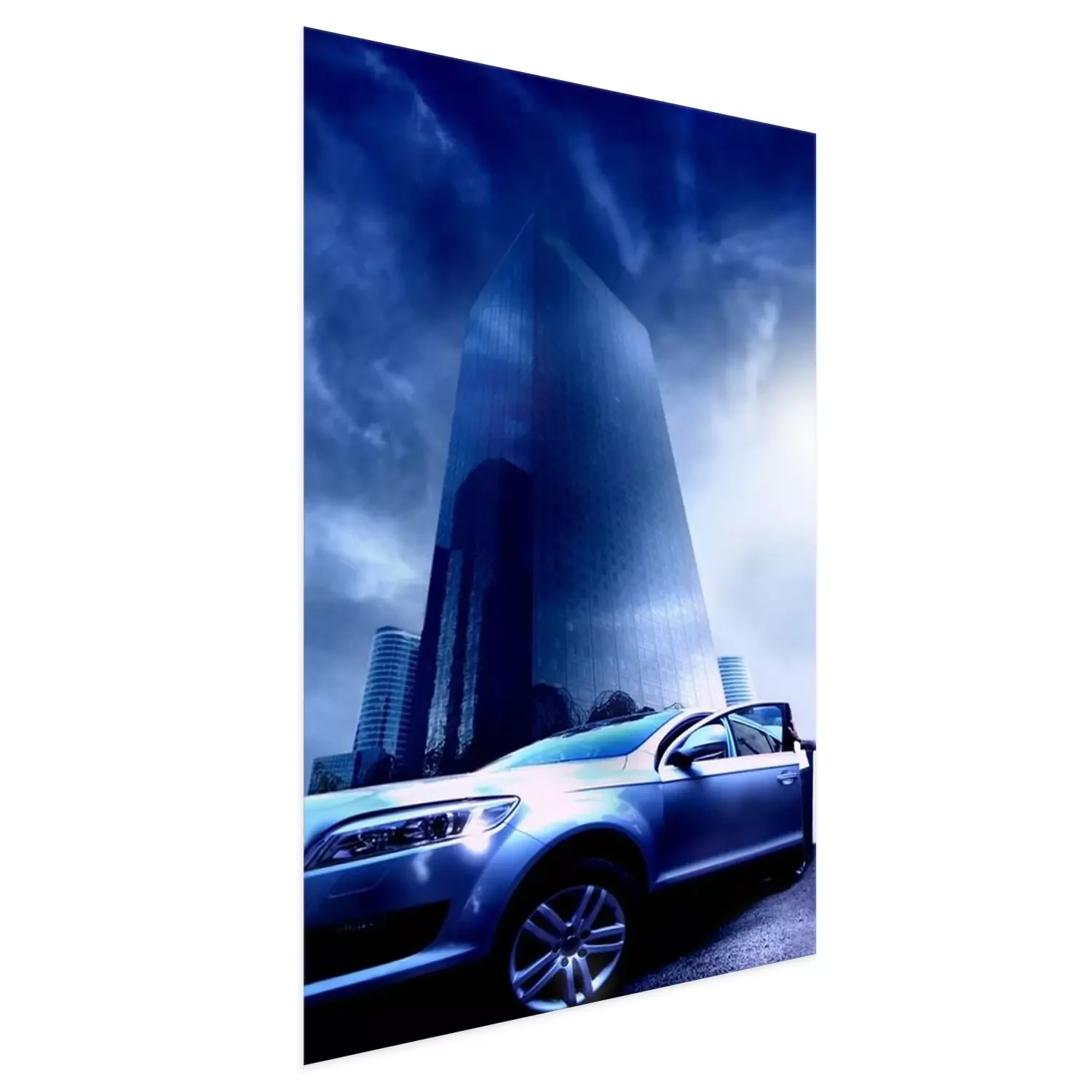 Poster: Exklusives Auto vor dem Hintergrund eines modernen Wolkenkratzers