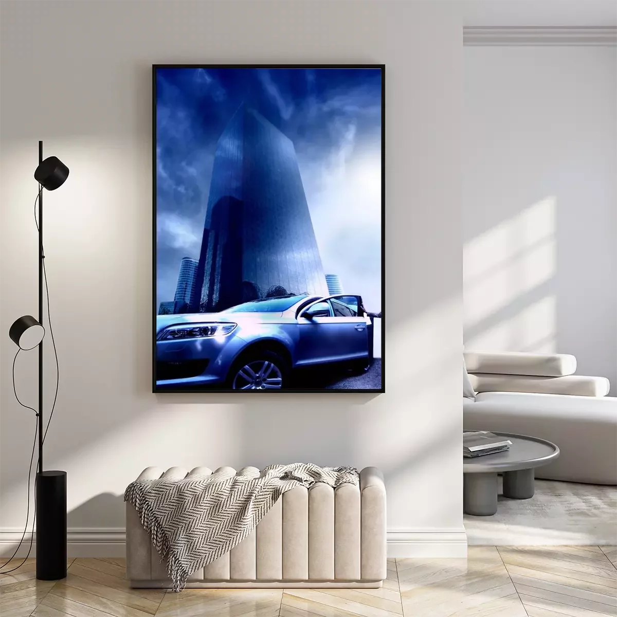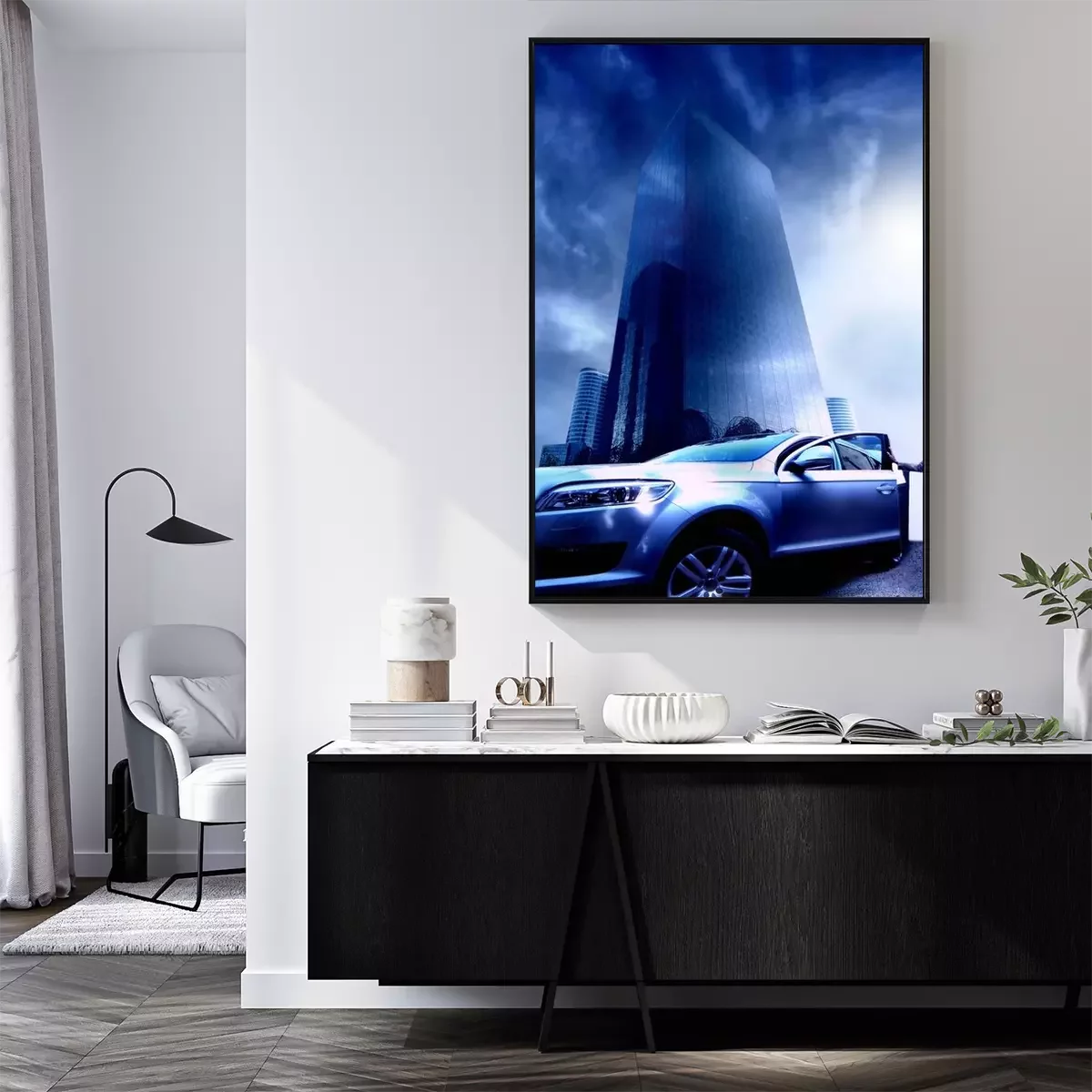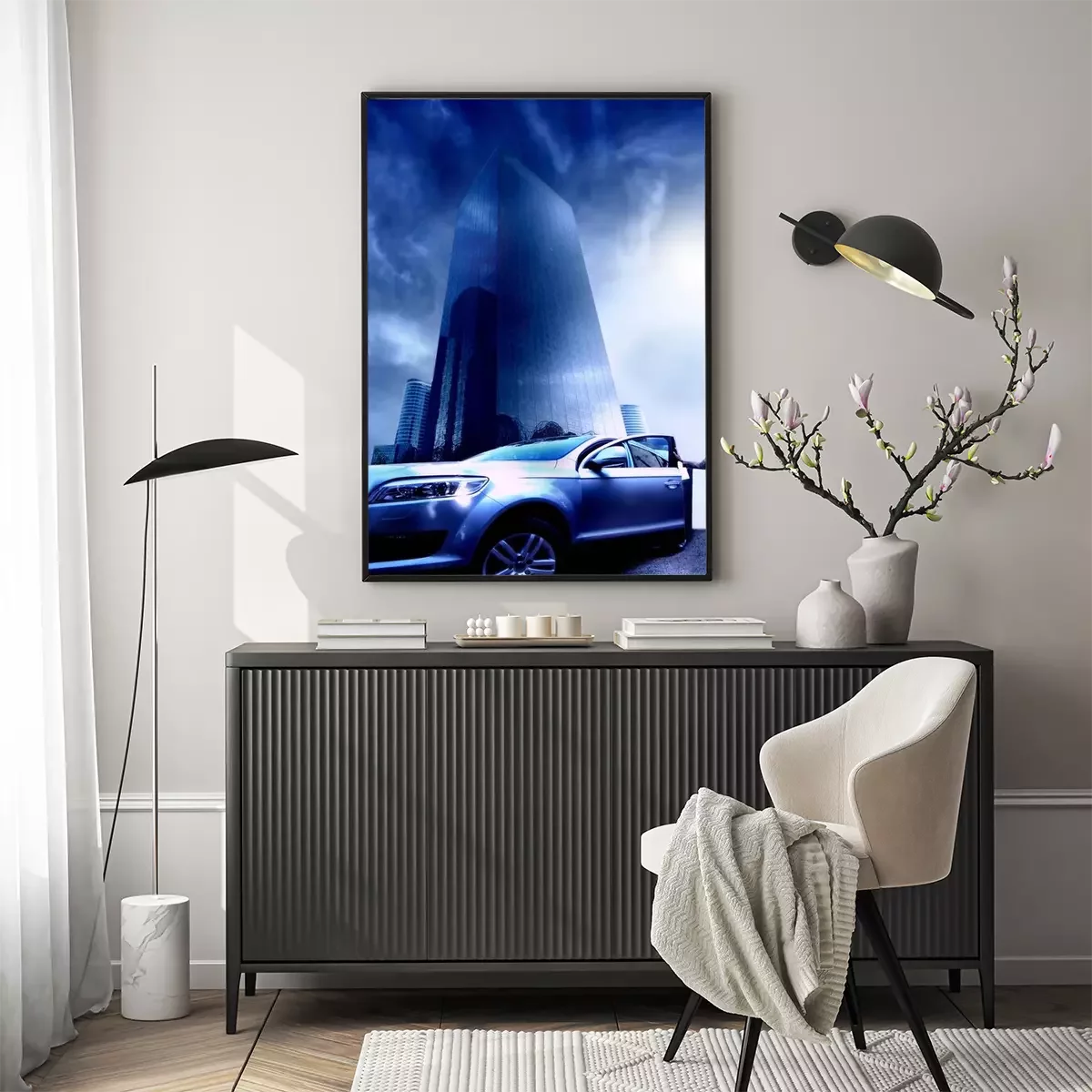 Poster: Exklusives Auto vor dem Hintergrund eines modernen Wolkenkratzers