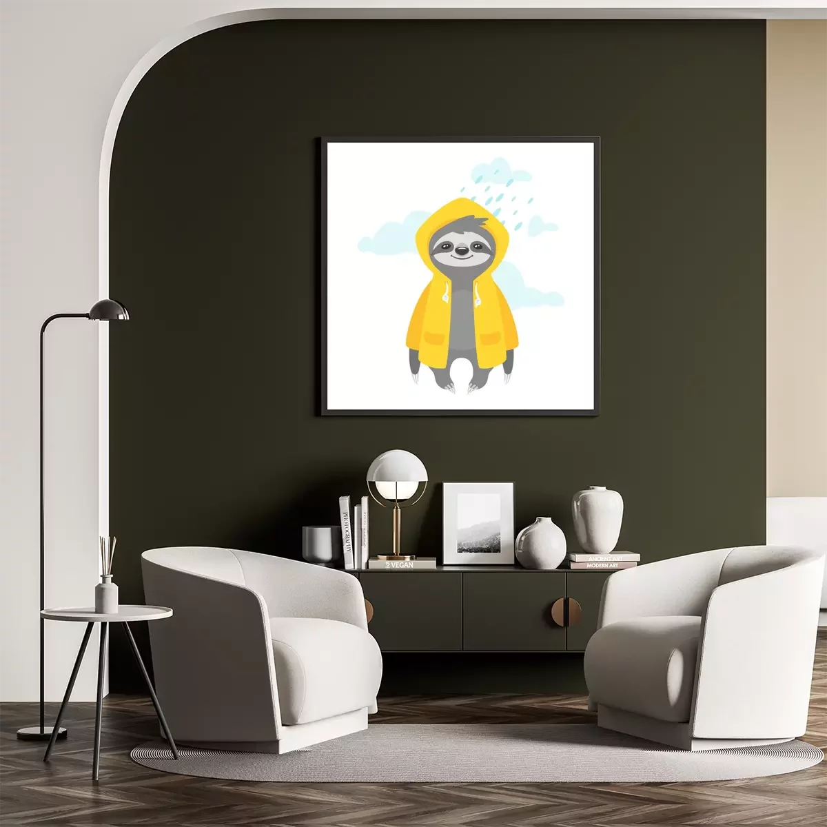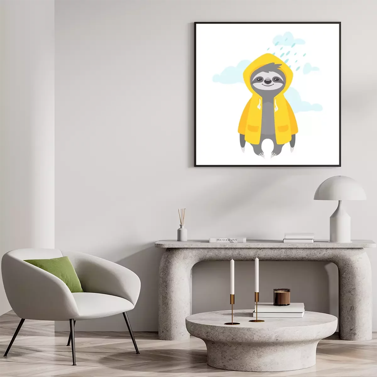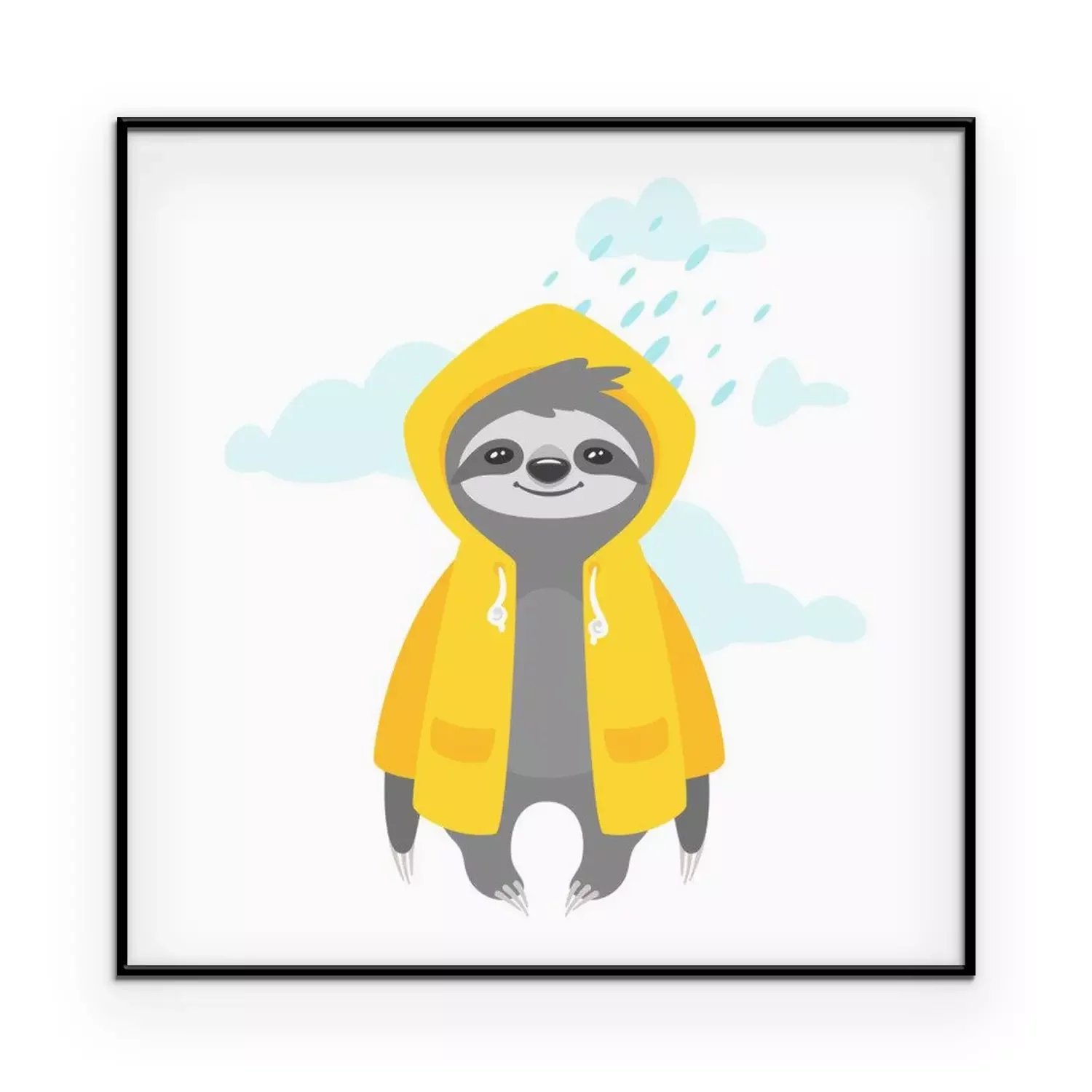 Poster Faultier im gelben Regenmantel mit weißen Schürchen
