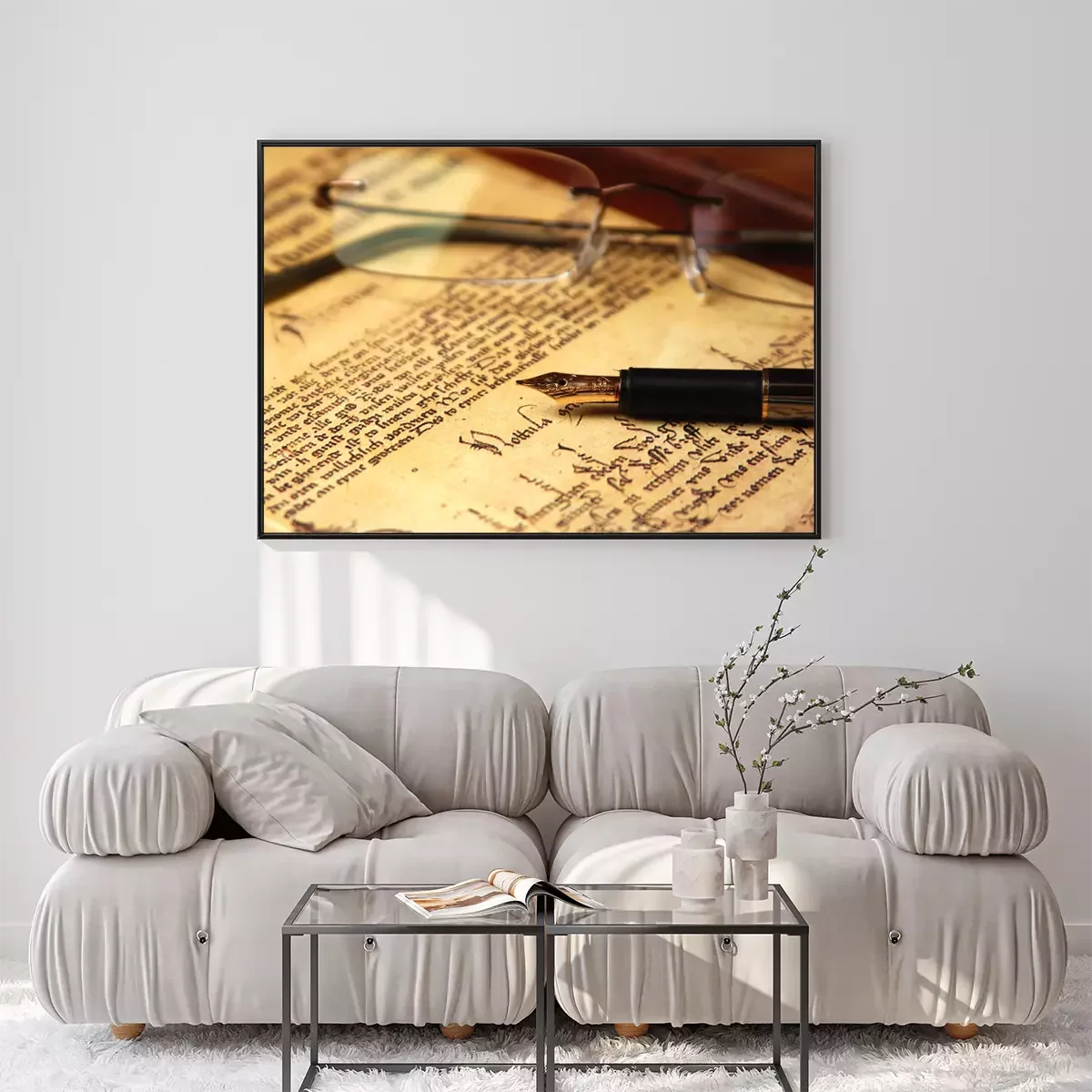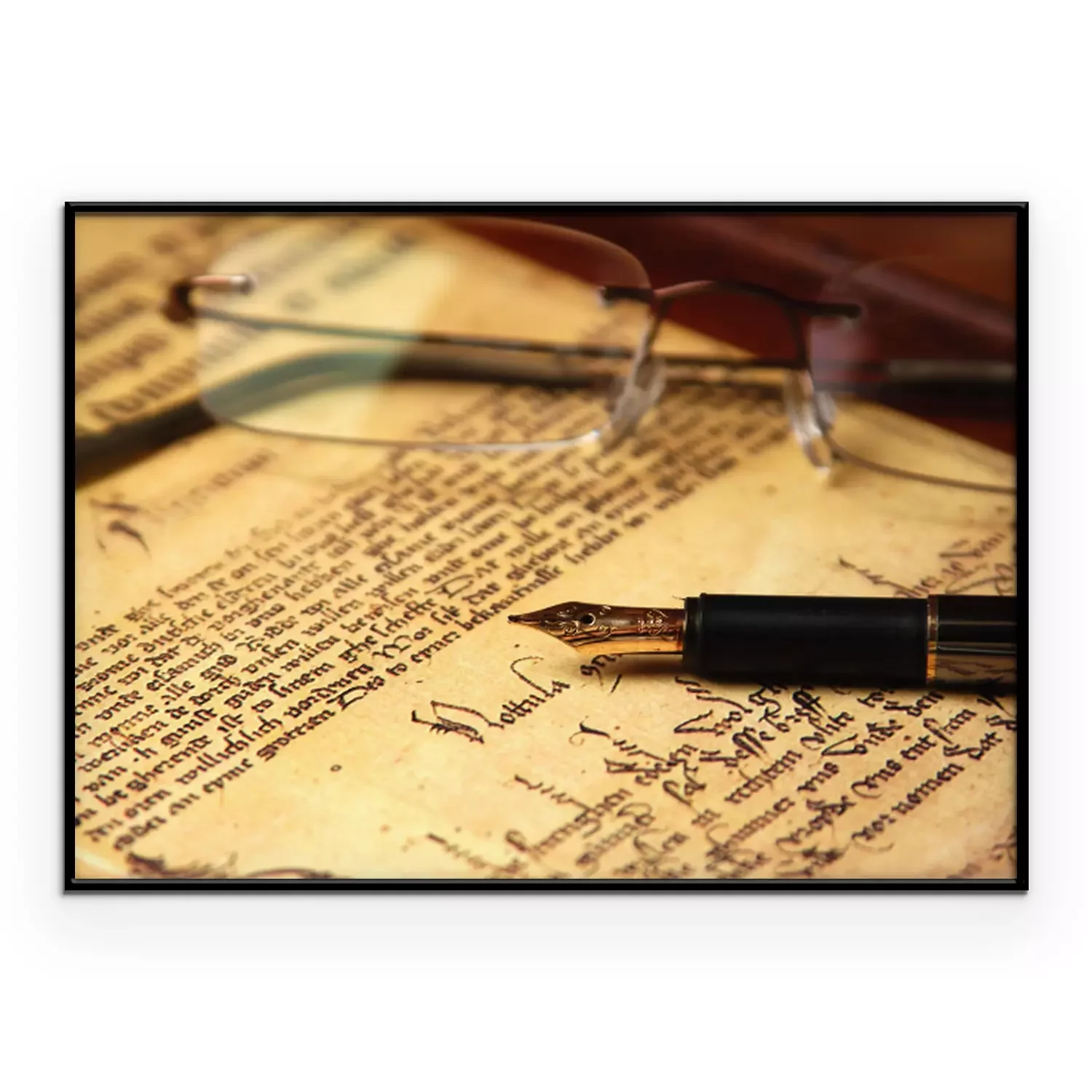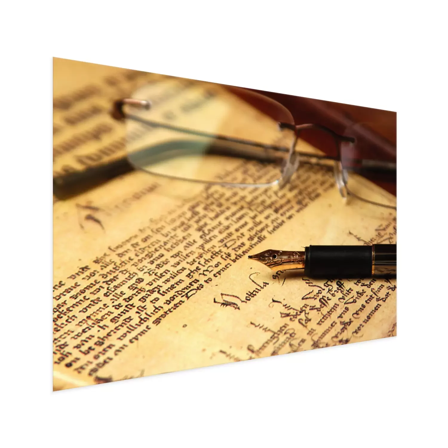 Poster: Feder und Brille auf ein Buch gelegt
