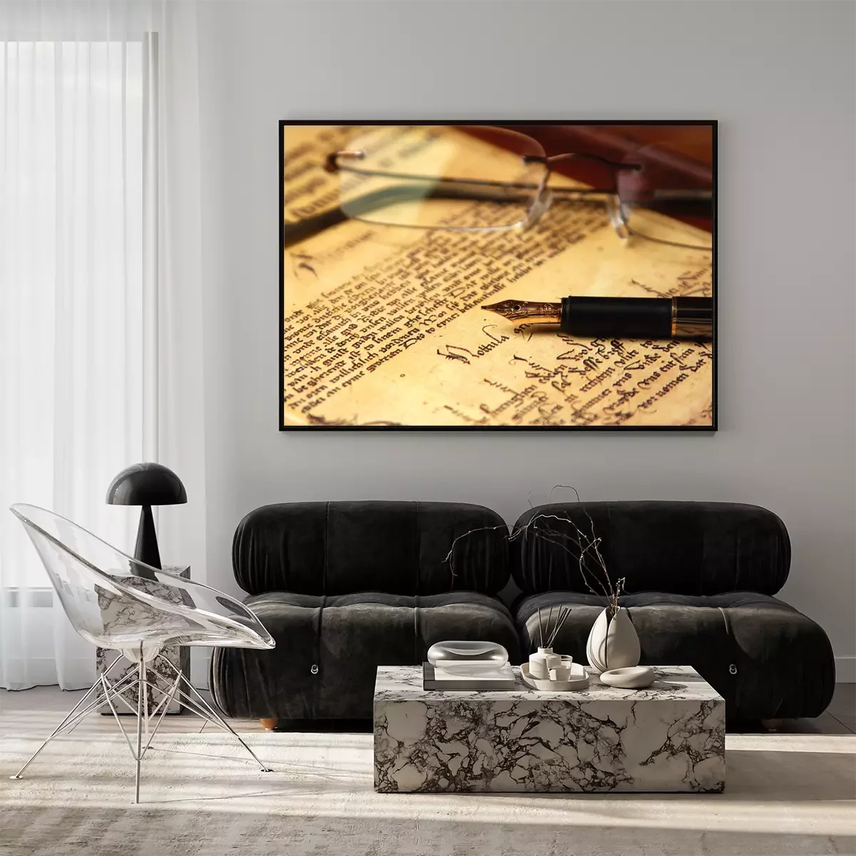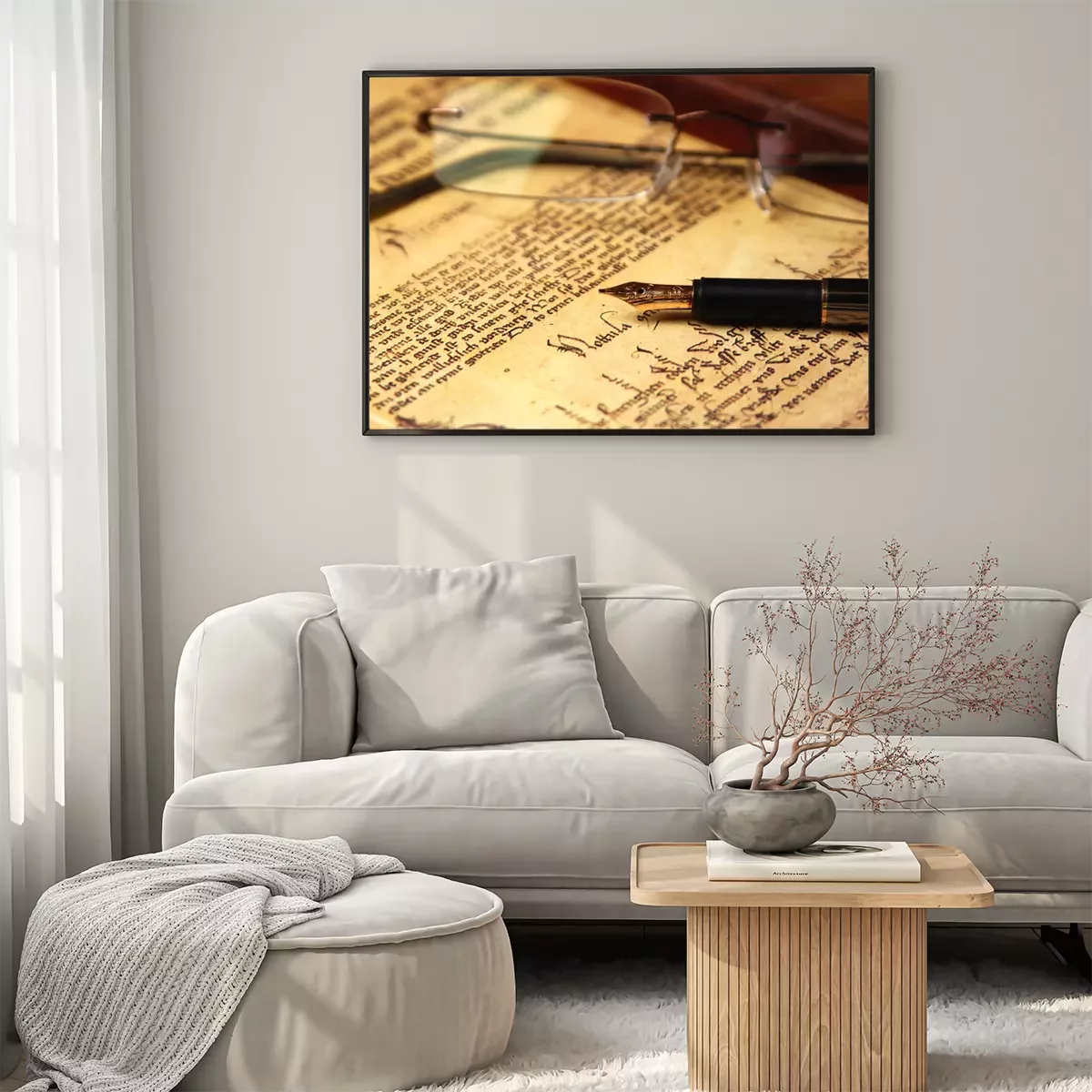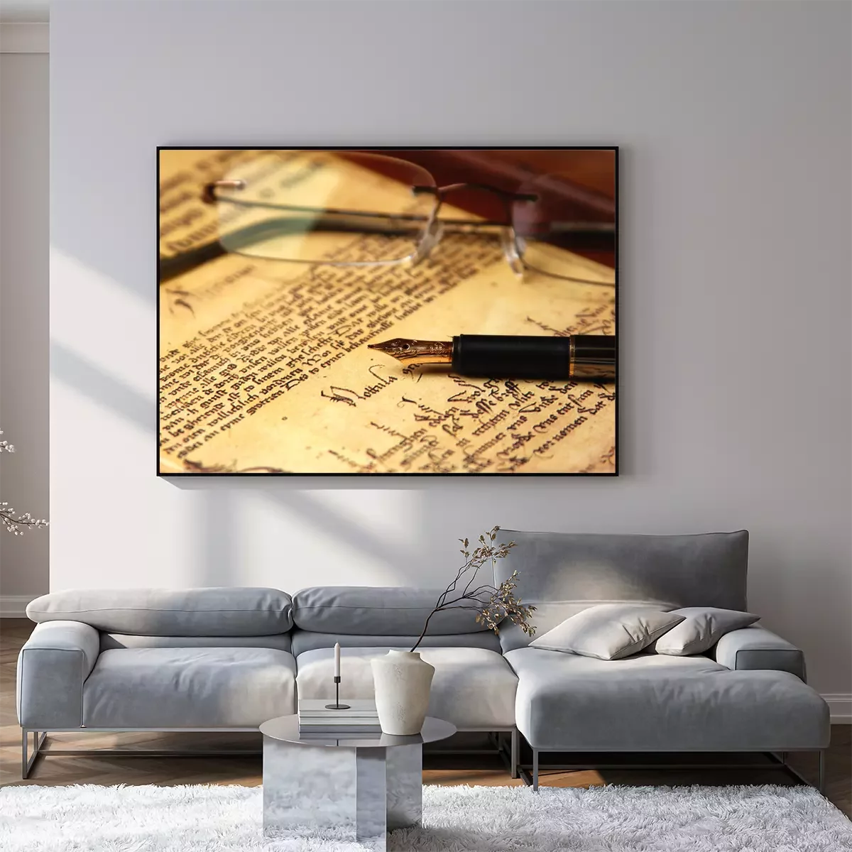 Poster: Feder und Brille auf ein Buch gelegt