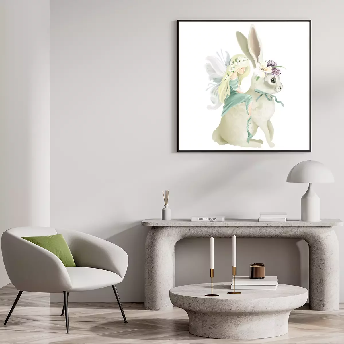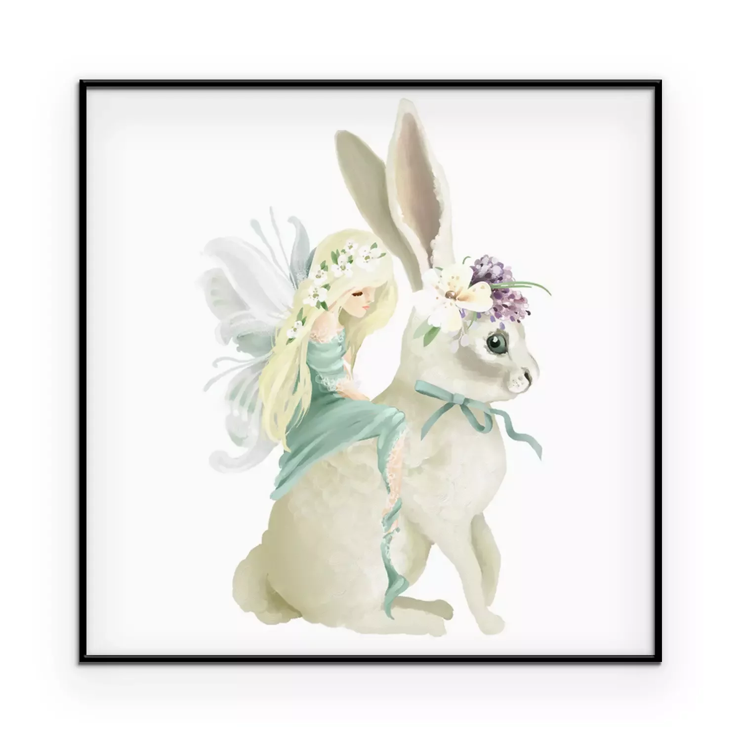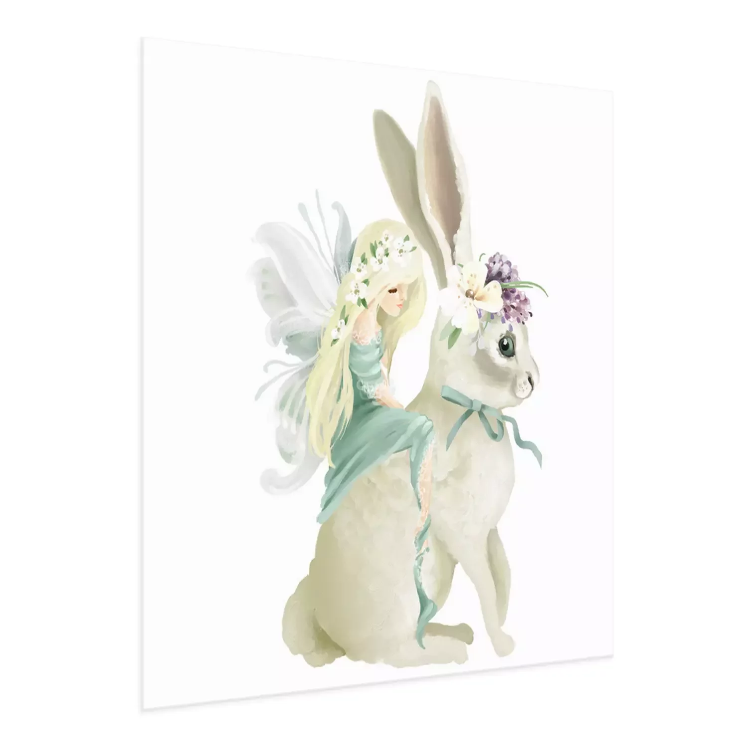 Poster: Fee mit blondem Haar auf einem Hasen sitzend
