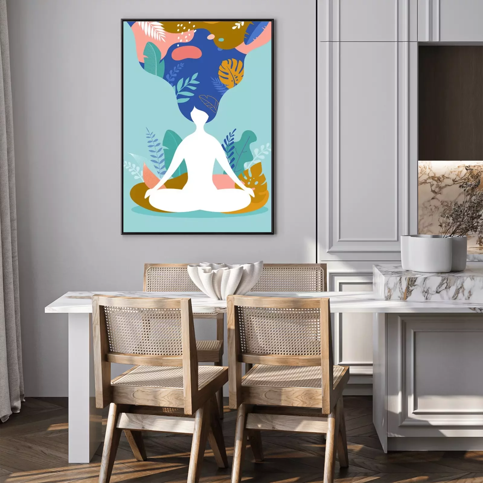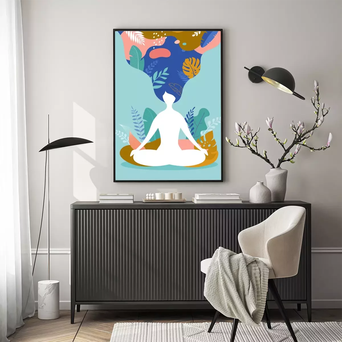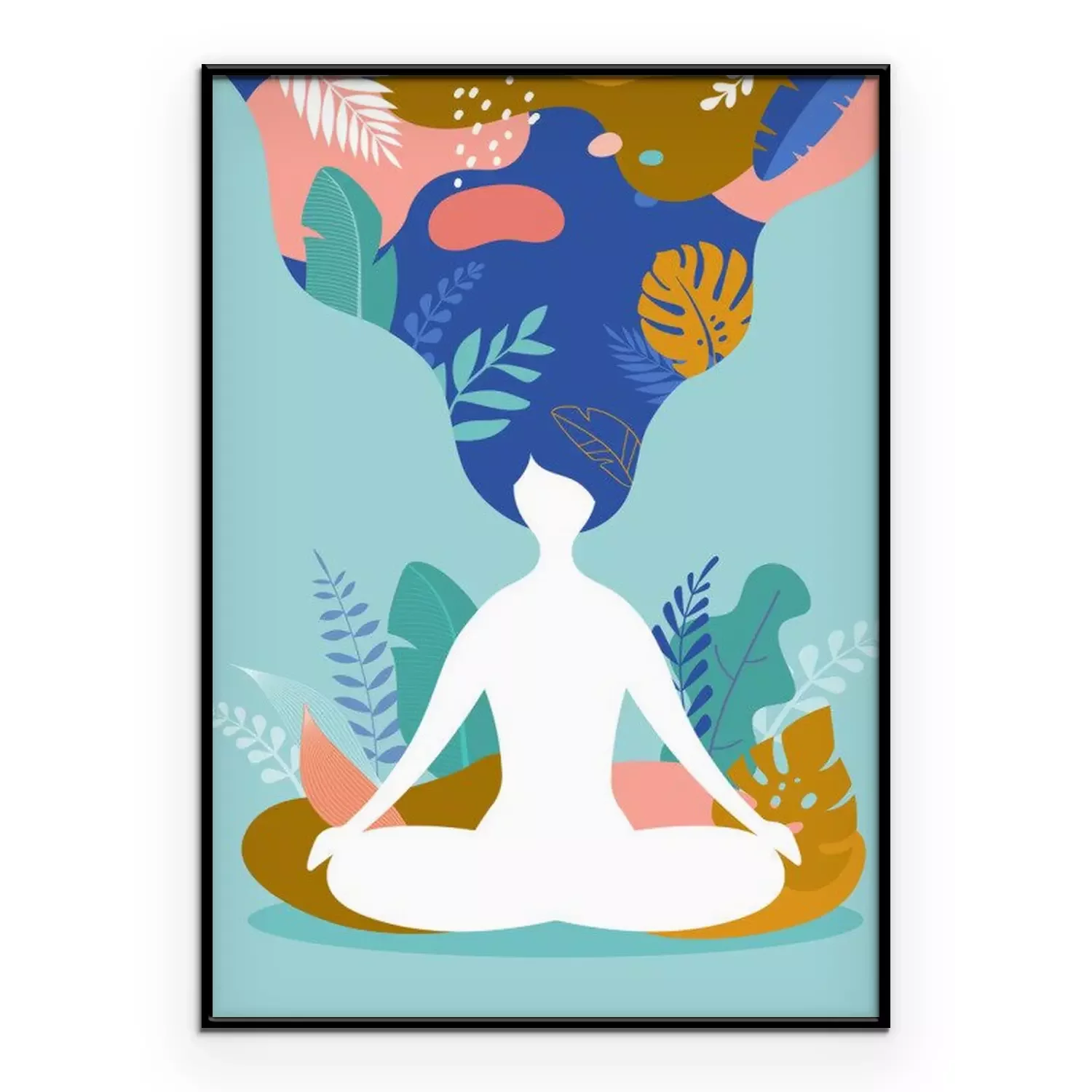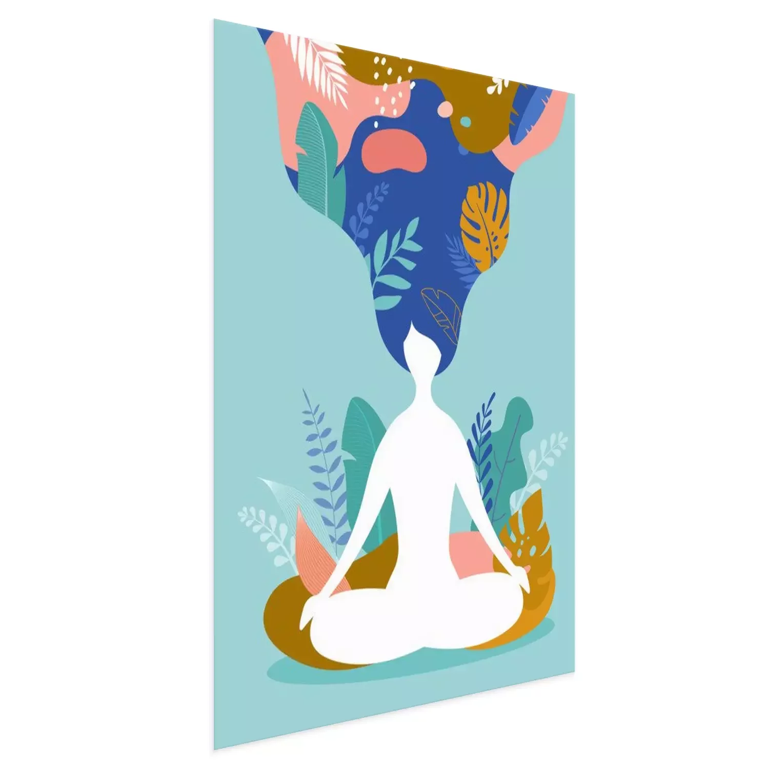 Poster: Figur einer meditierenden Frau zwischen exotischen Blättern