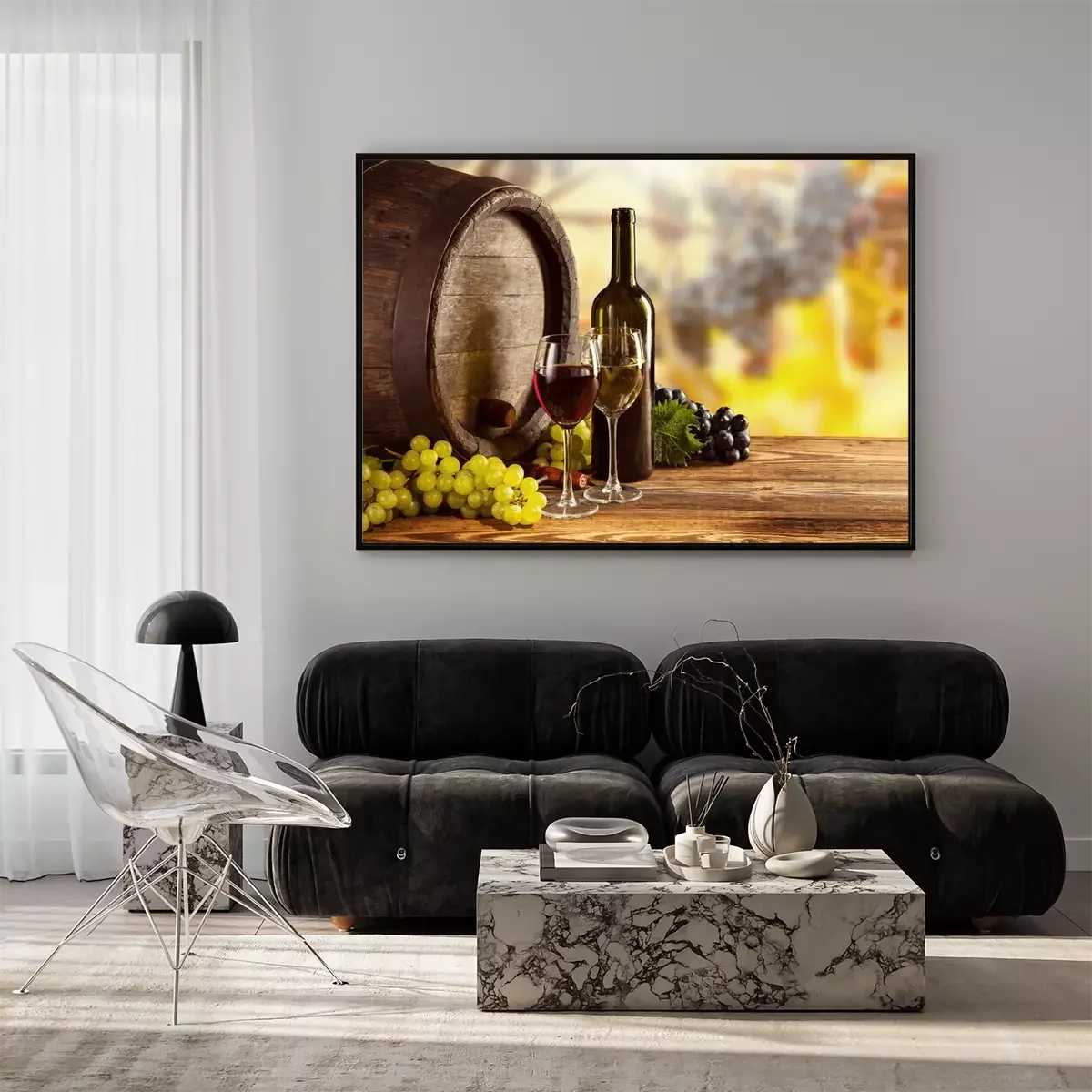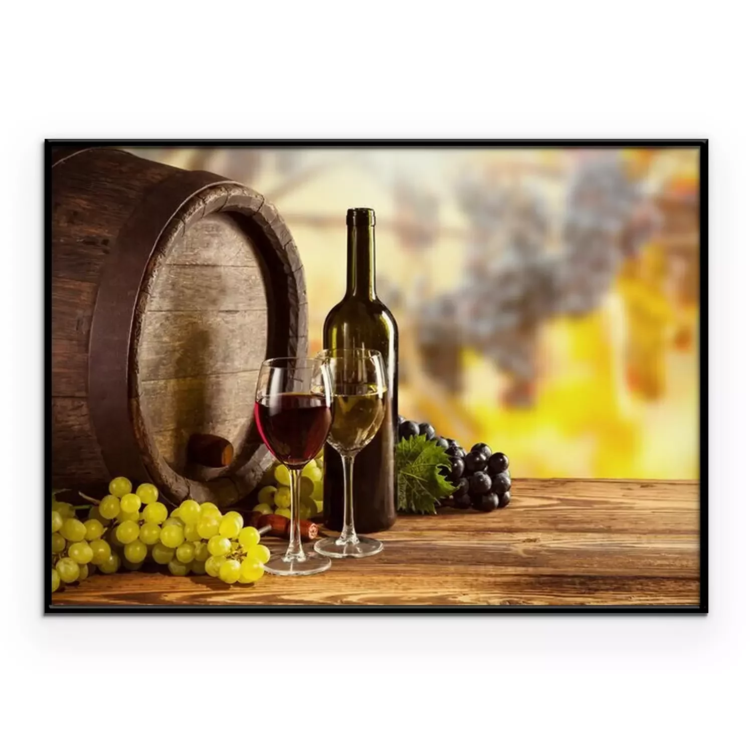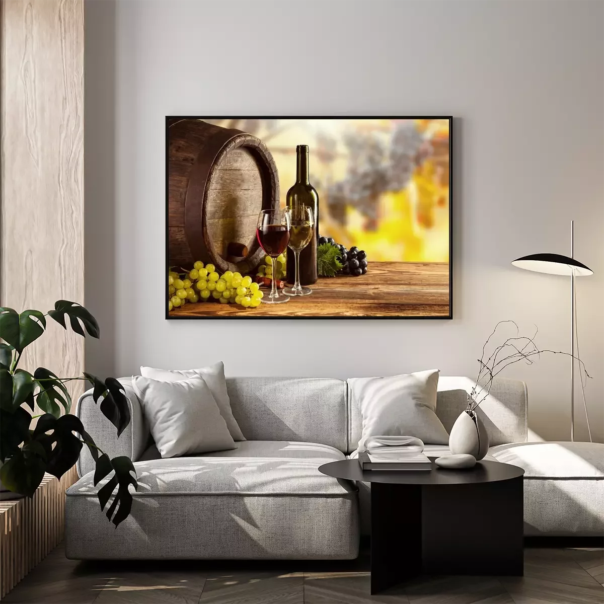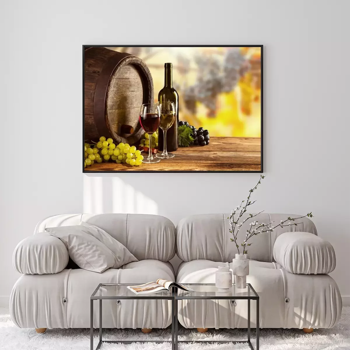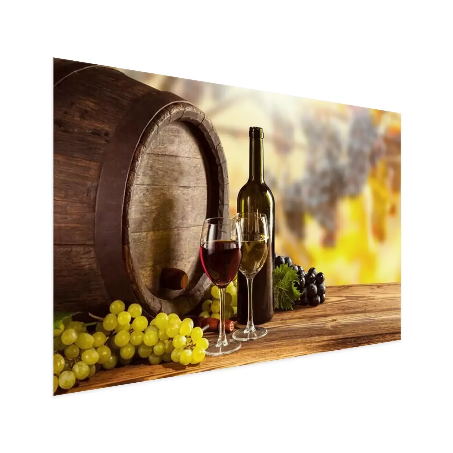Poster: Flaschen und Gläser mit Wein neben dem Fass