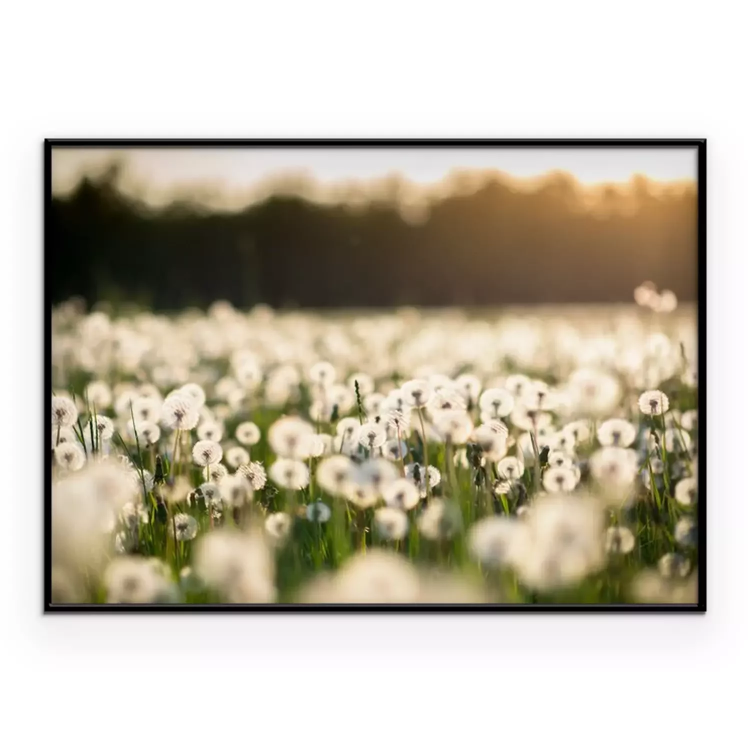 Poster: Flaumige Blumen auf einer Wiese bei Sonnenaufgang