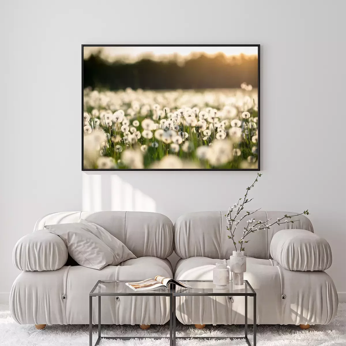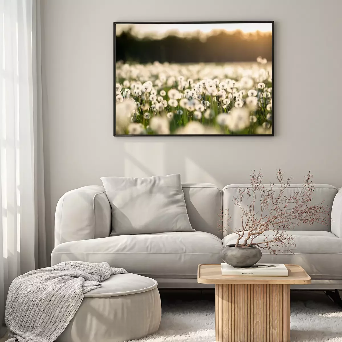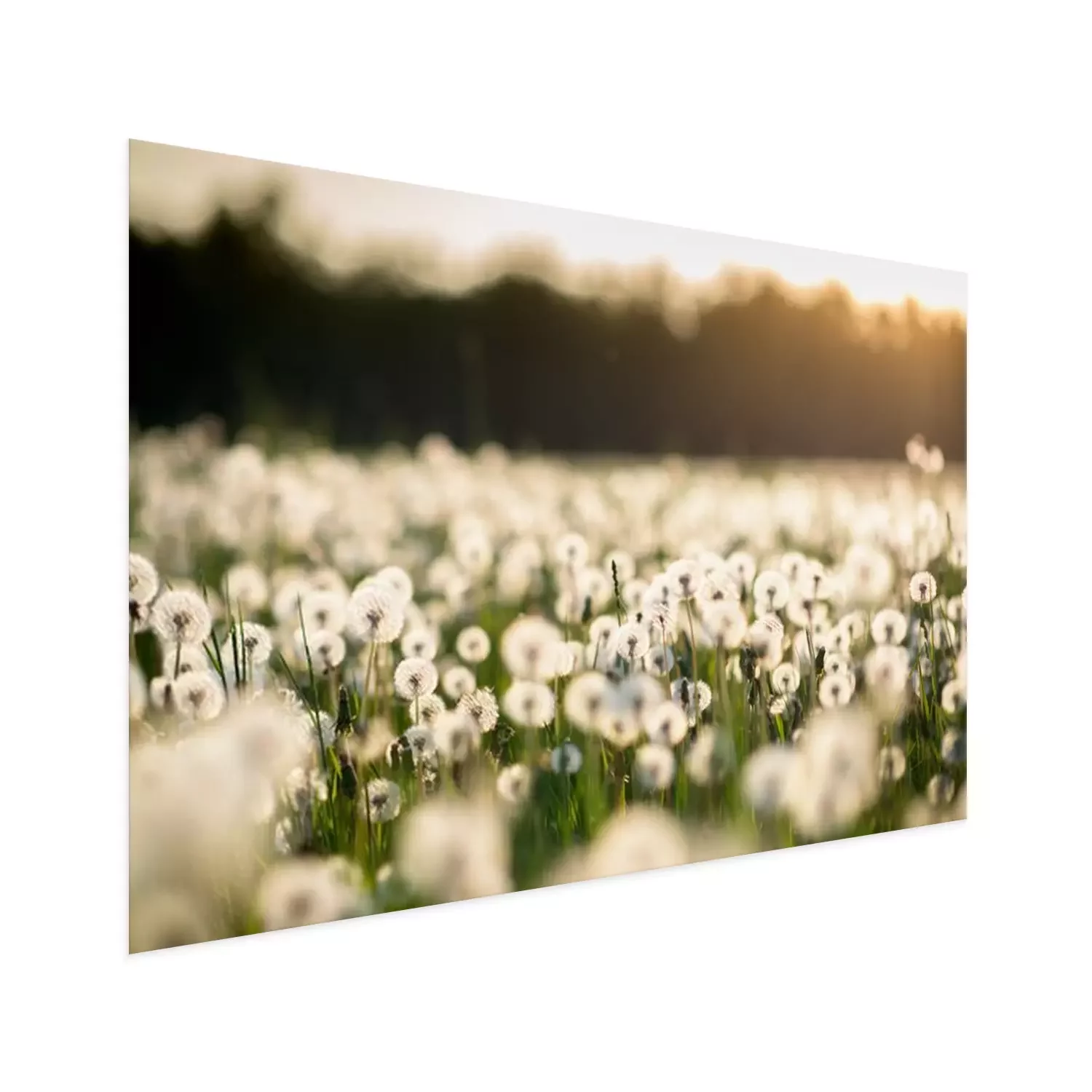 Poster Flaumige Blumen auf einer Wiese bei Sonnenaufgang