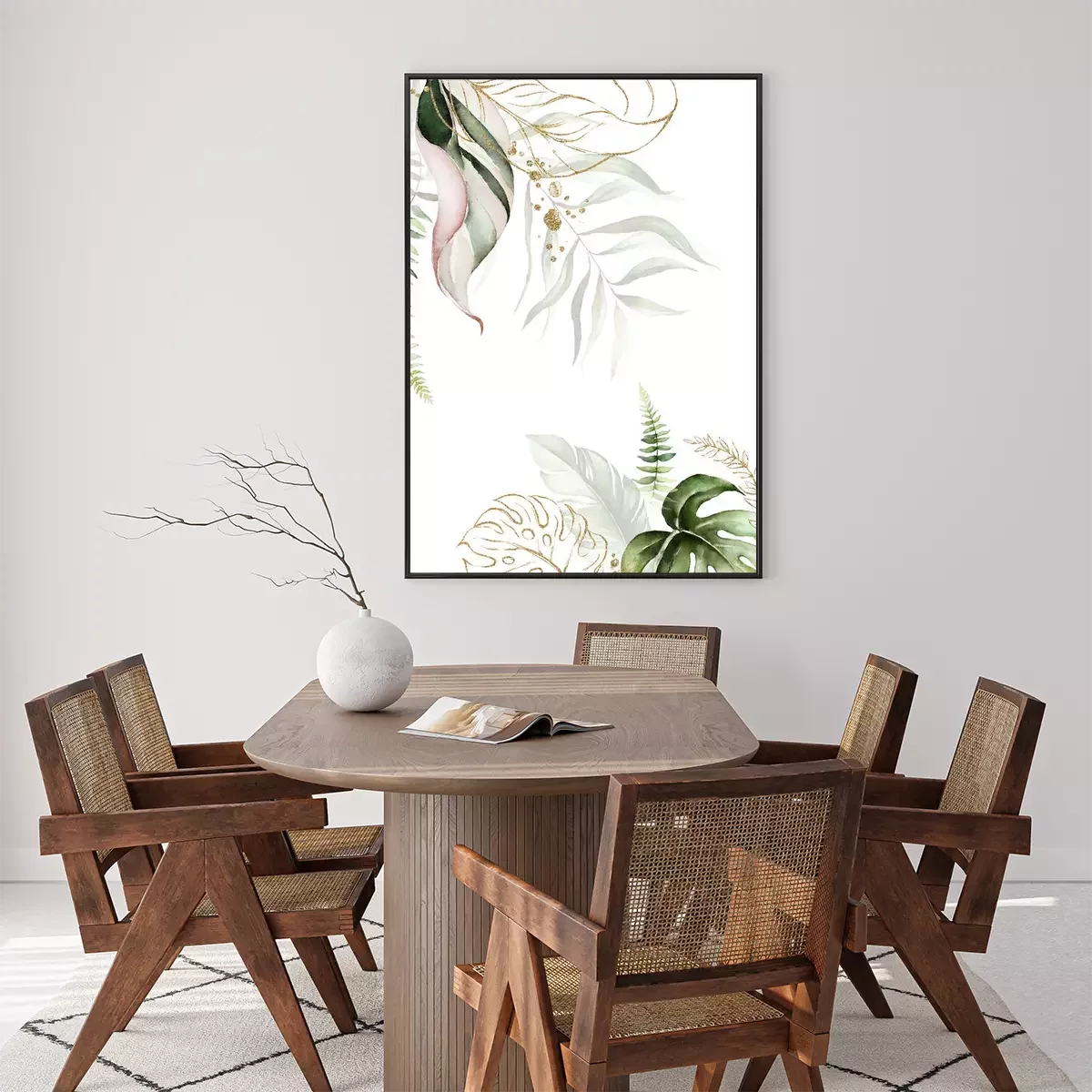 Watercolor tropical floral border - green, blush & gold leaves. For wedding stationary, greetings, wallpapers, fashion, background.