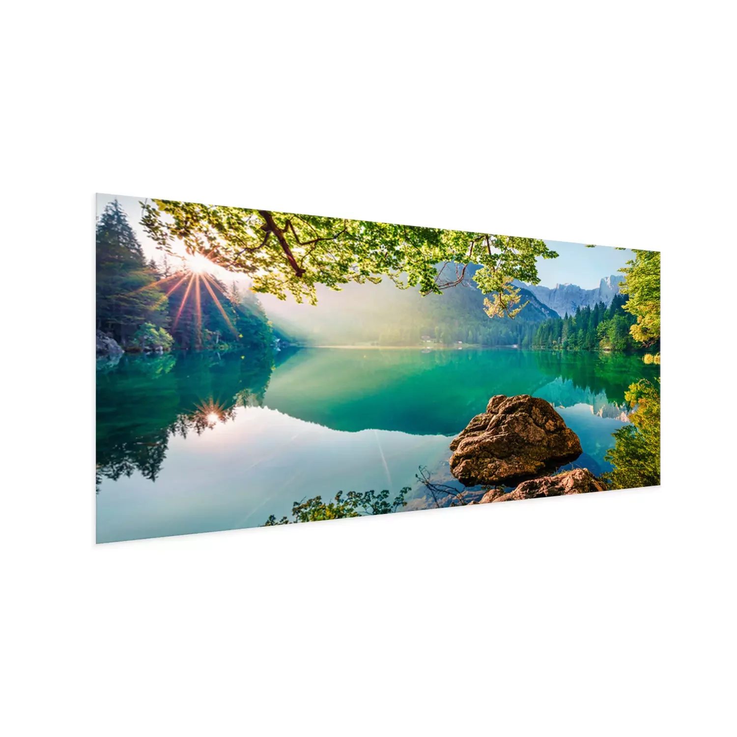 Calm morning view of Fusine lake. Colorful summer sunrise in Julian Alps with Mangart peak on background, Province of Udine, Italy, Europe. Beauty of nature concept background.