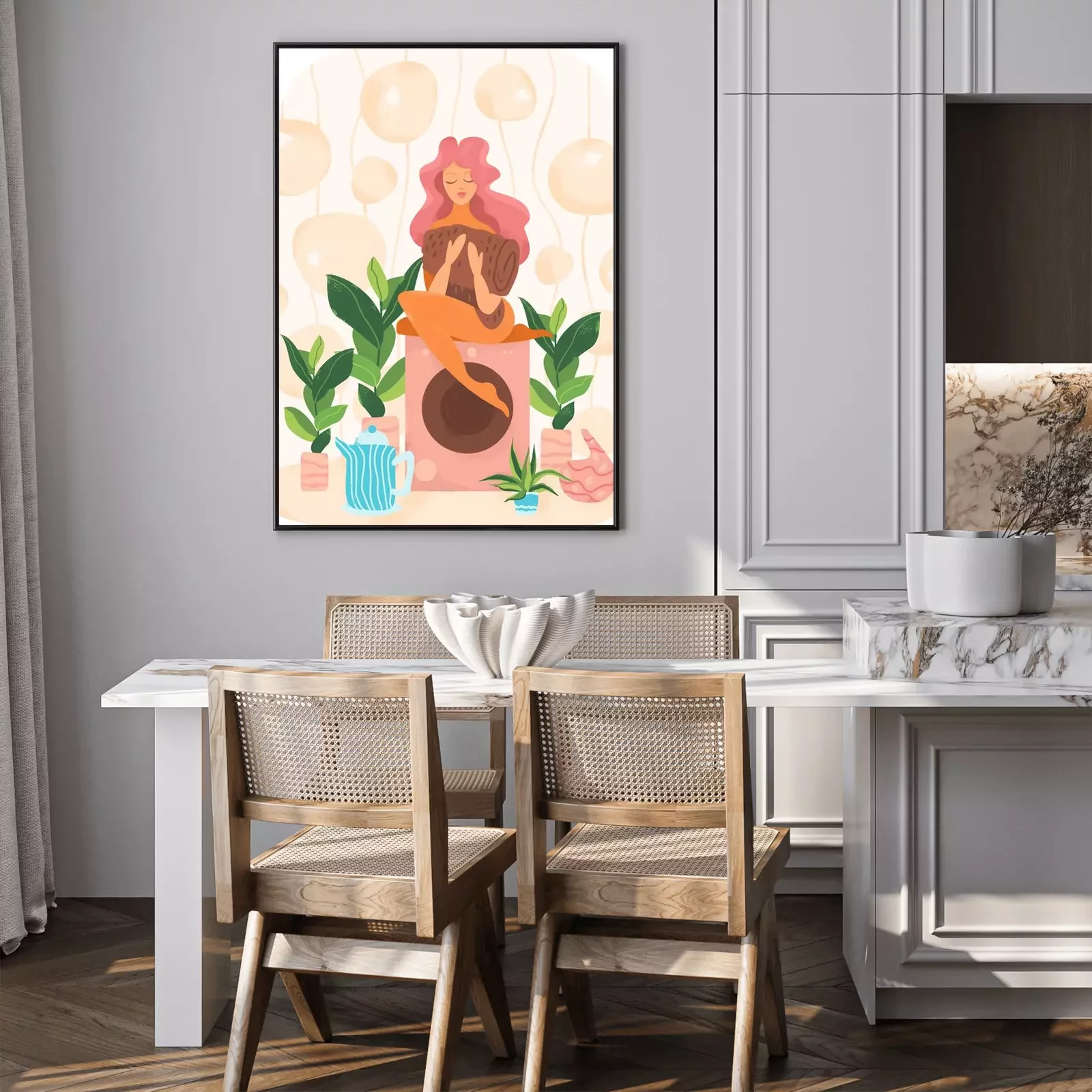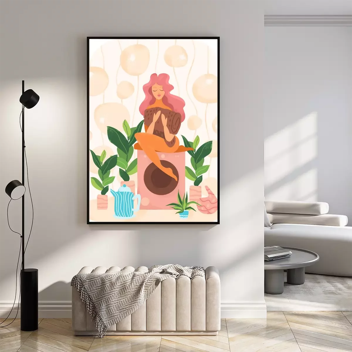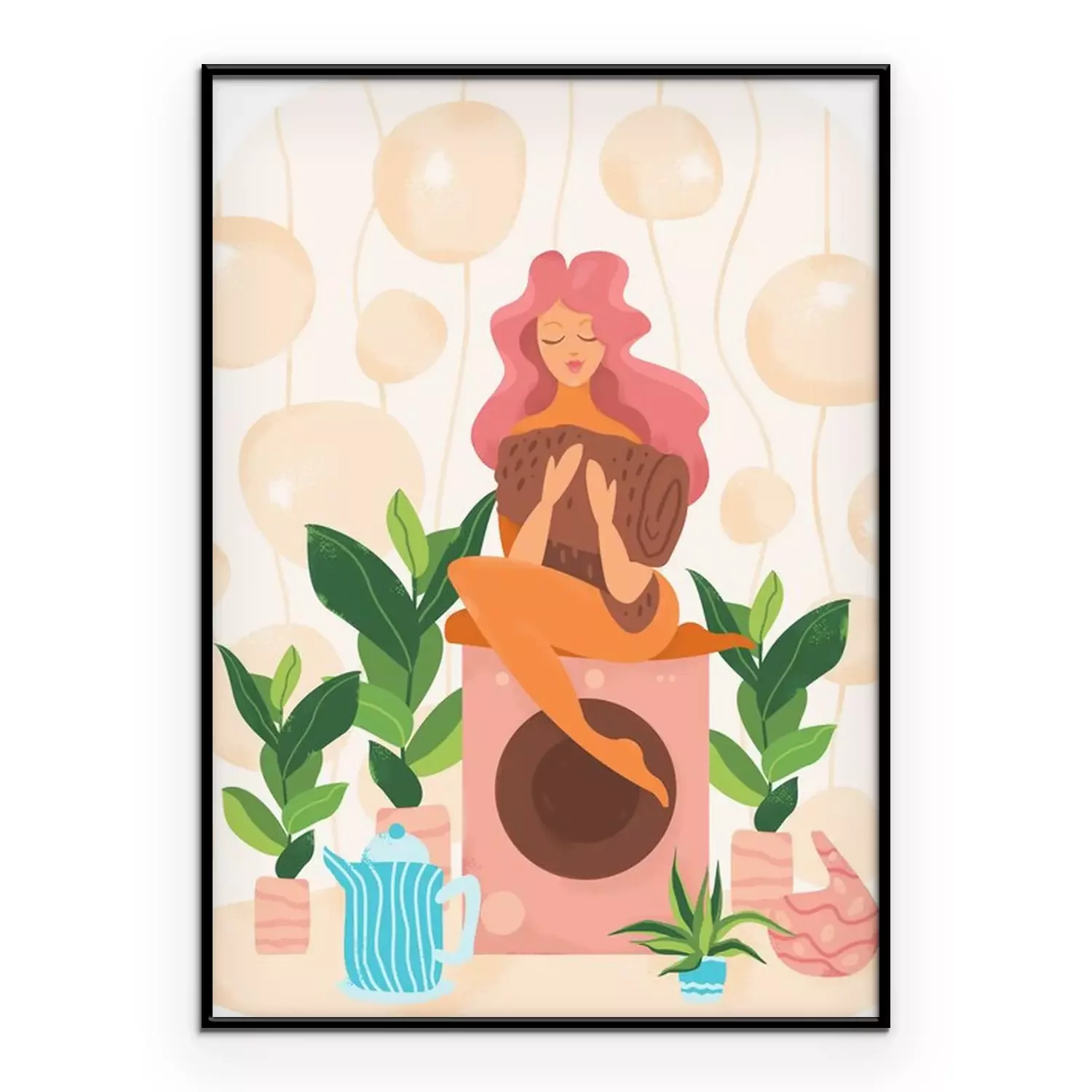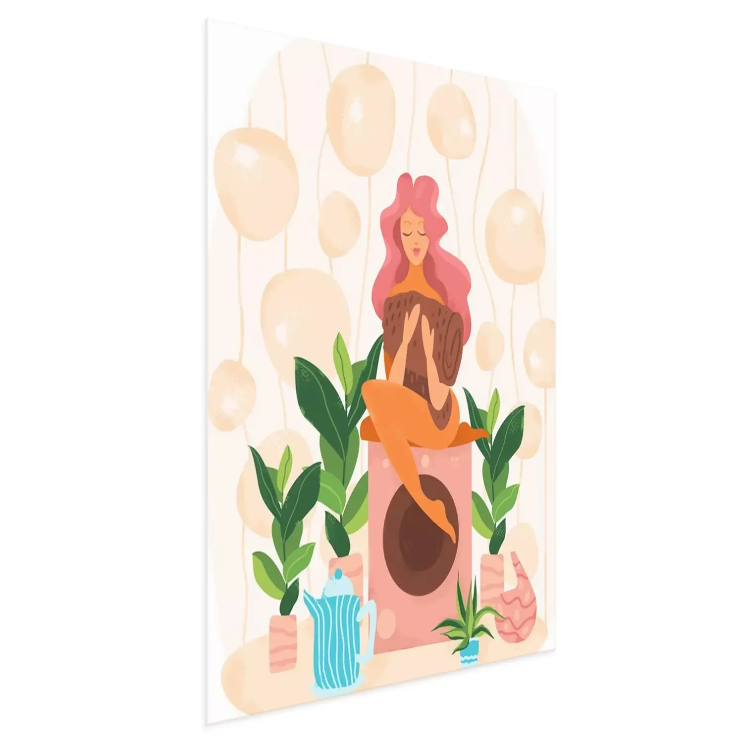 Poster: Frau mit rosa Haaren sitzt auf einer Waschmaschine