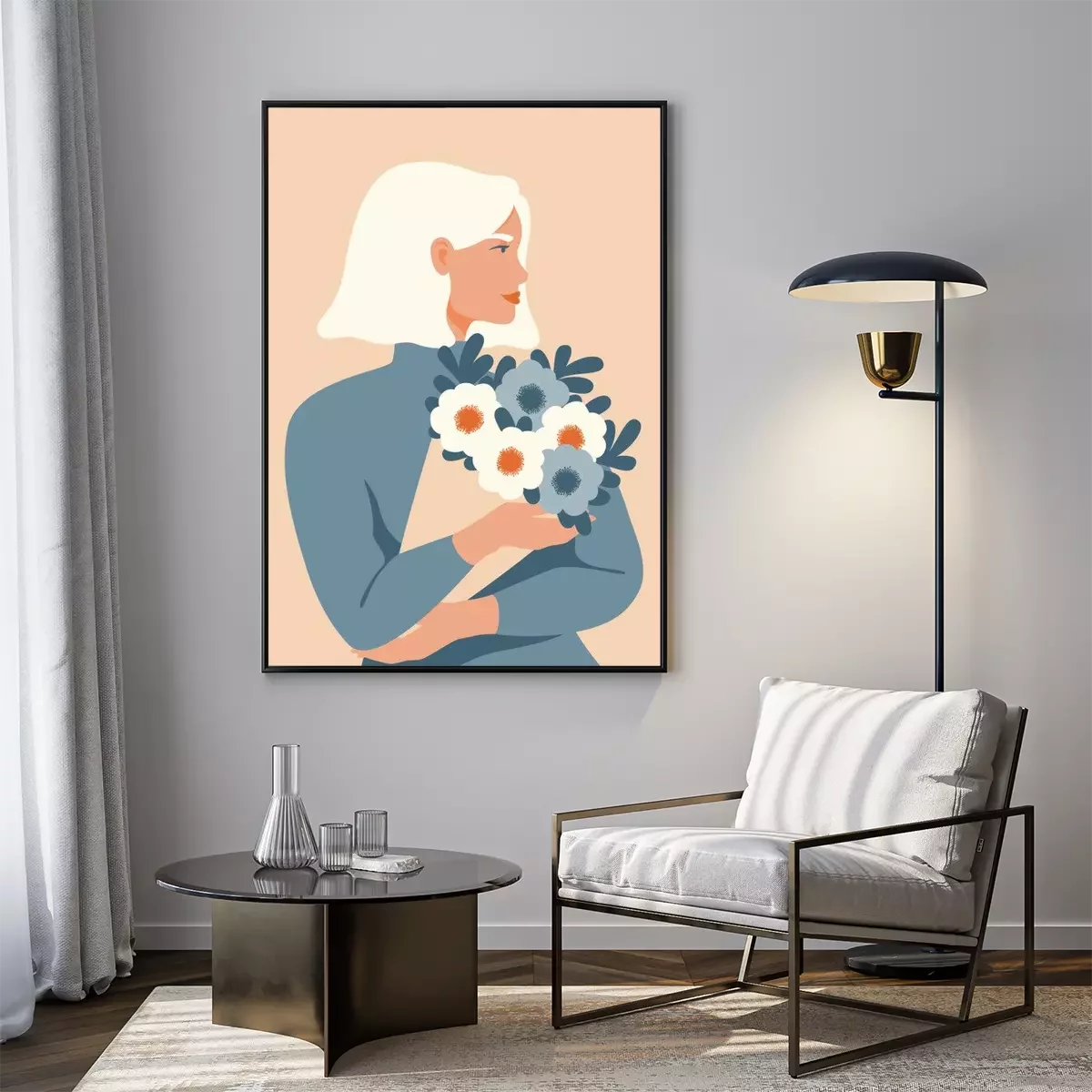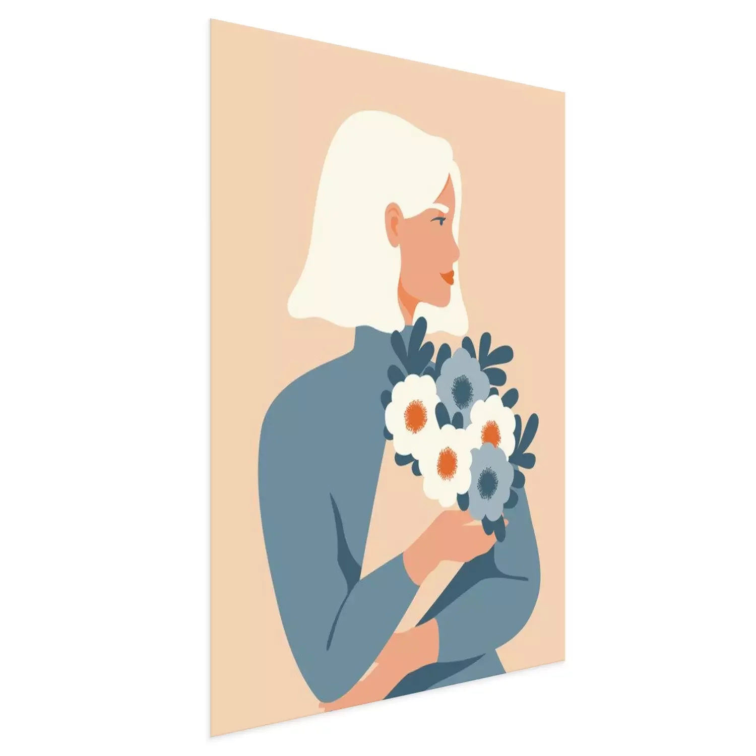 Poster Frau mit weißem Haar hält einen Blumenstrauß
