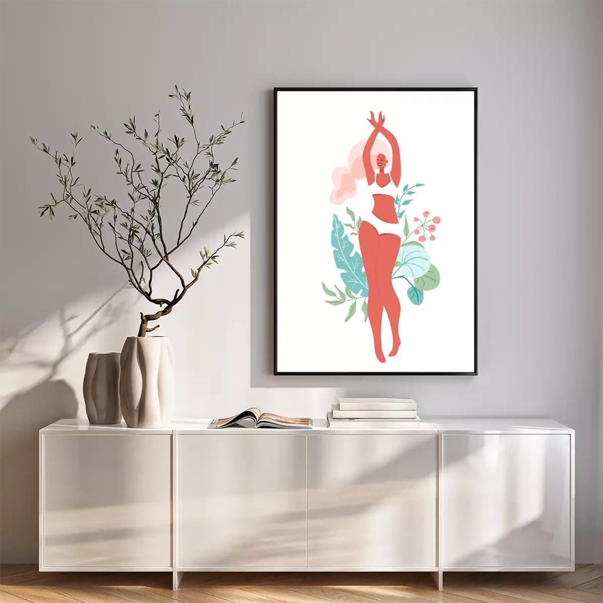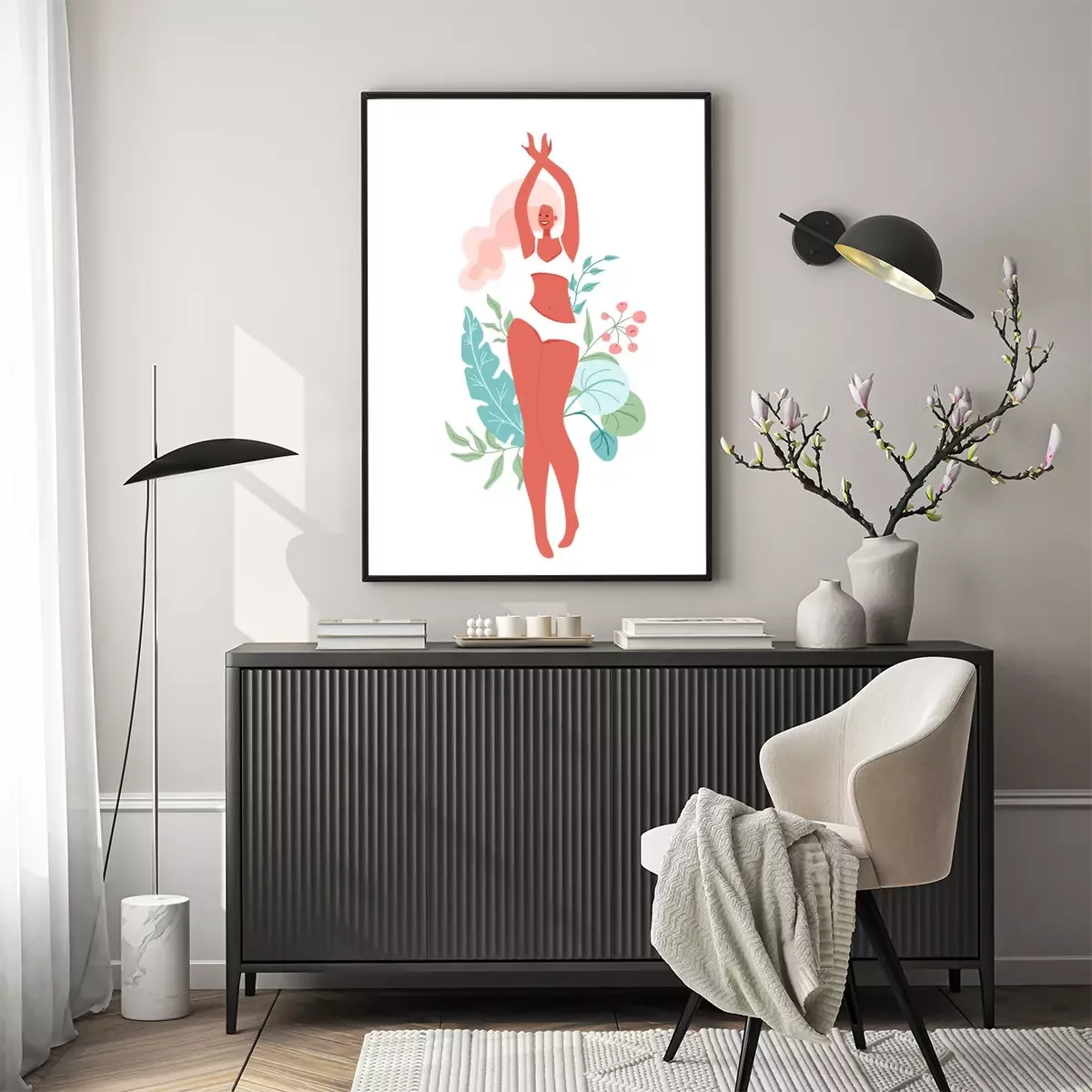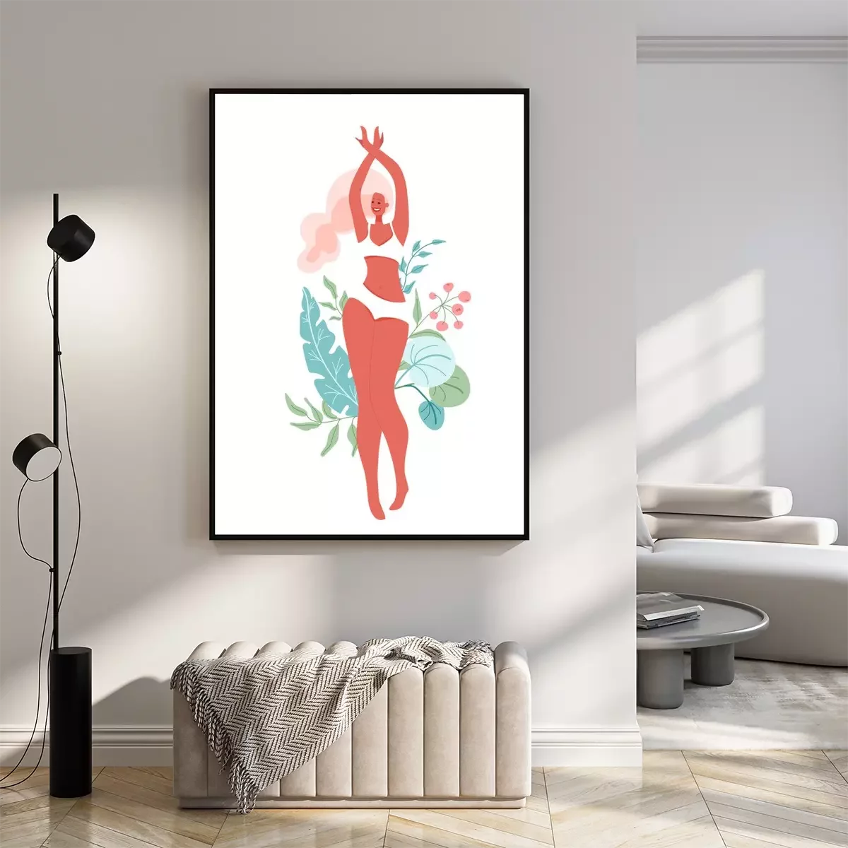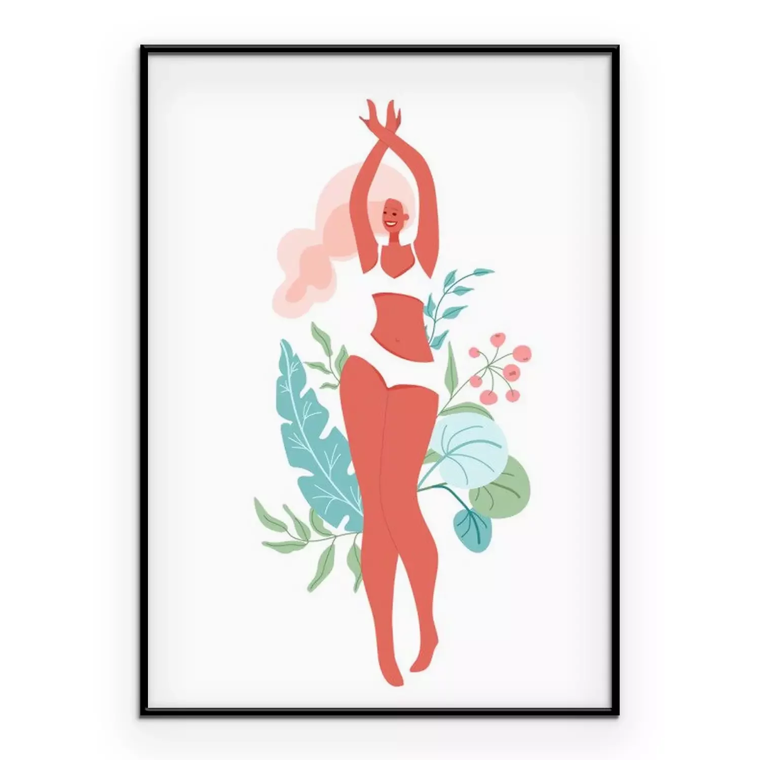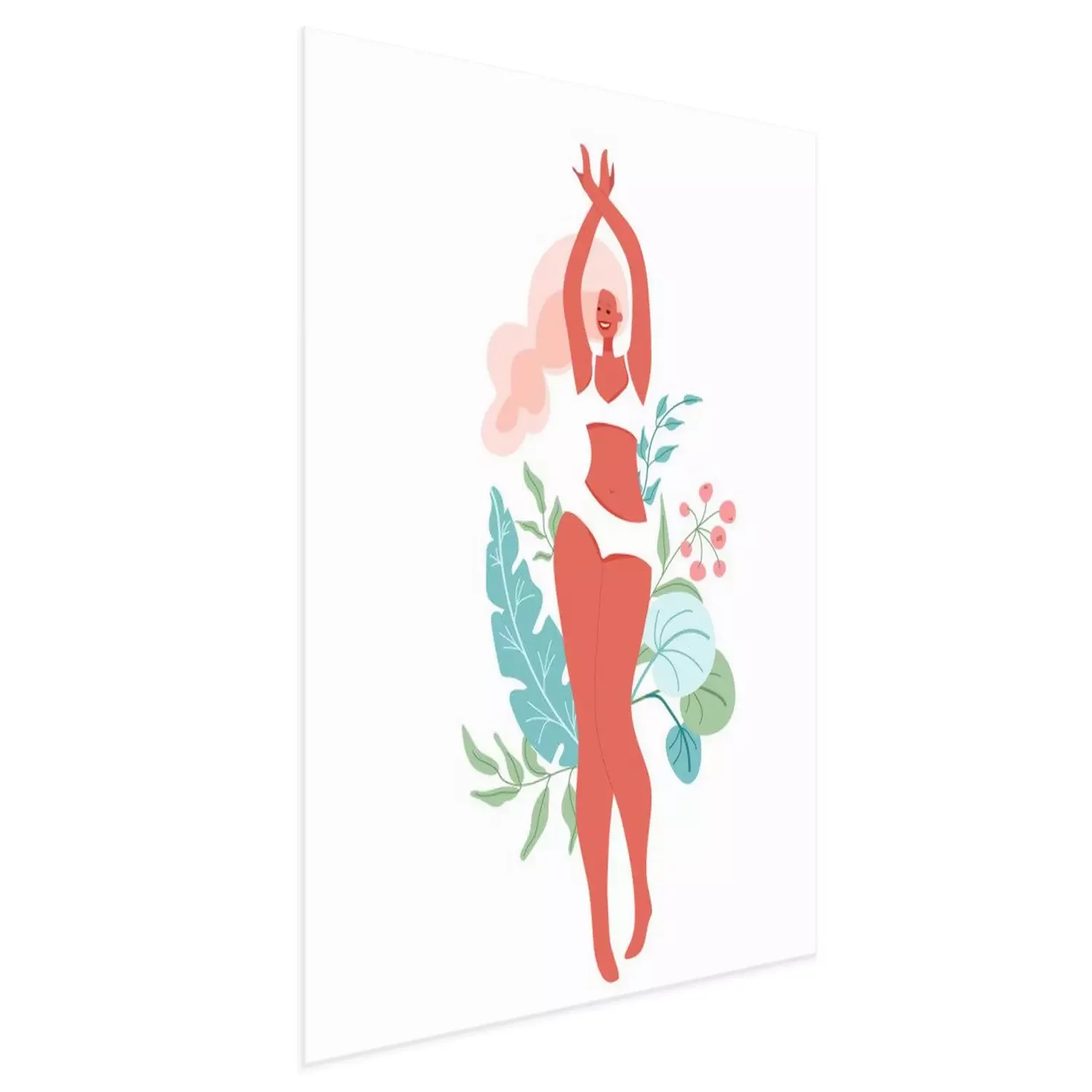 Poster: Fröhliche Frau umgeben von grünen Blättern