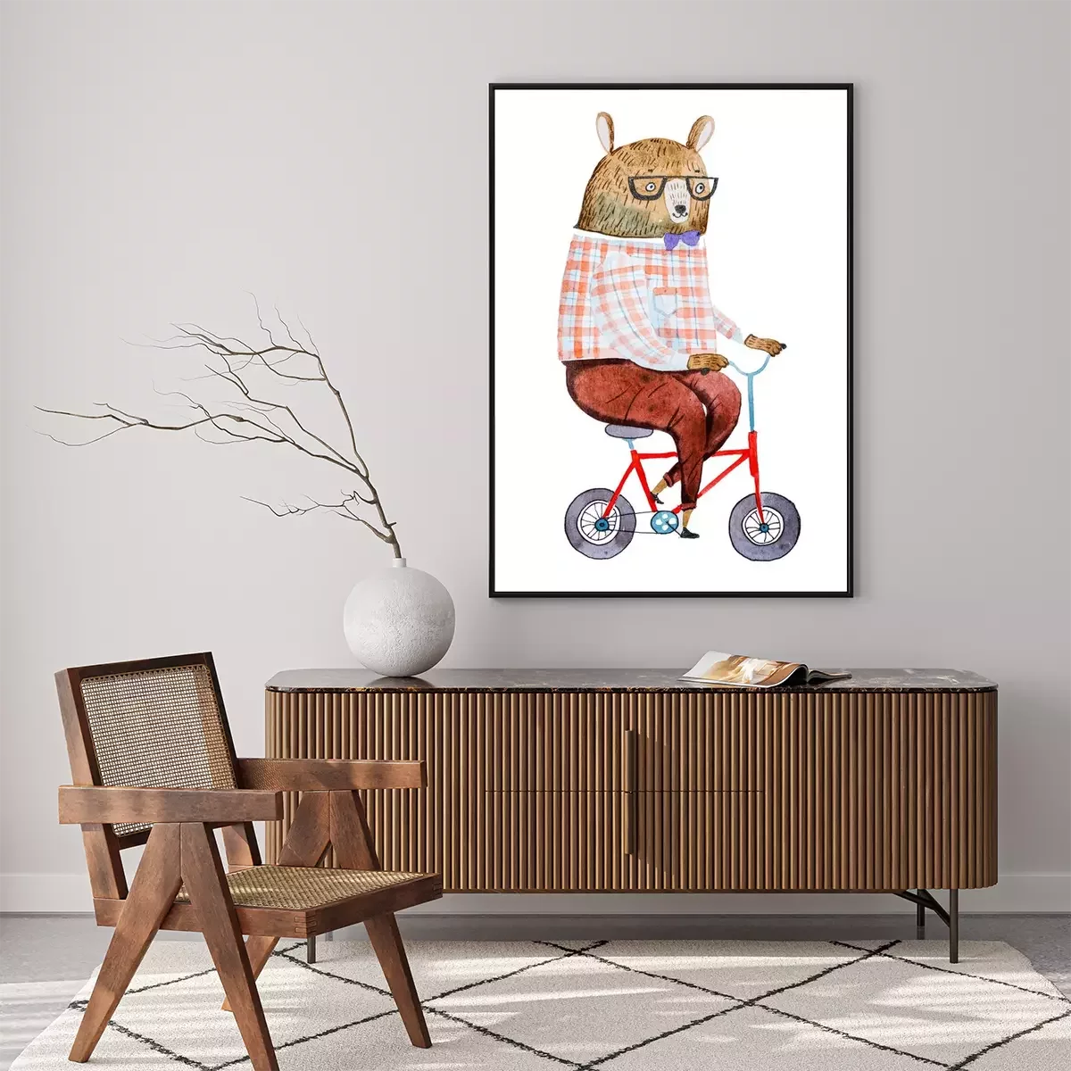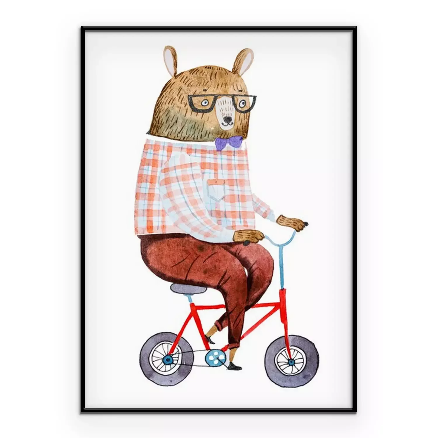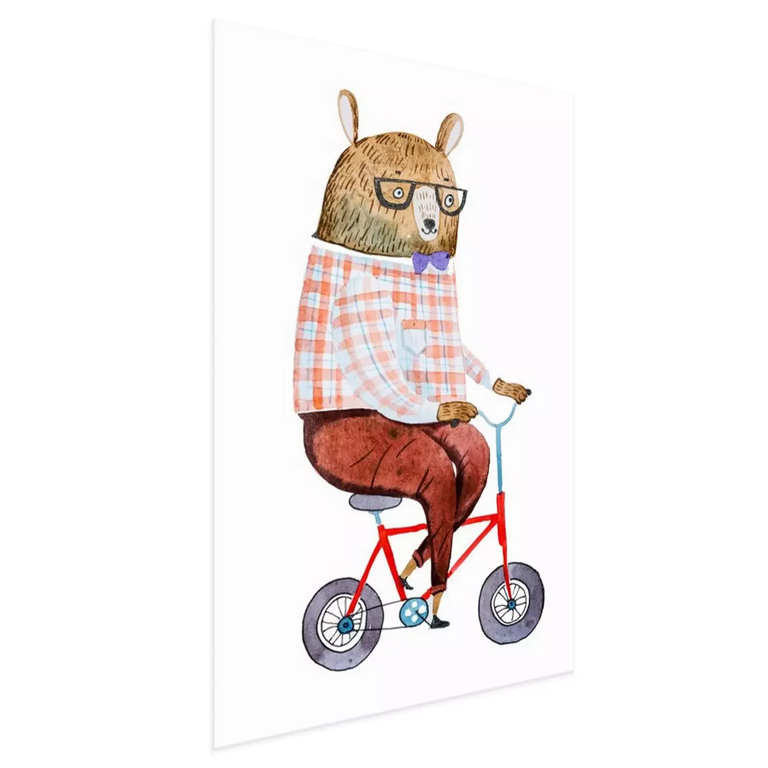 Poster: Gekleideter Bär auf einem kleinen Fahrrad