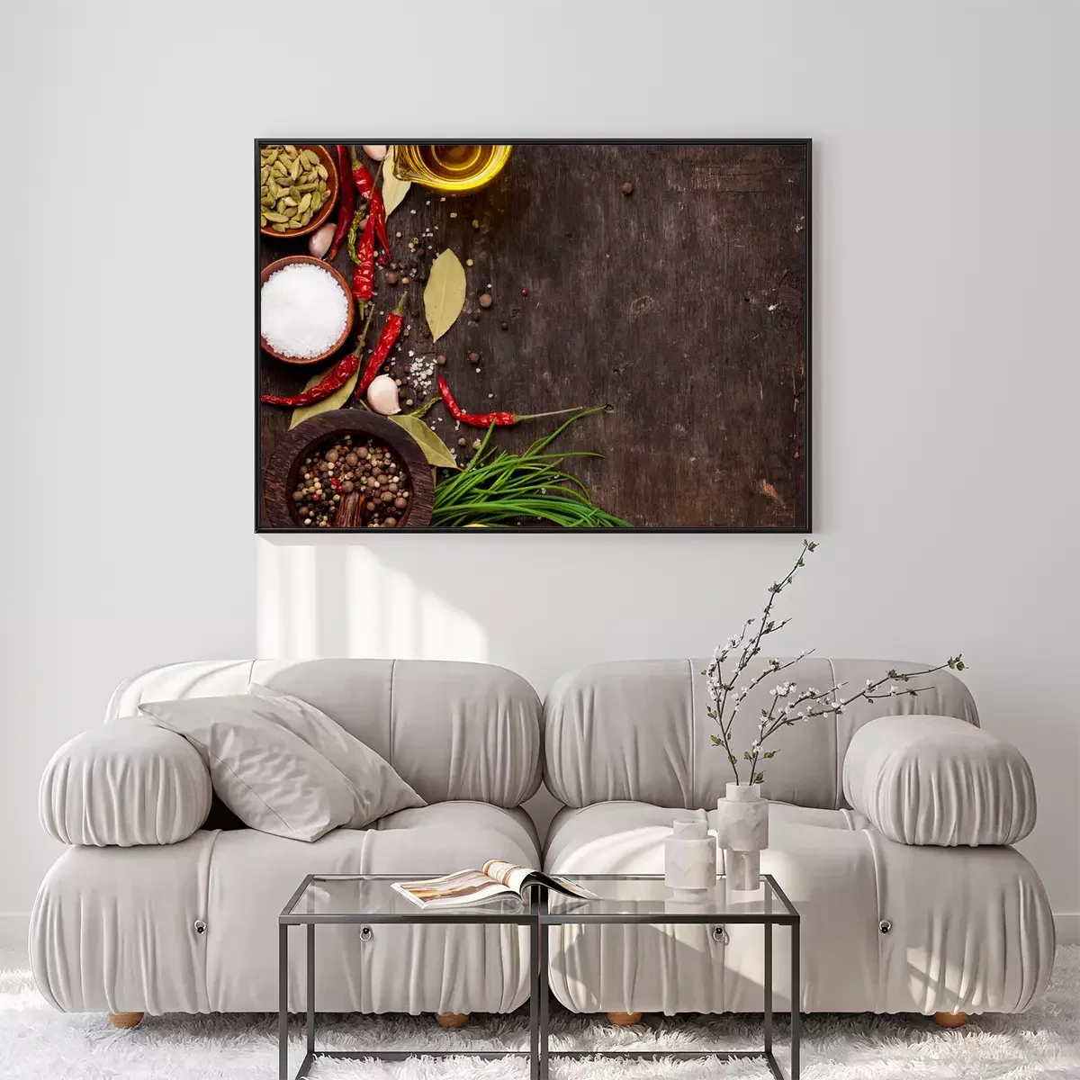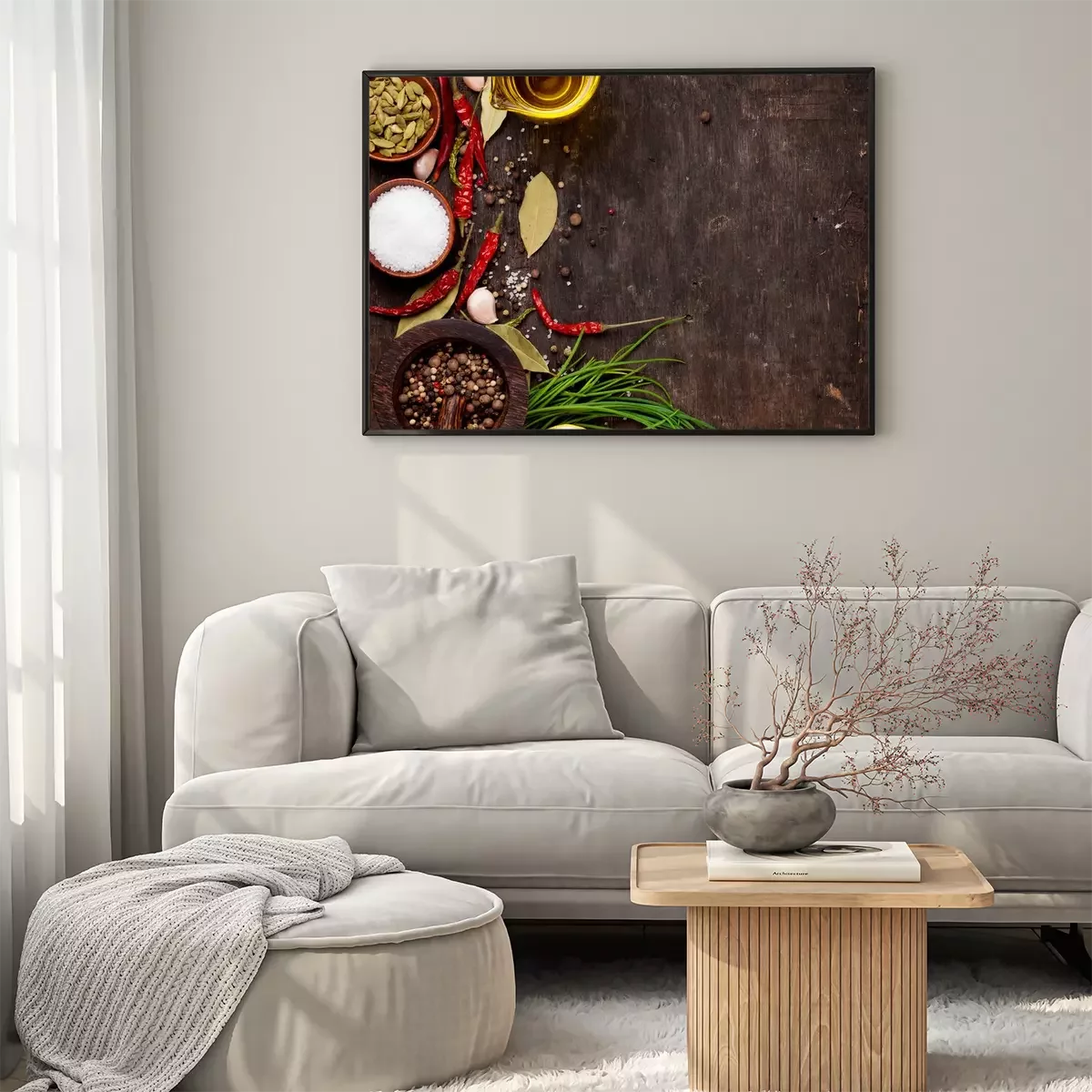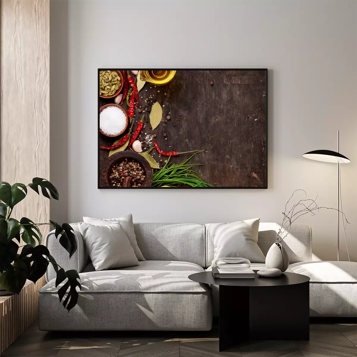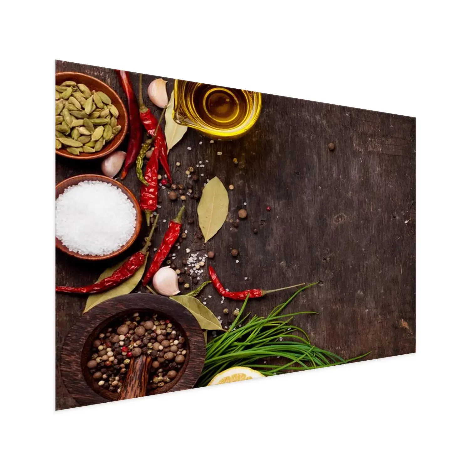 Poster: Gewürze auf einer dunklen Holztischplatte