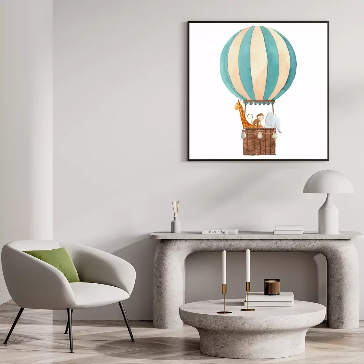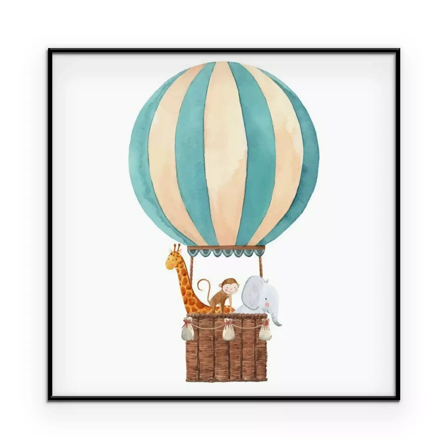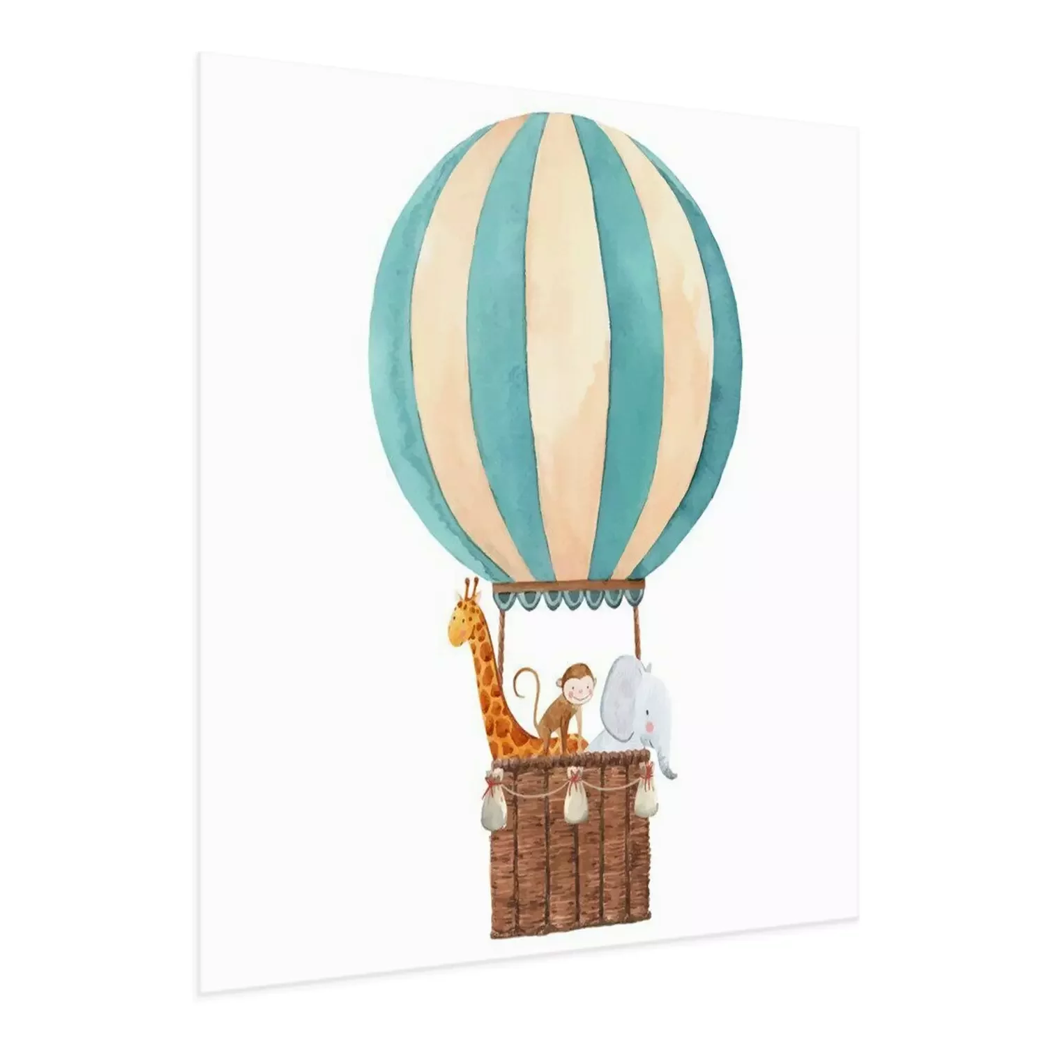 Poster: Giraffe, Baby und Elefant in einem fliegenden Ballon