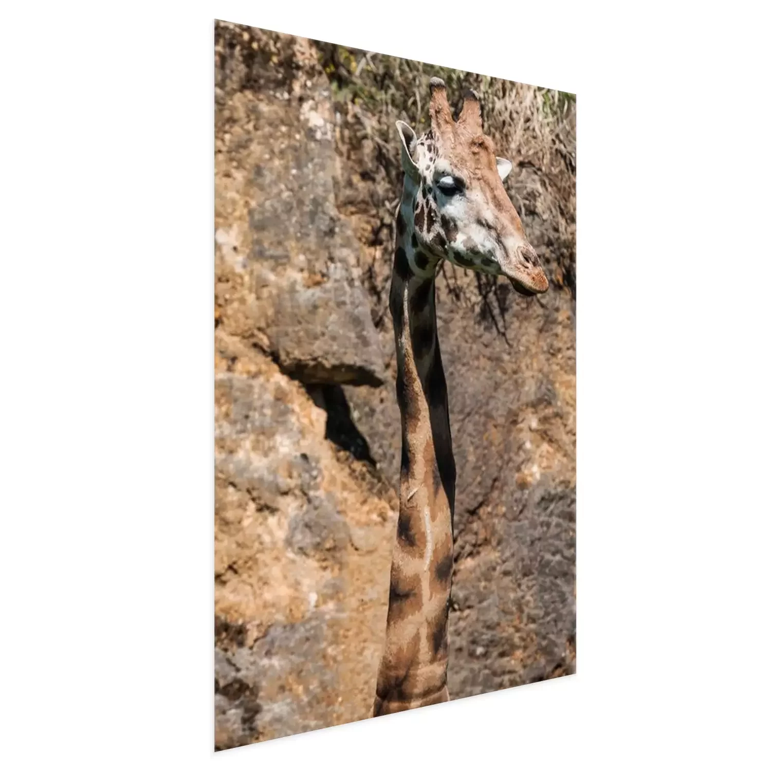 Stehende Giraffe auf dem Hintergrund von Felsen