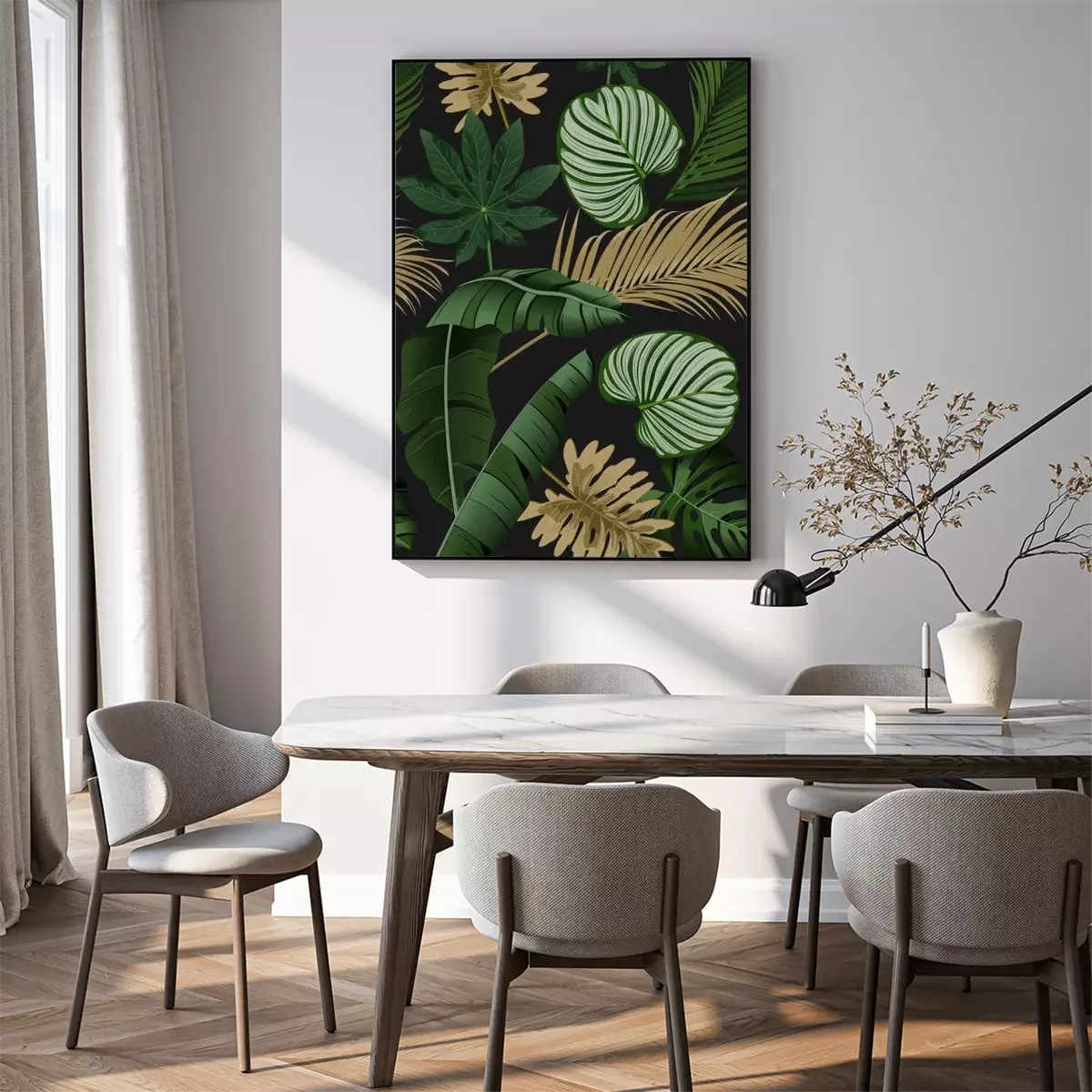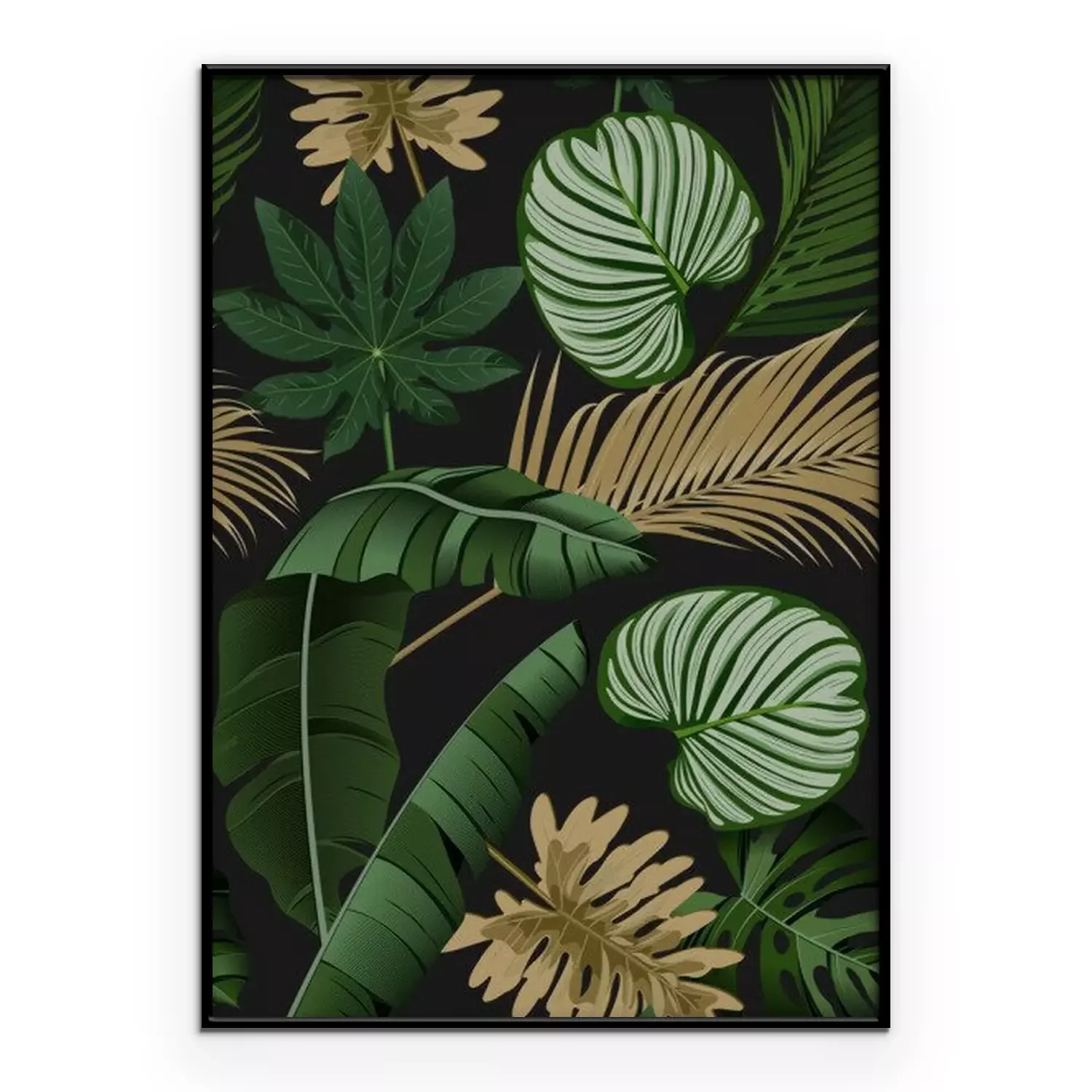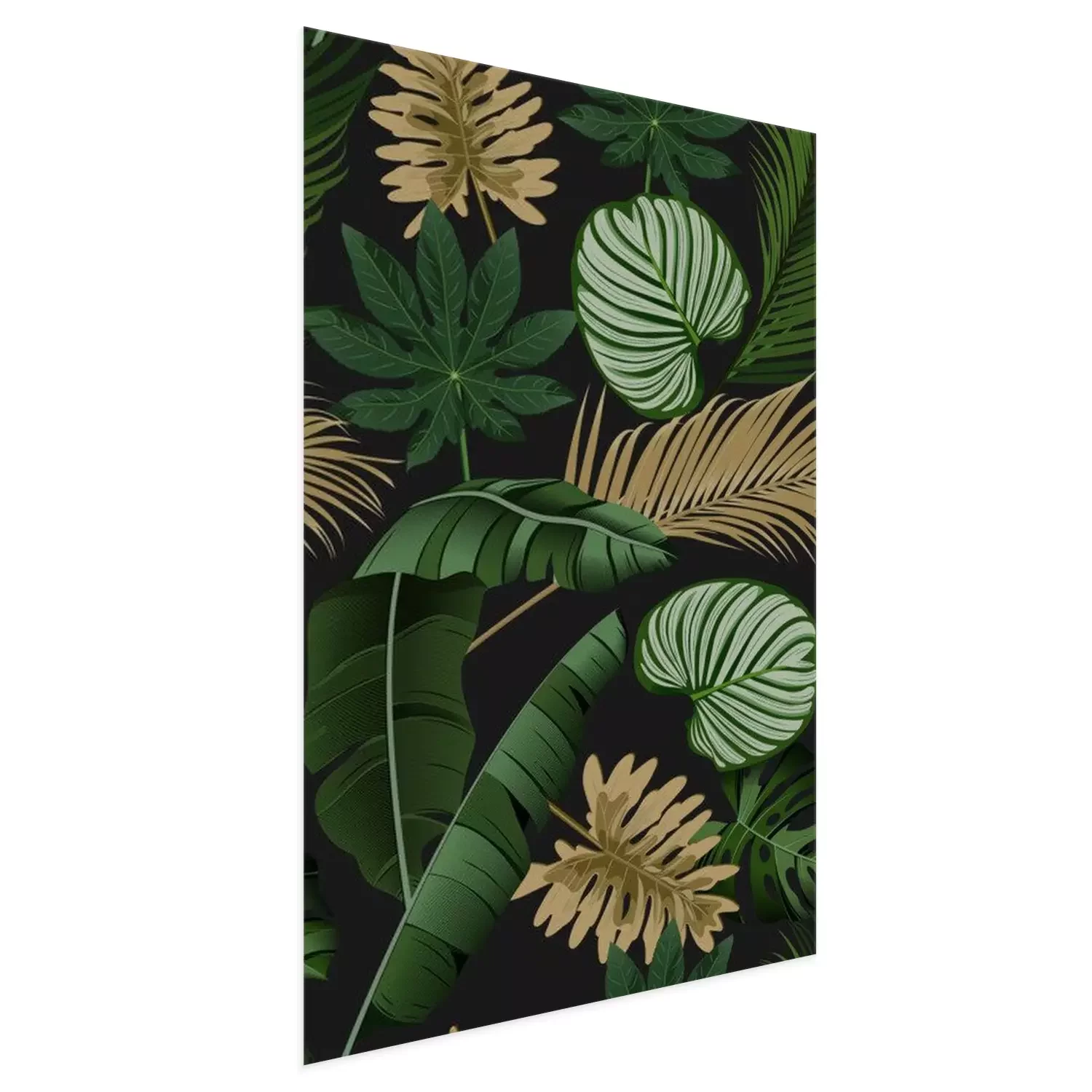 Poster: Goldene und grüne tropische Blätter auf dunklem Hintergrund