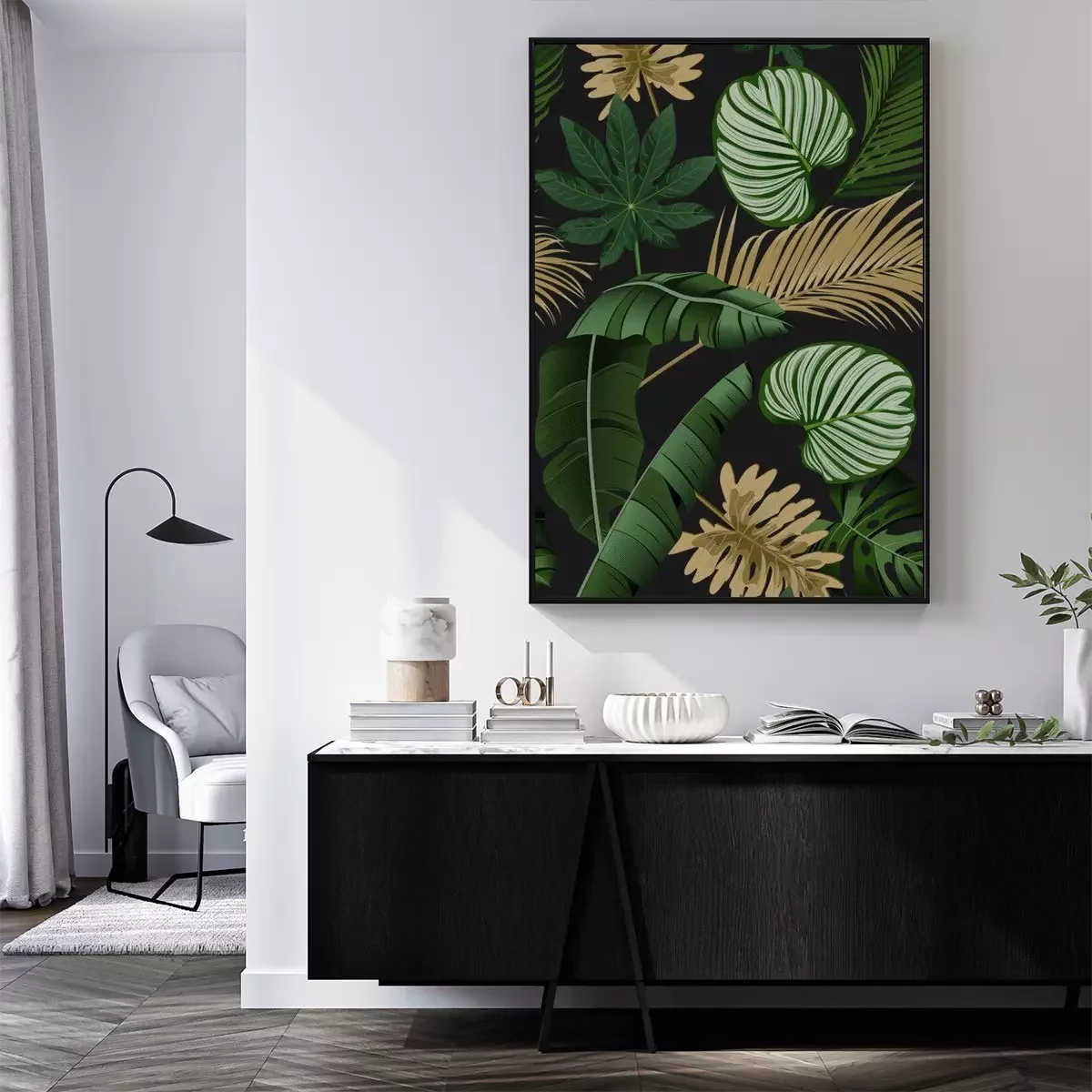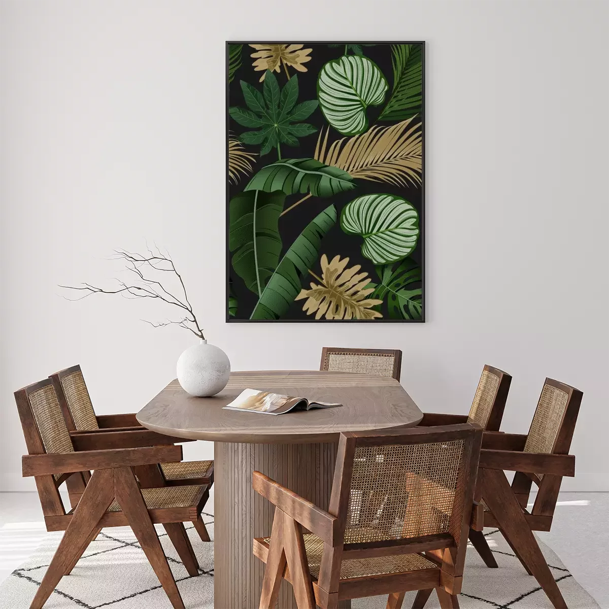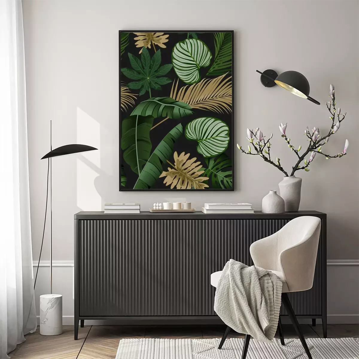 Poster: Goldene und grüne tropische Blätter auf dunklem Hintergrund