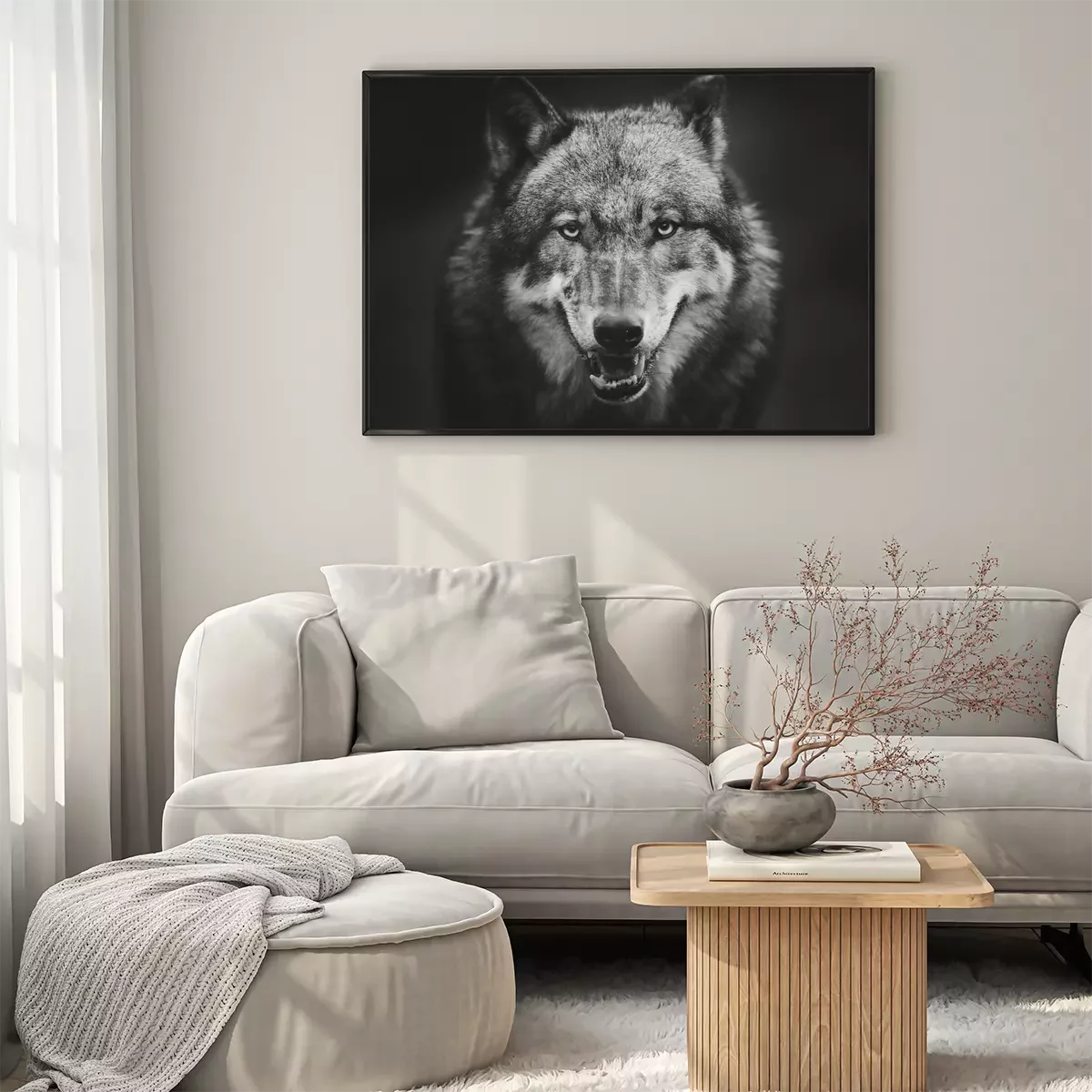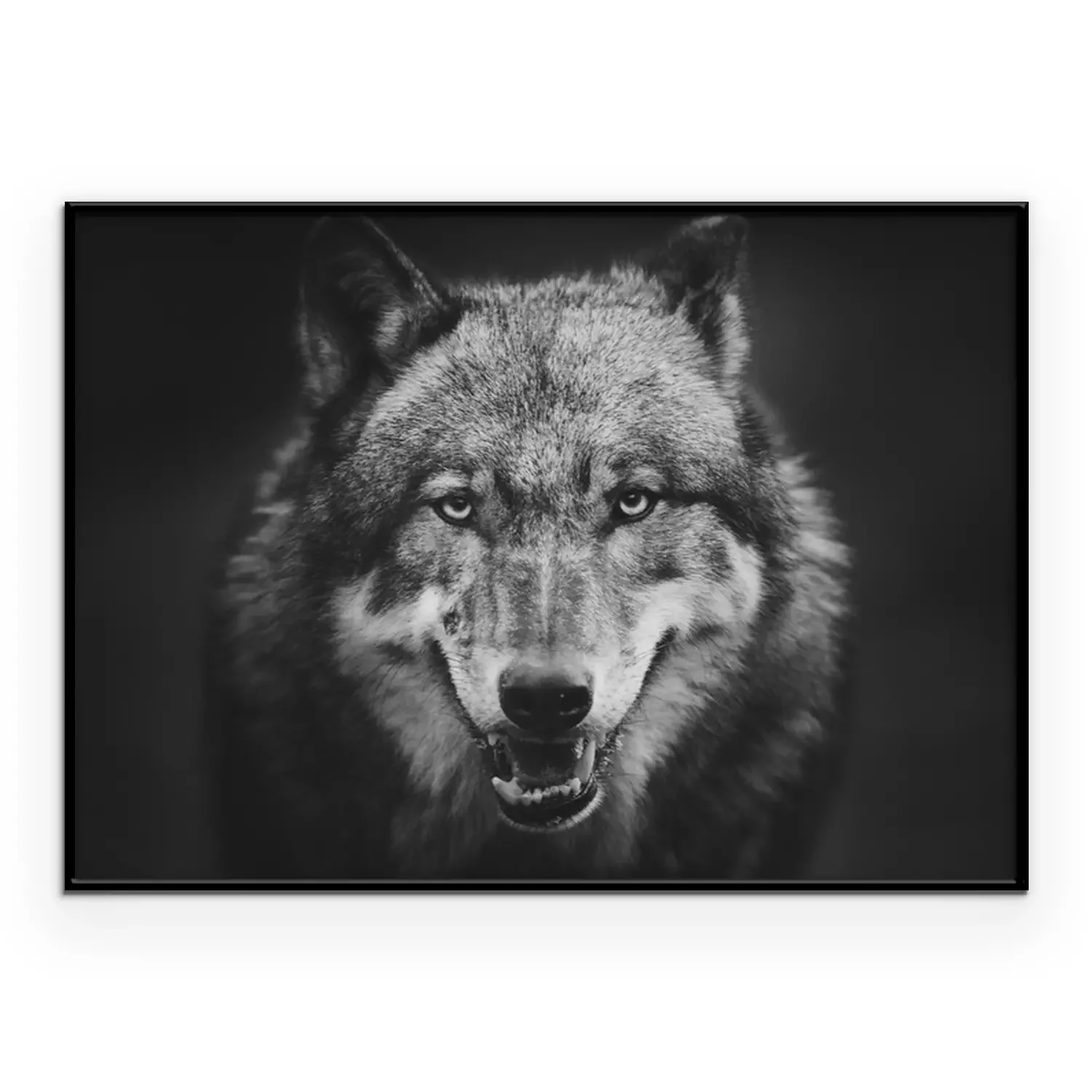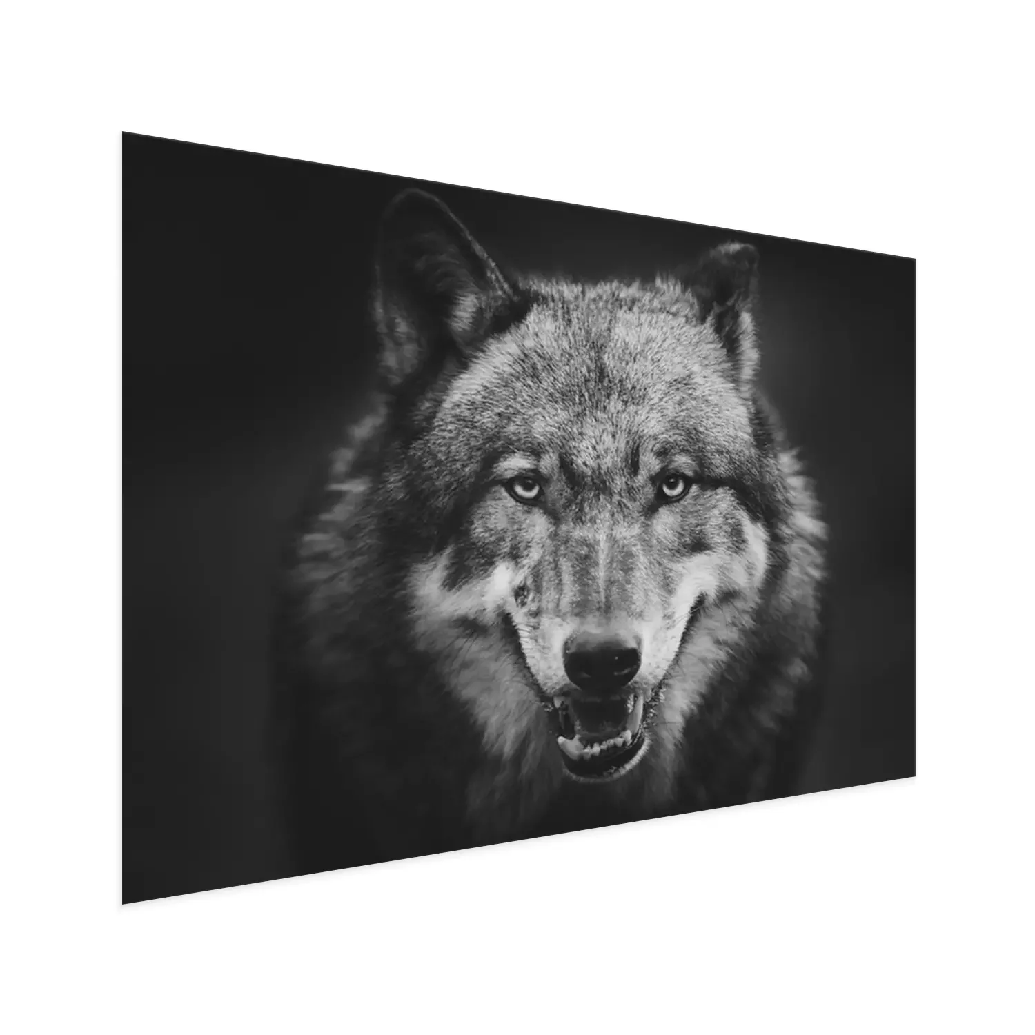 Poster: Grauer Wolf auf dunklem Hintergrund