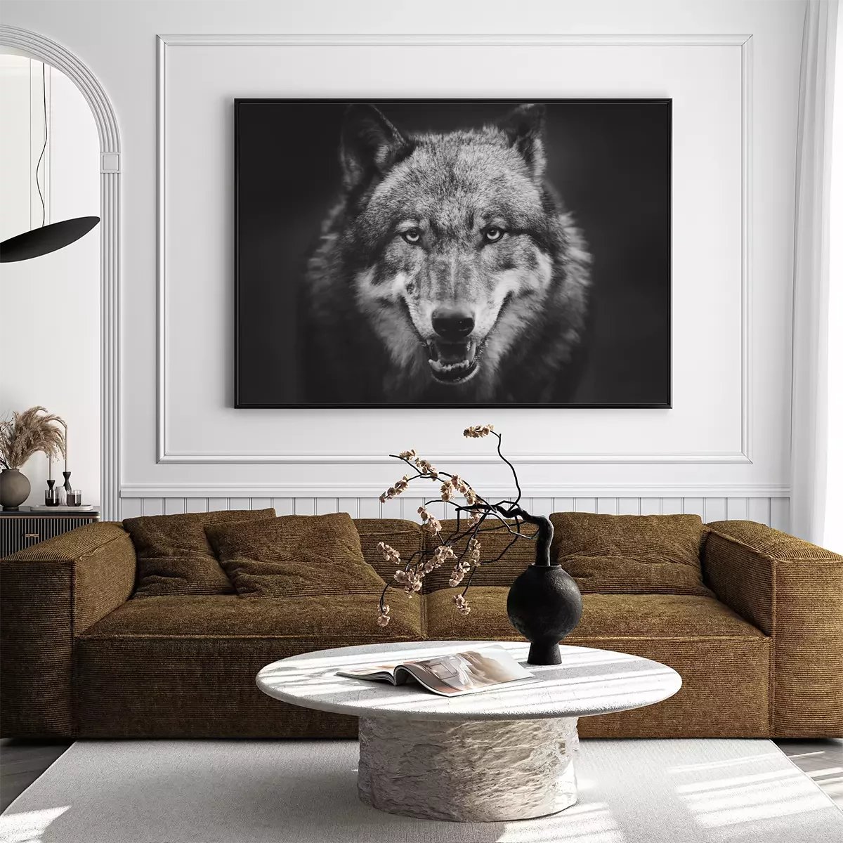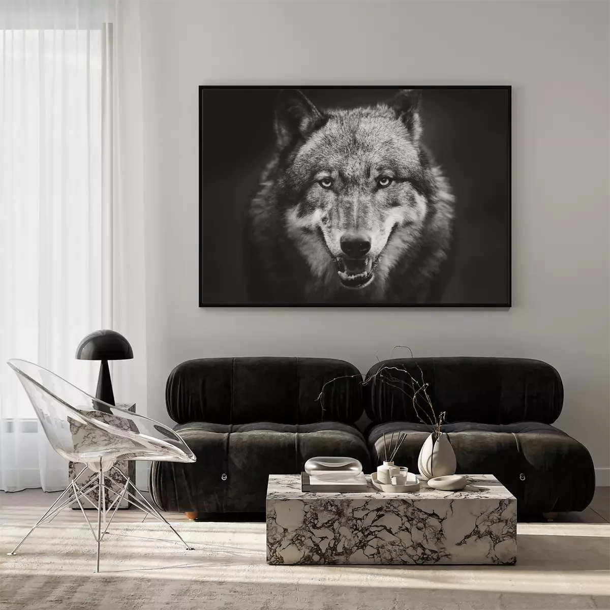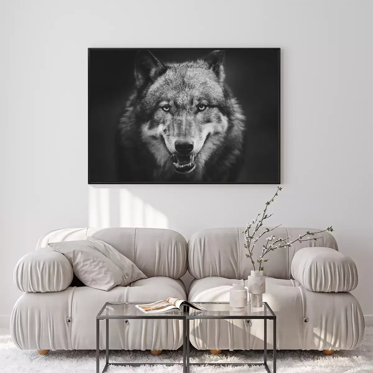 Poster: Grauer Wolf auf dunklem Hintergrund