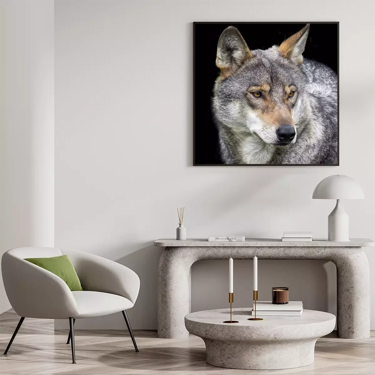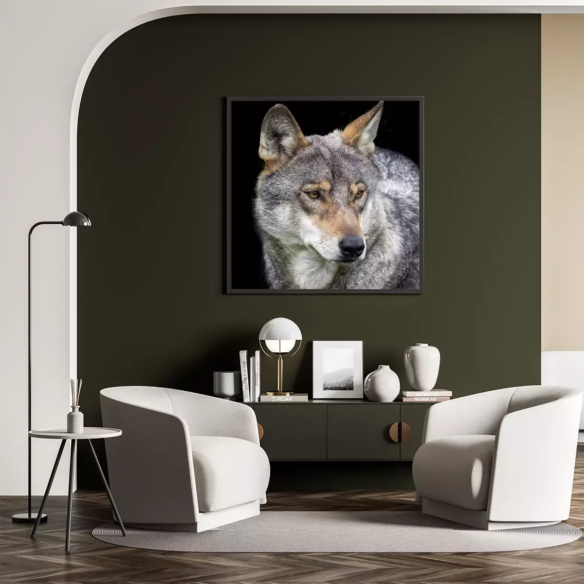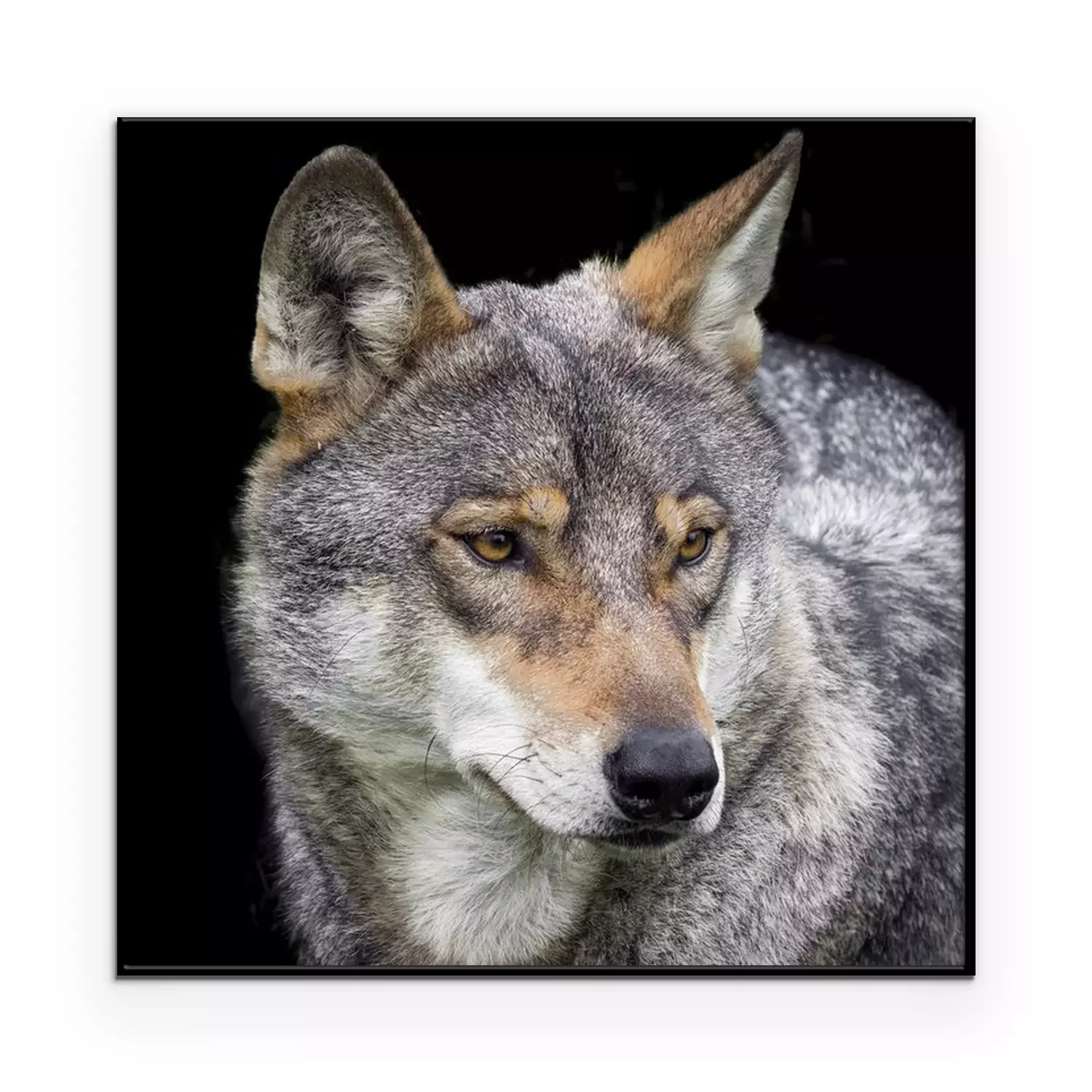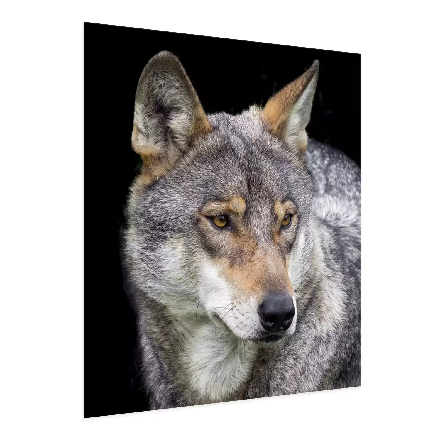Poster: grauer Wolf auf schwarzem Hintergrund