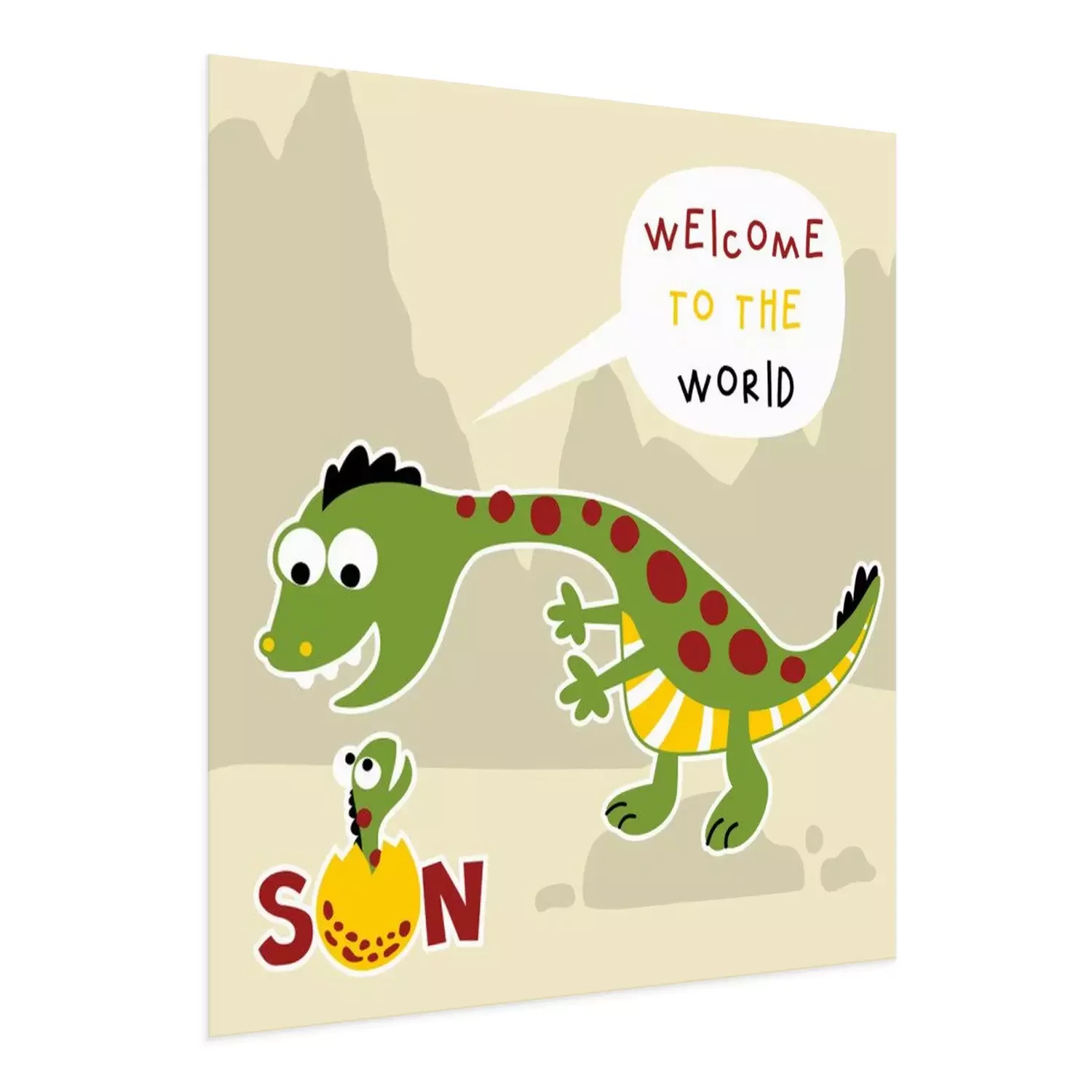 Poster: Großer Dinosaurier, der ein Dinosaurierbaby in der Welt willkommen heißt