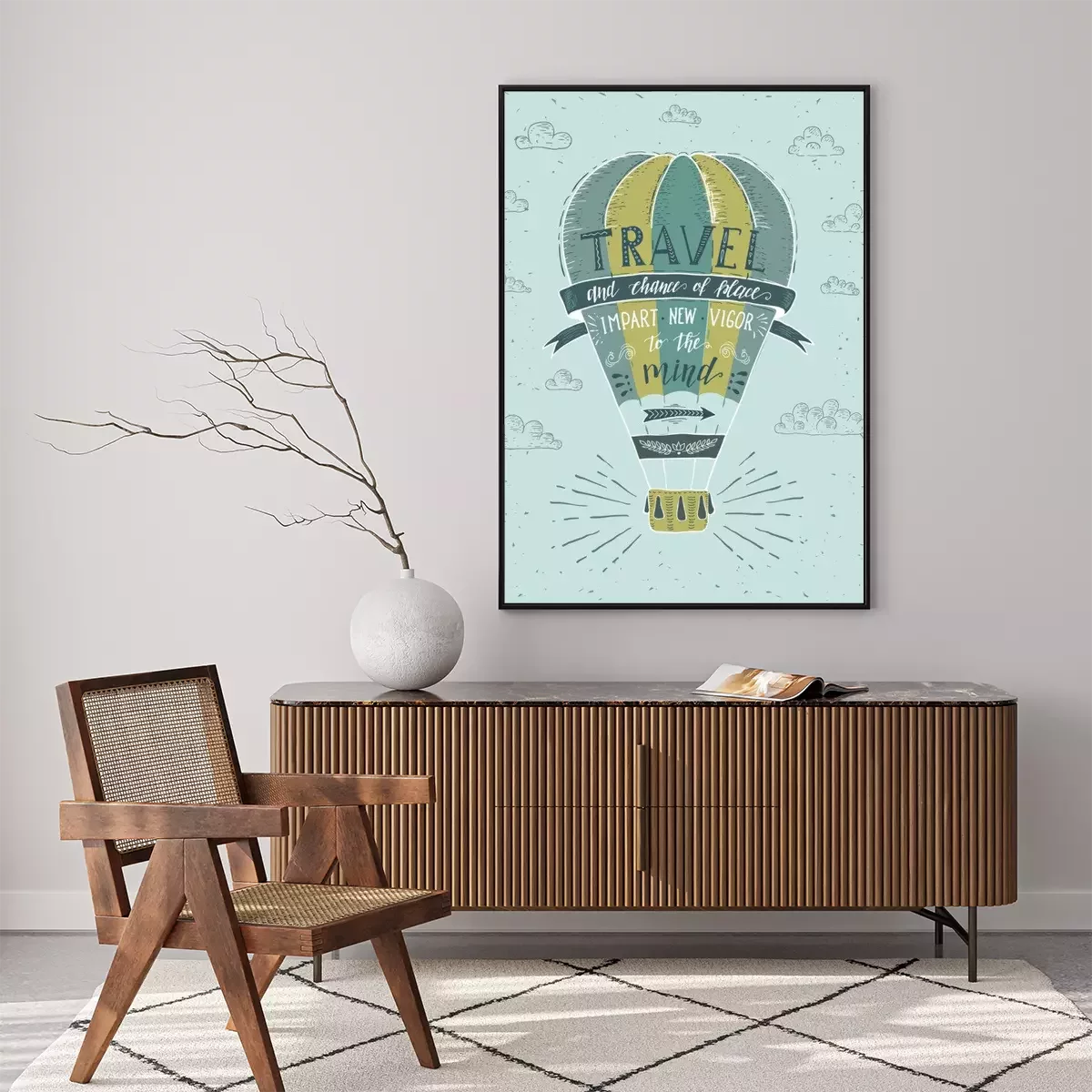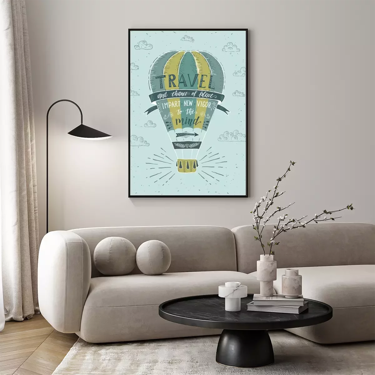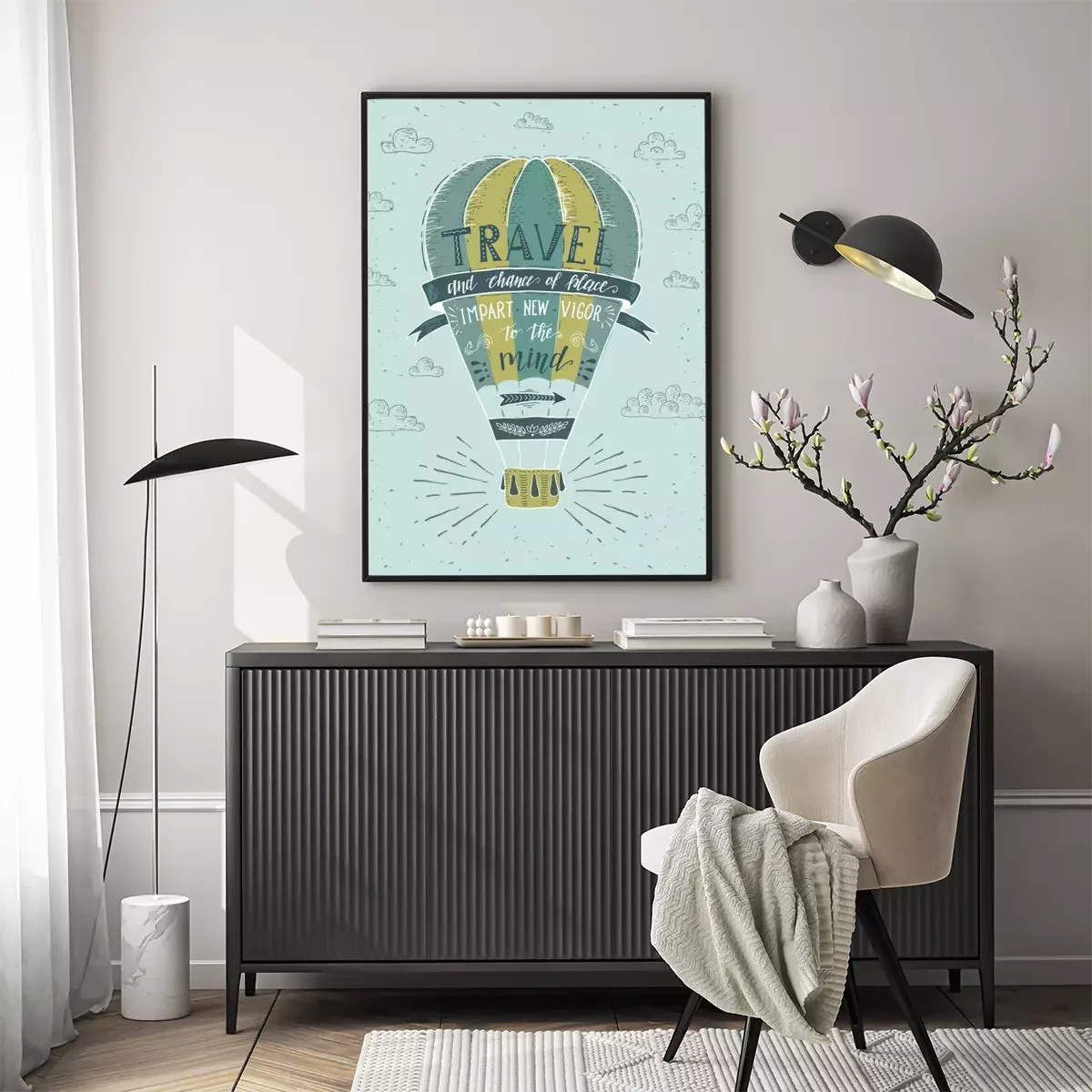 Poster: Grün-gelber Ballon mit Reiseslogan