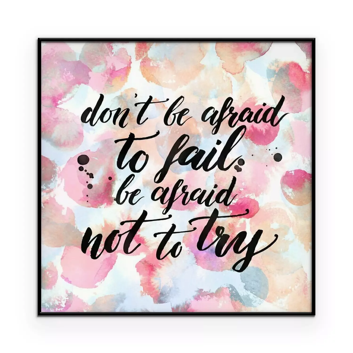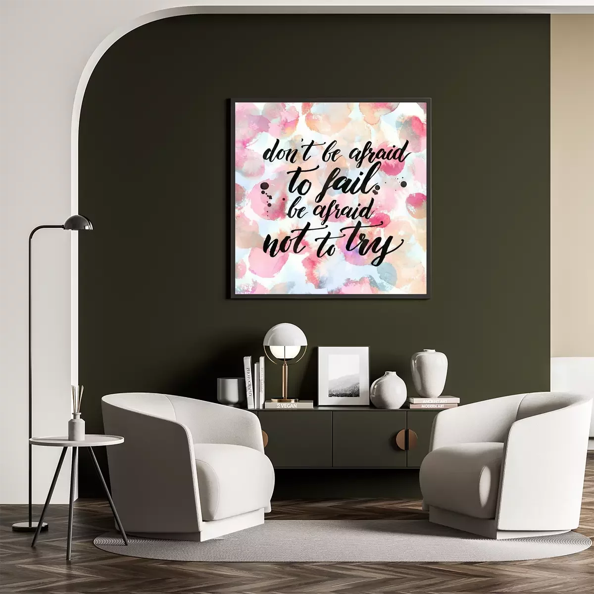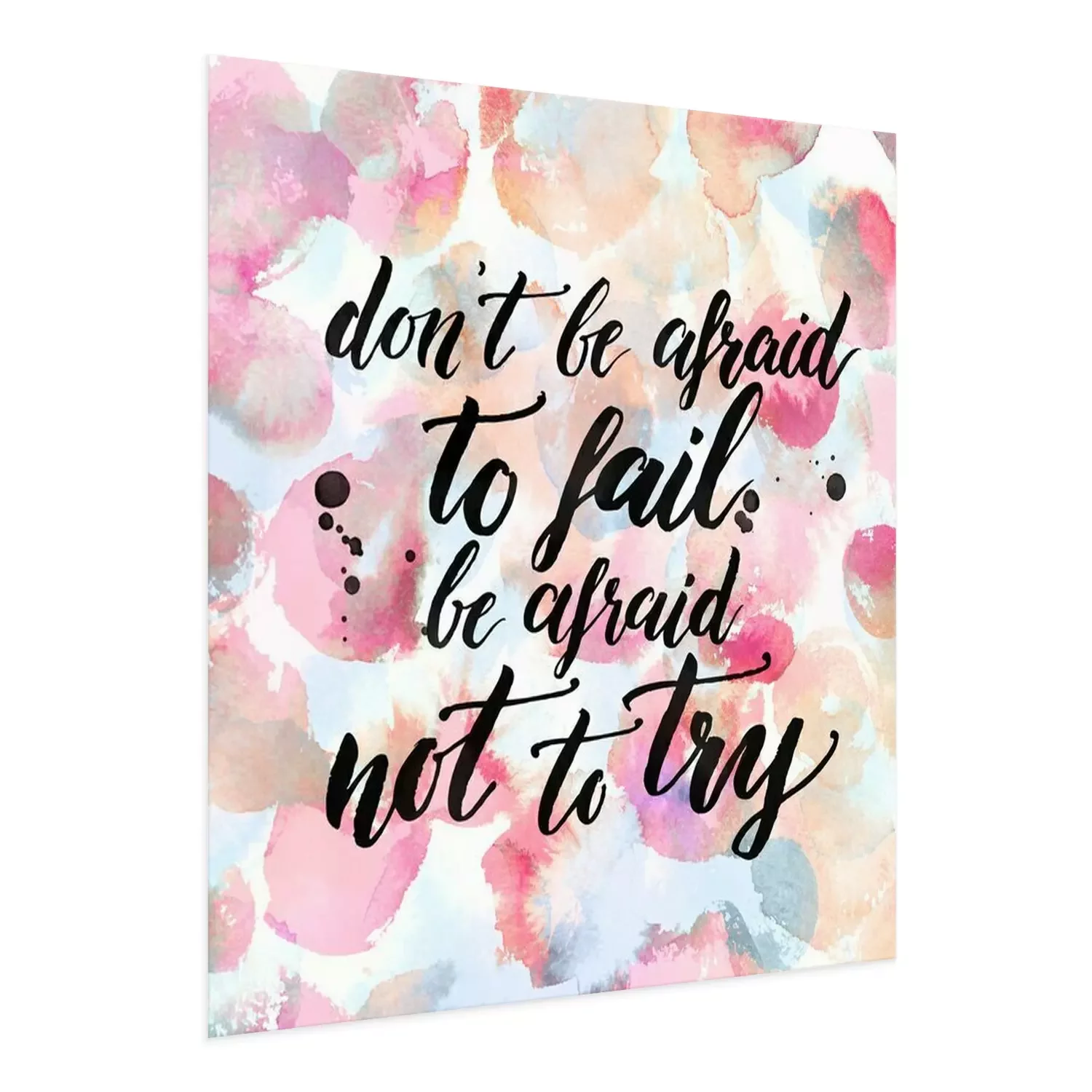 Poster: Haben Sie keine Angst zu scheitern, haben Angst nicht zu versuchen. Inspirationszitat über Leben, Liebe und Herausforderungen. Tinte Kalligraphie an Pastell rosa Aquarell Hintergrund