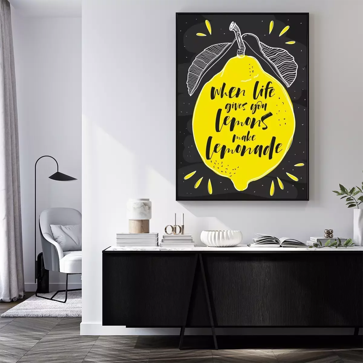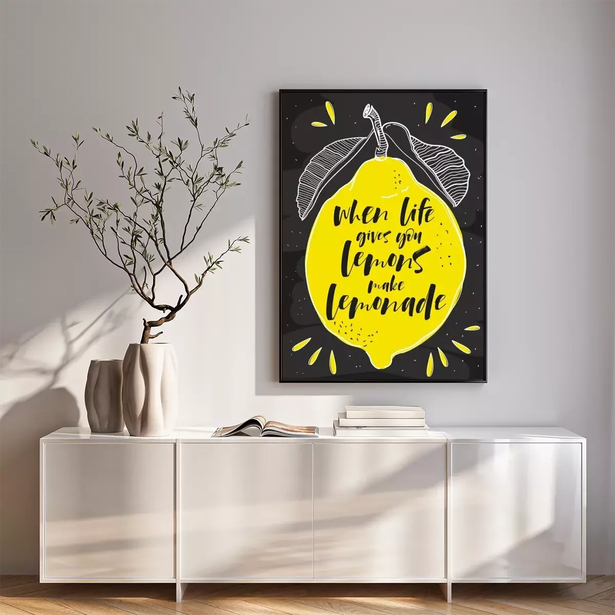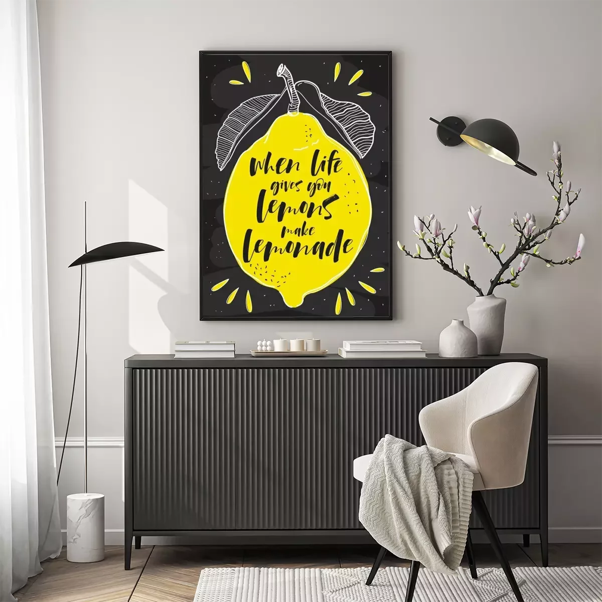 Poster: Hand gezeichnetes Typografieplakat. Zitrone mit Inschrift "Wenn das Leben Ihnen Zitronen macht Limonade".