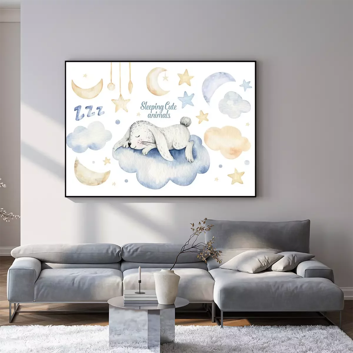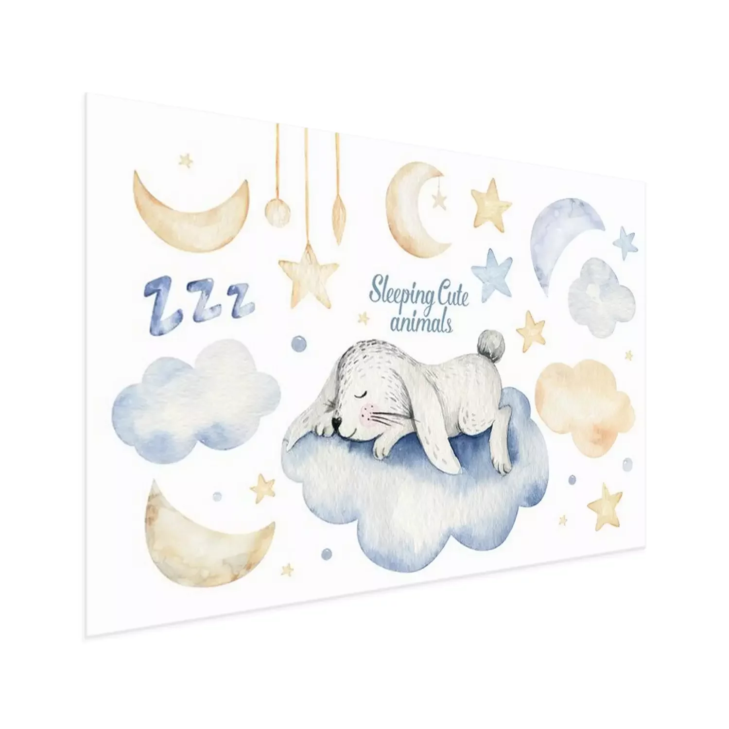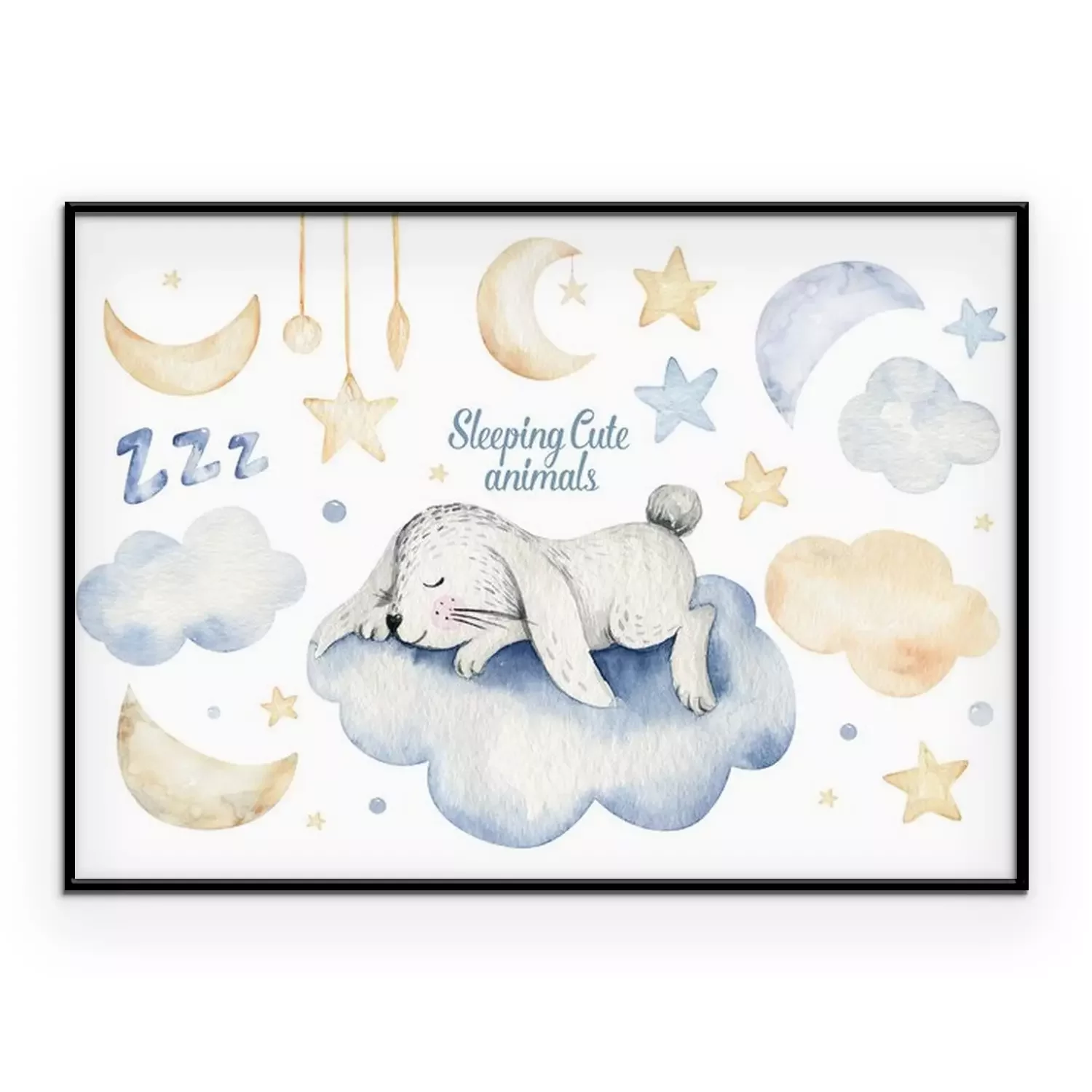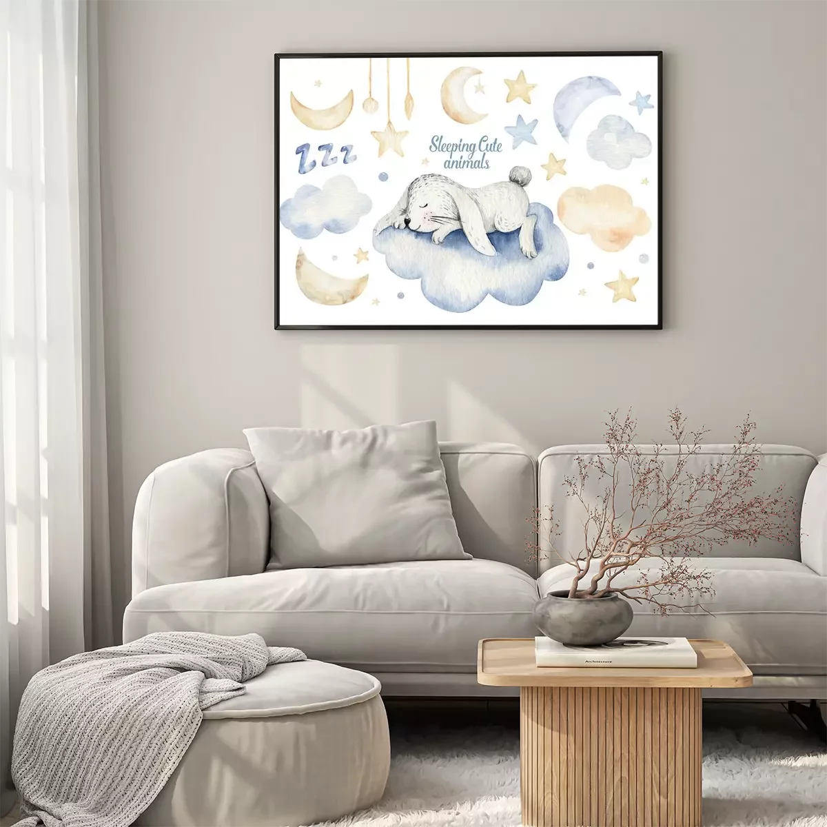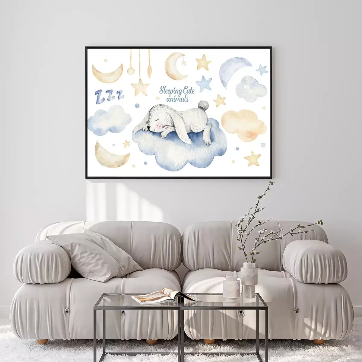 Poster: Hase schläft auf einer Wolke umgeben von Sternen