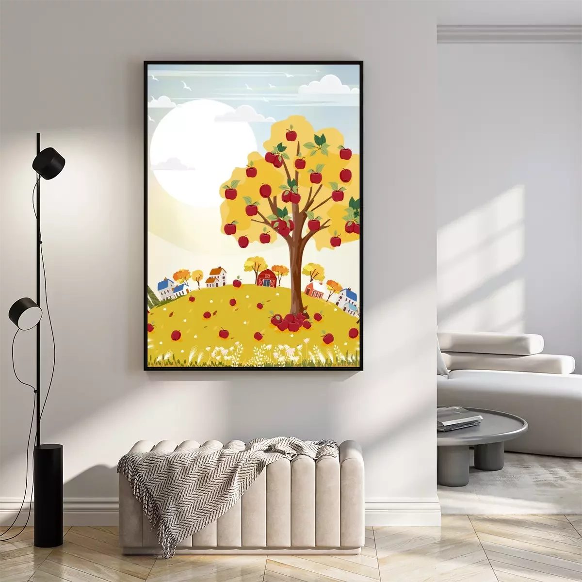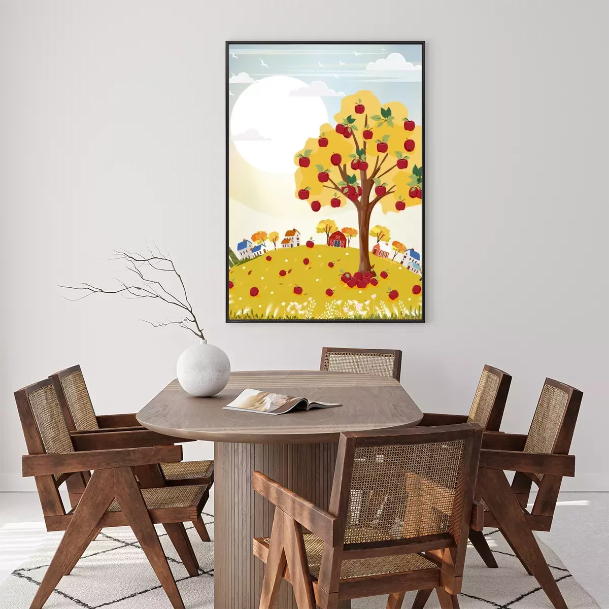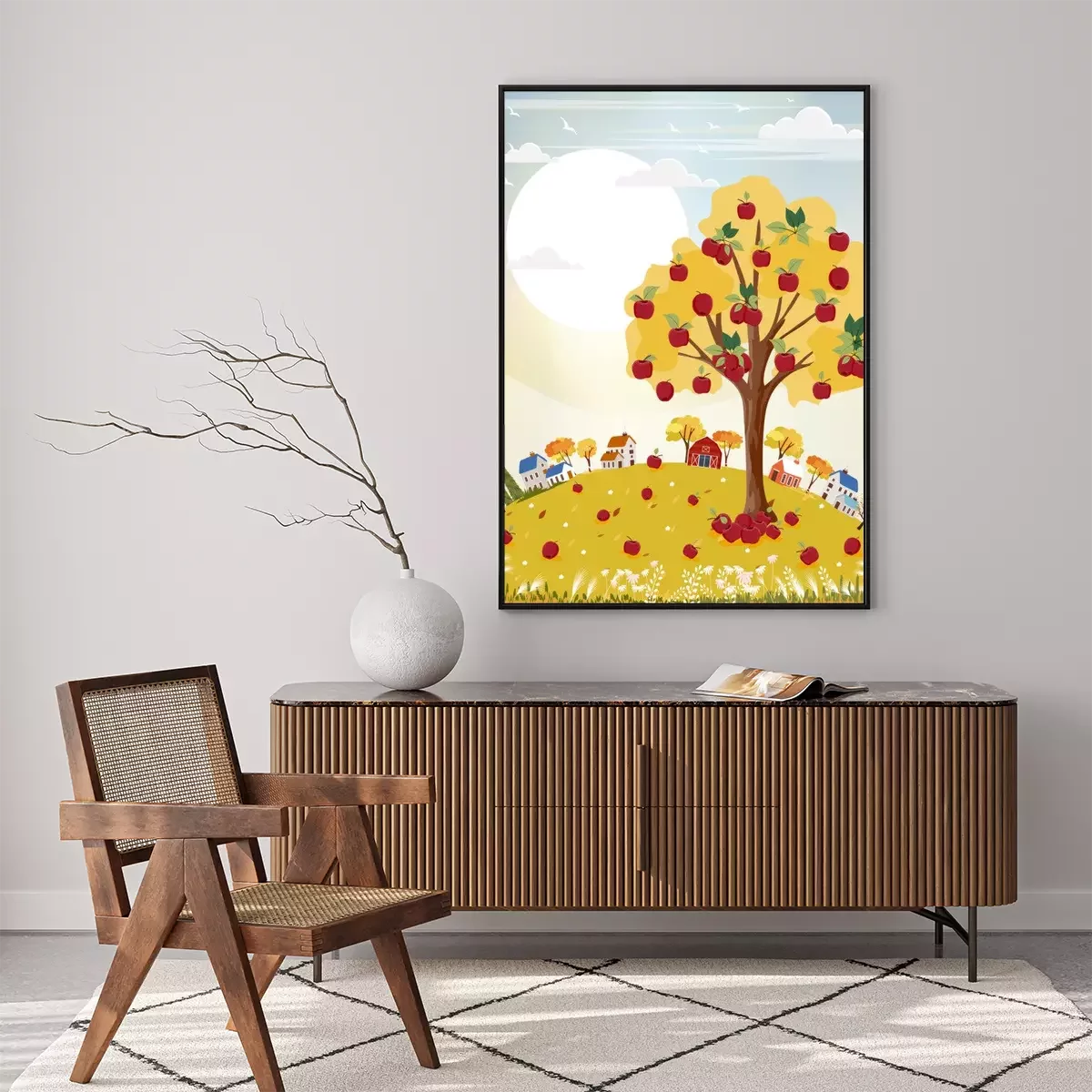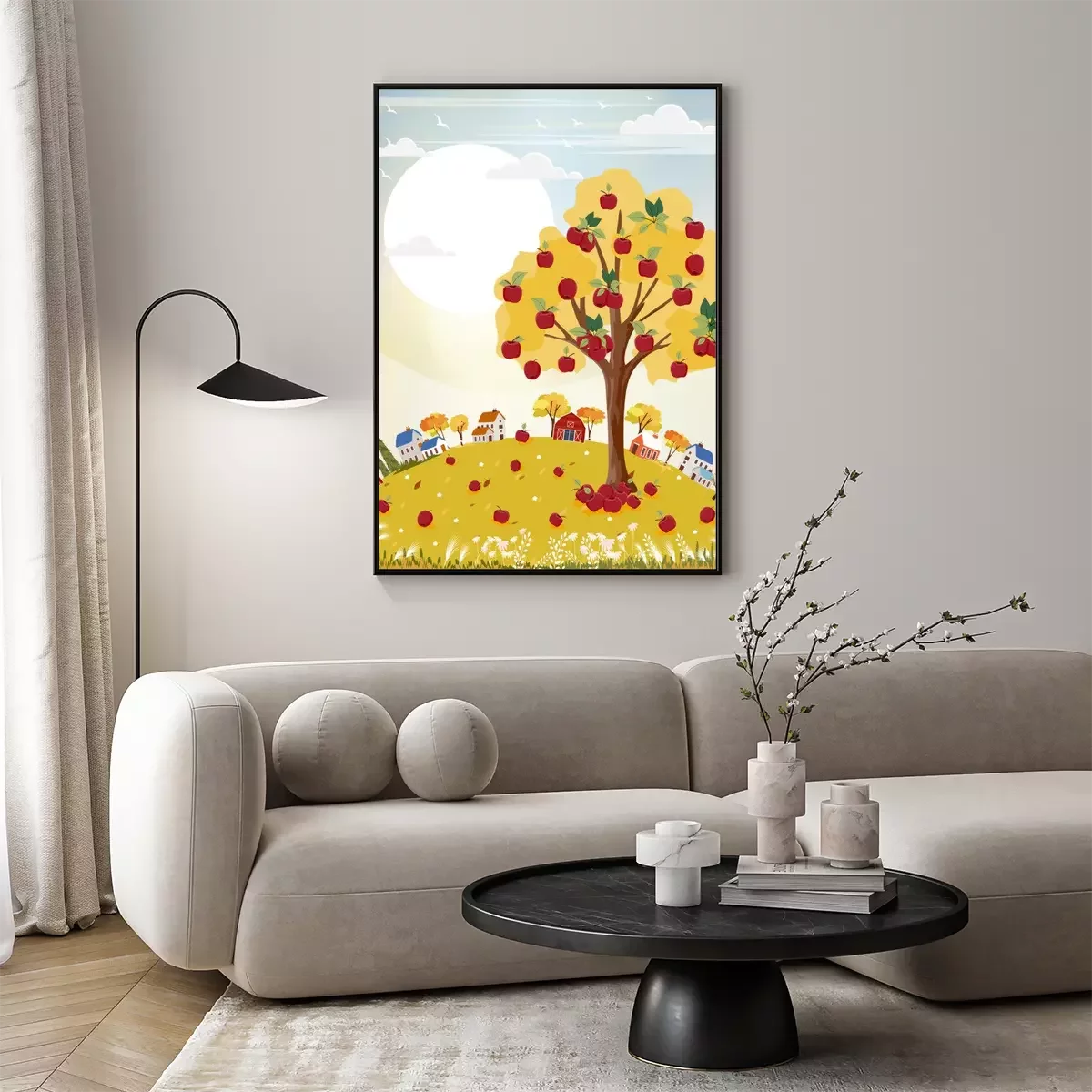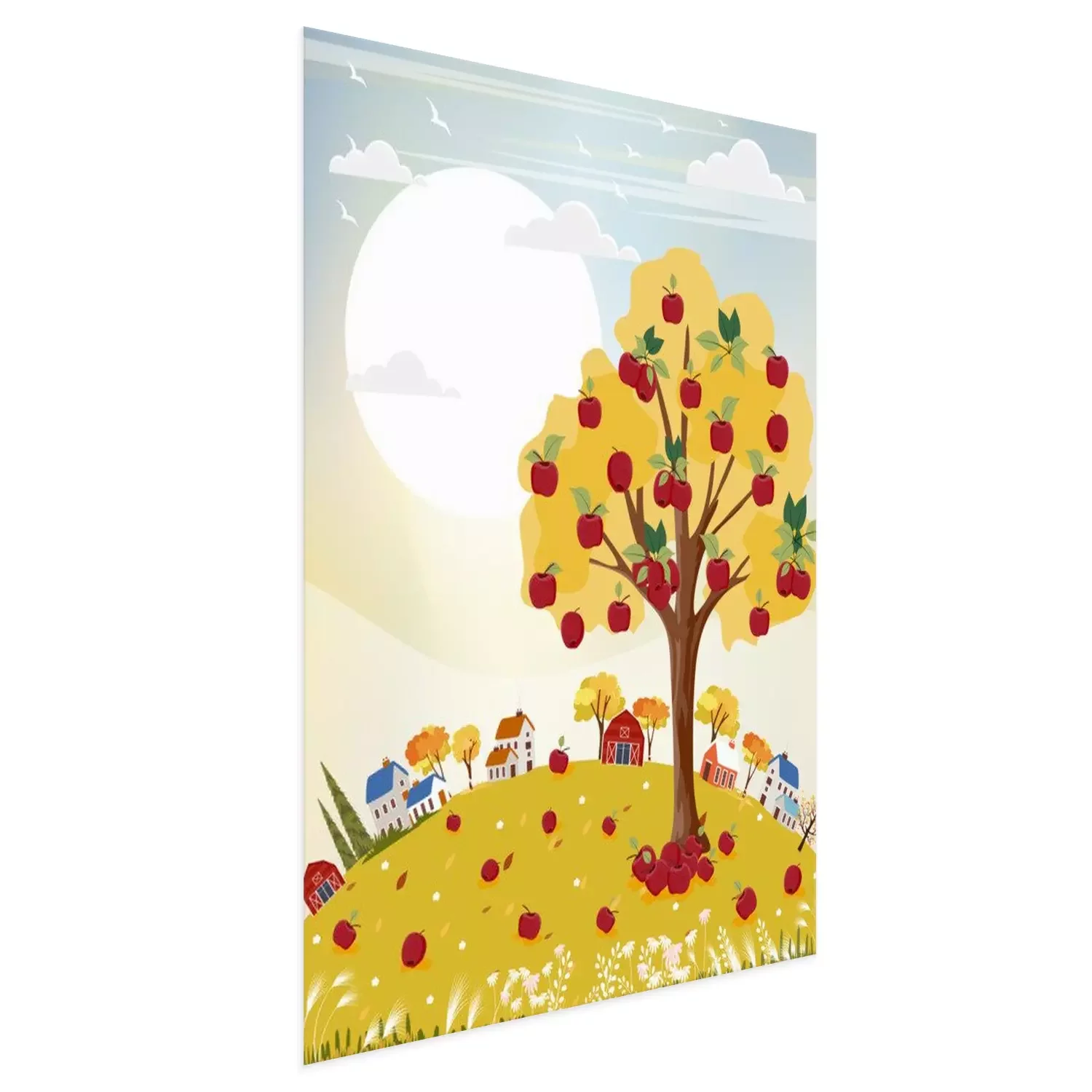Poster Heitere Landschaft mit Apfelbaum und Stadt