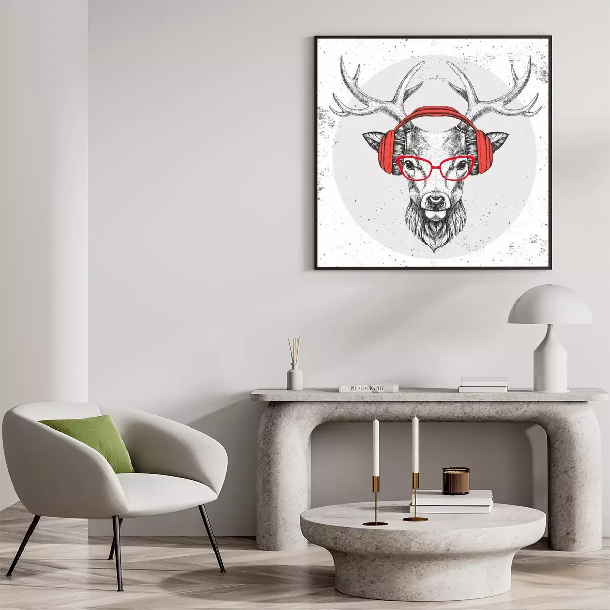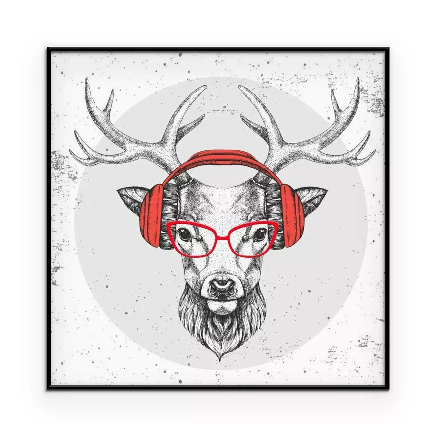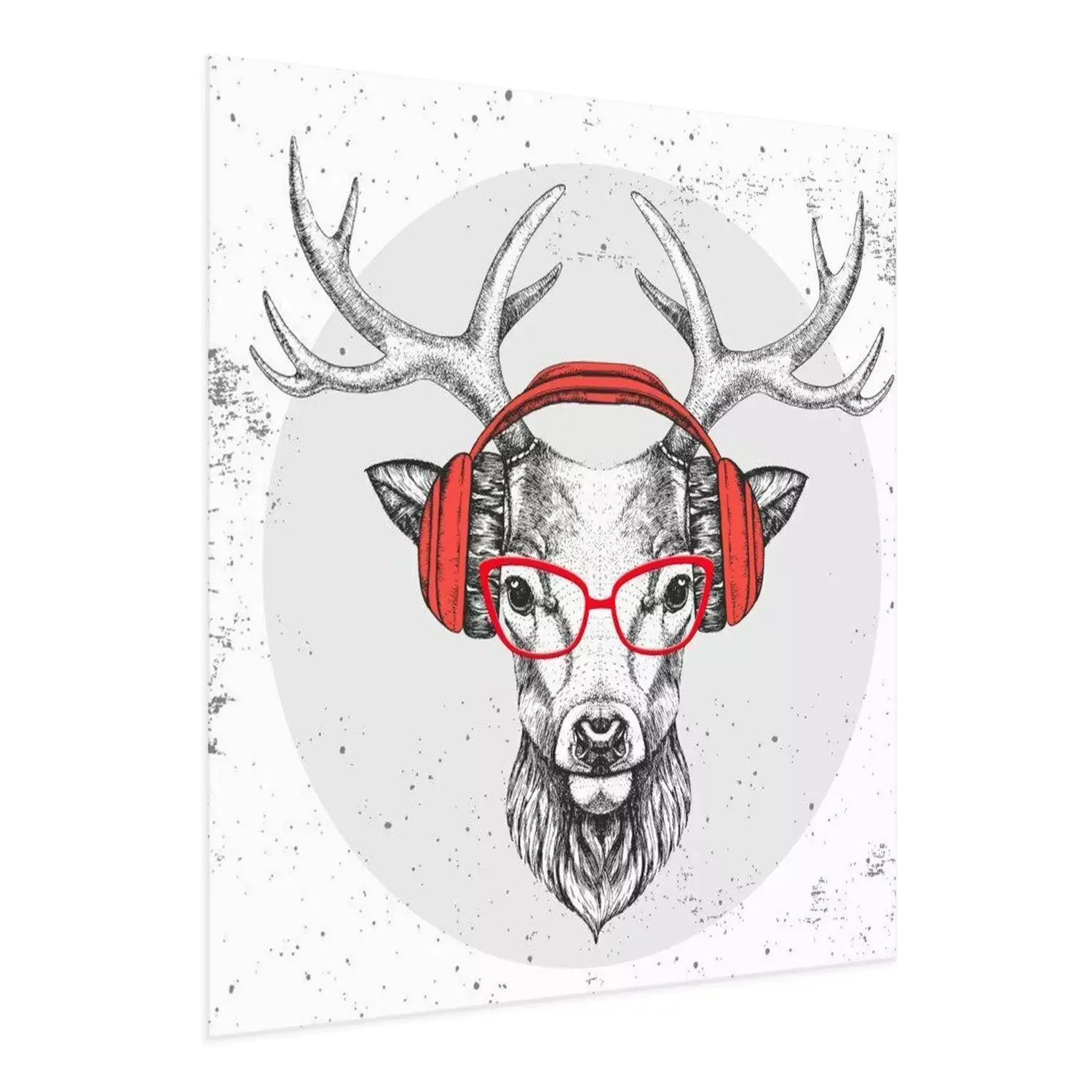 Poster: Hipster animal deer with headphones. Hand drawing Muzzle of animal deer