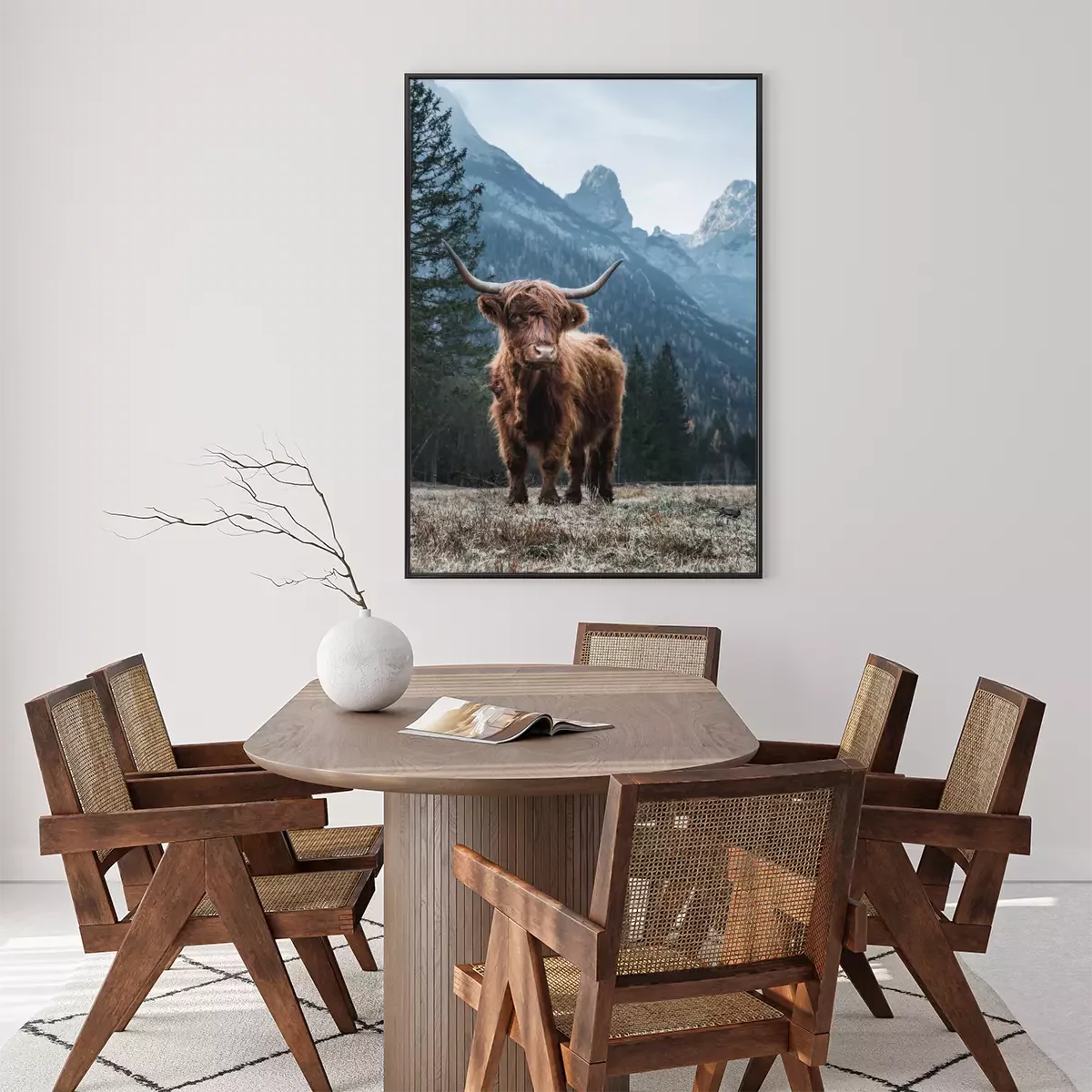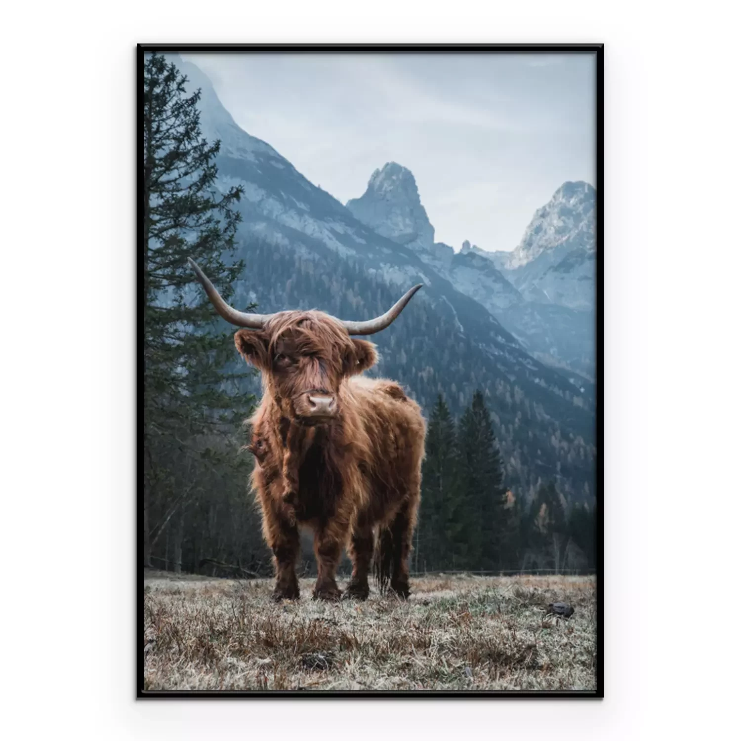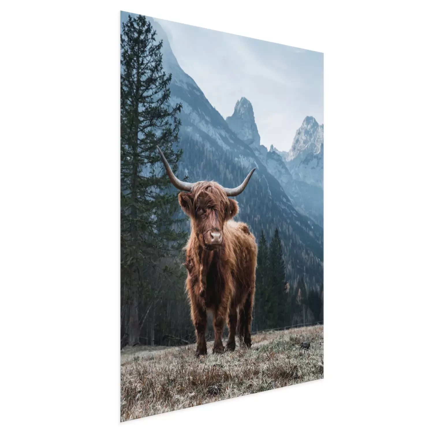 Poster: Hochlandrind vor dem Hintergrund einer schönen Berglandschaft