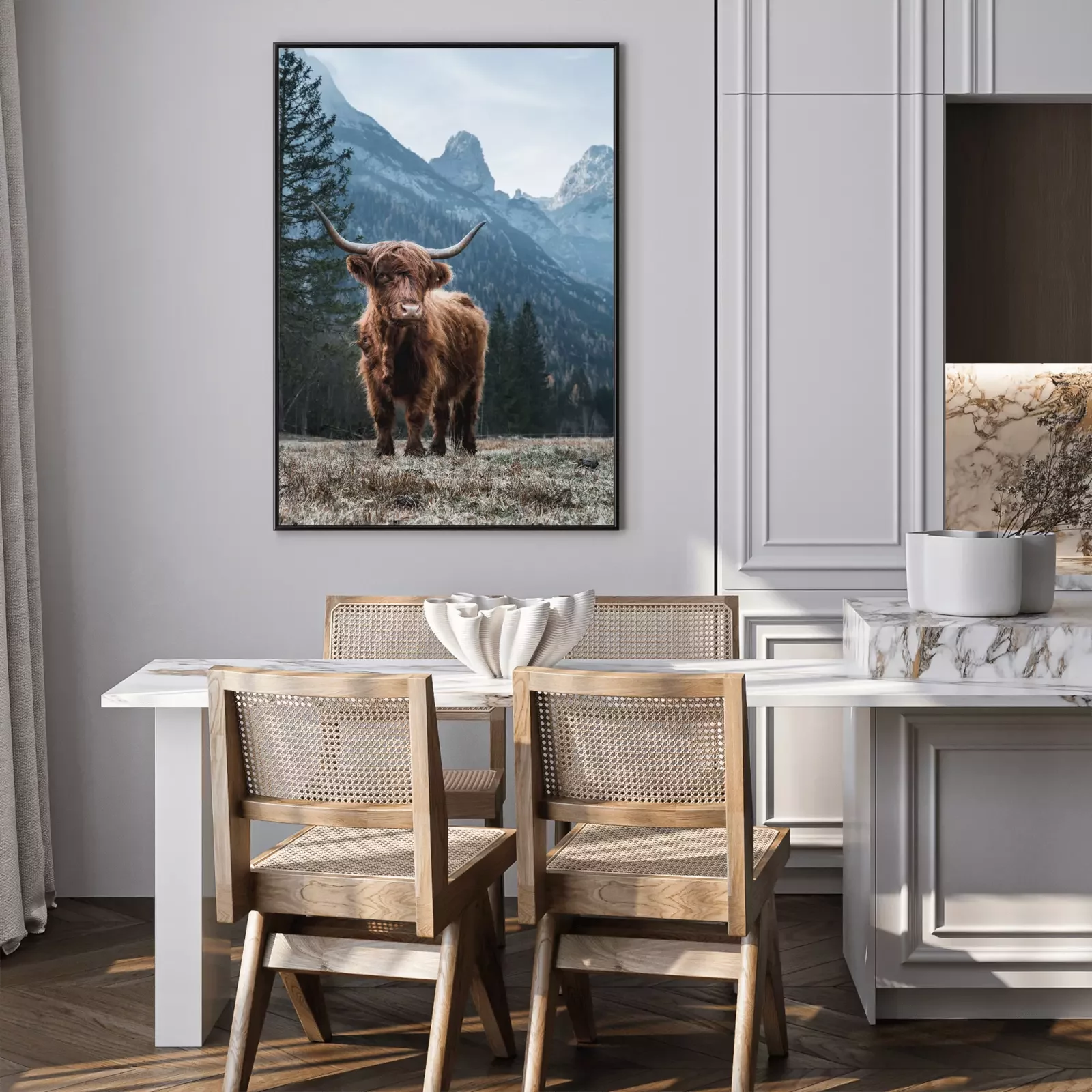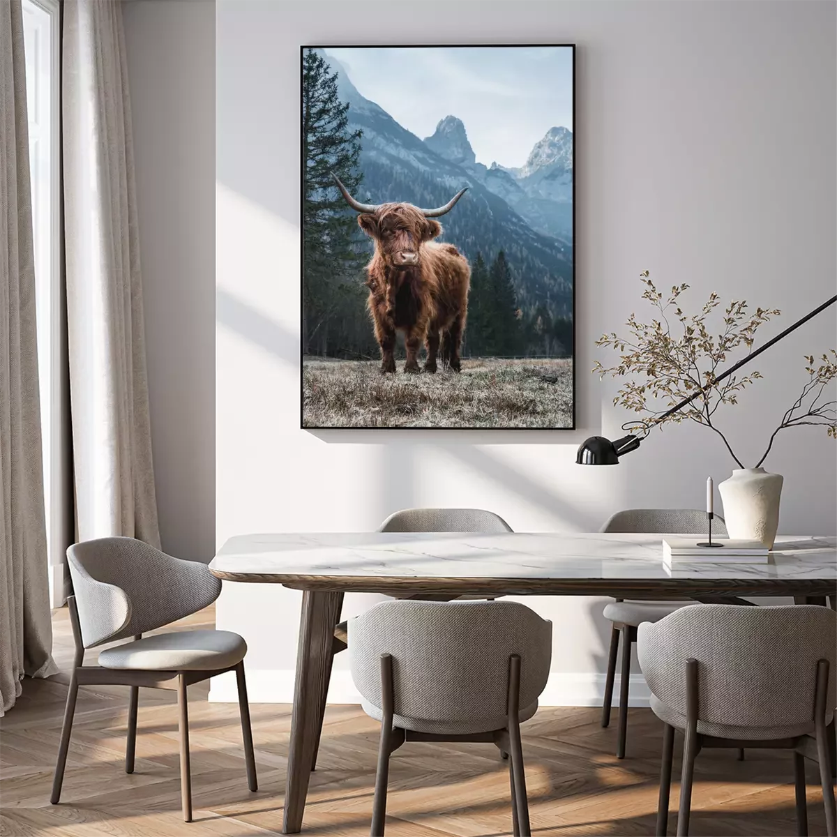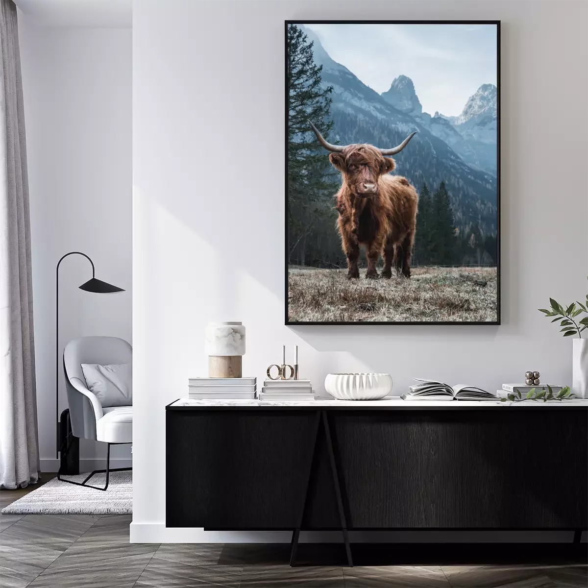 Poster: Hochlandrind vor dem Hintergrund einer schönen Berglandschaft